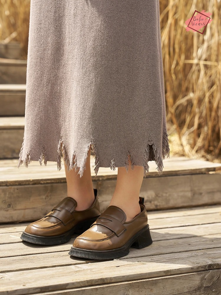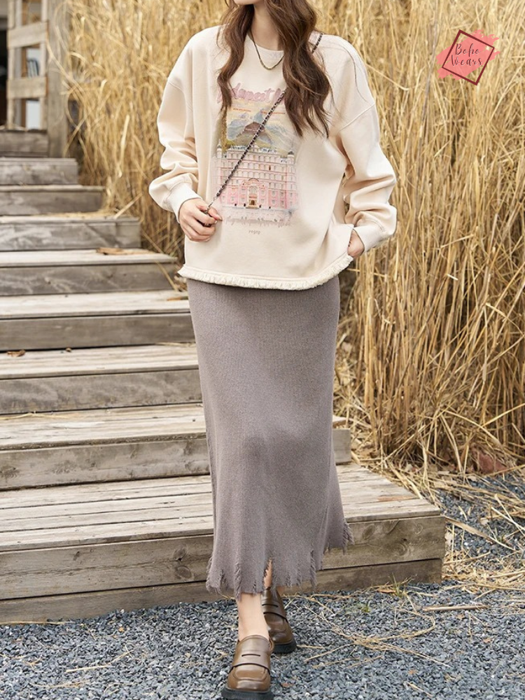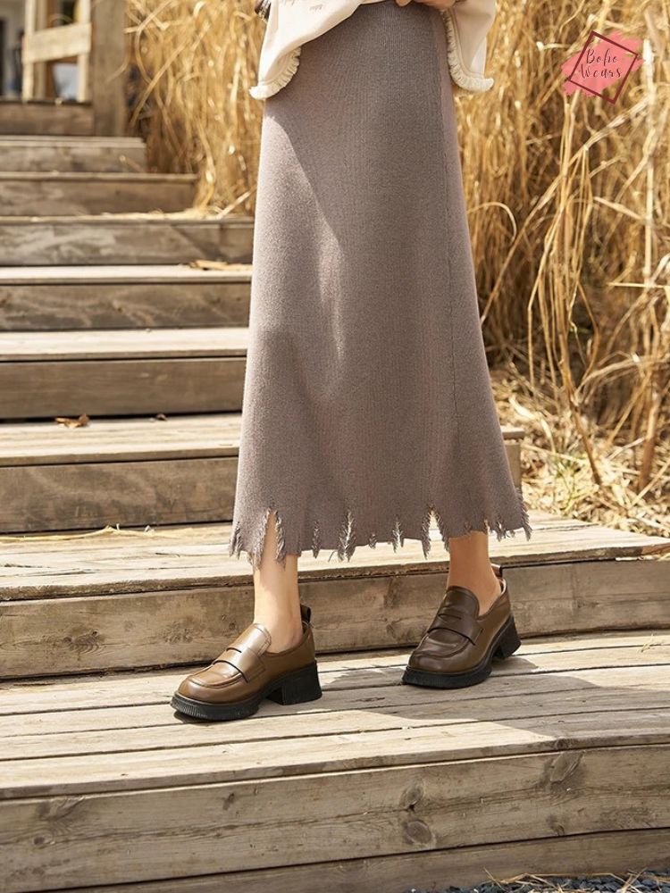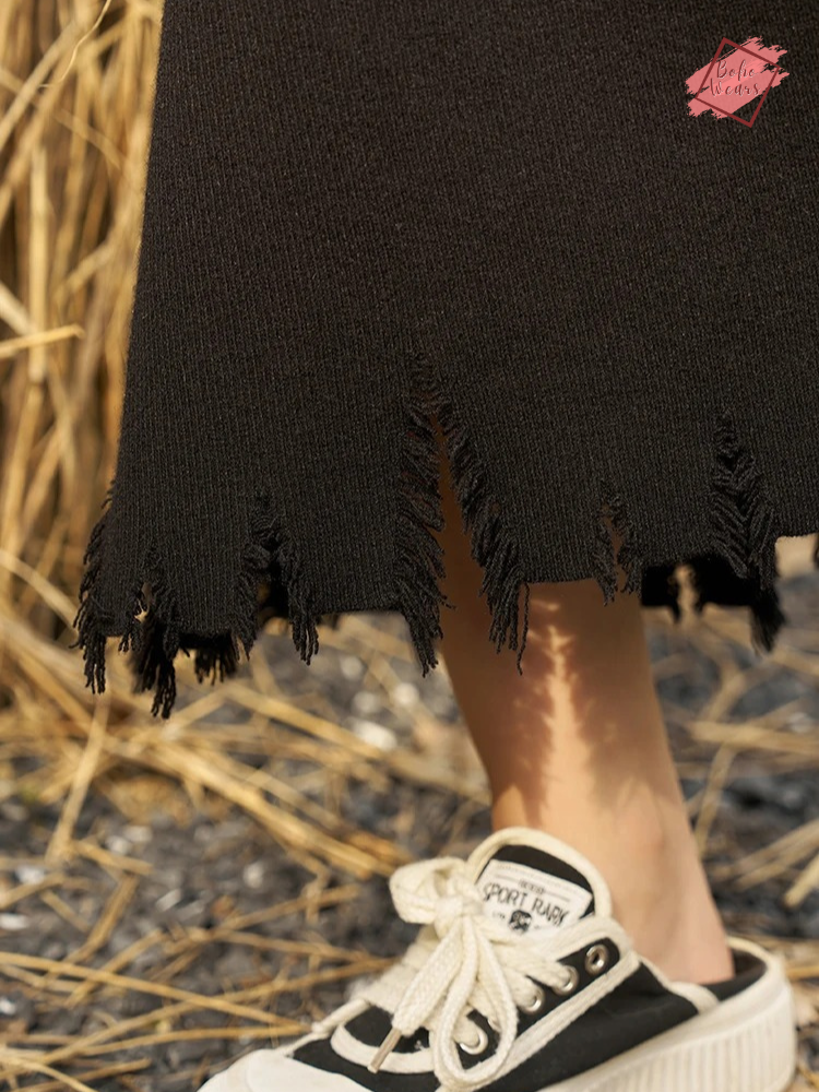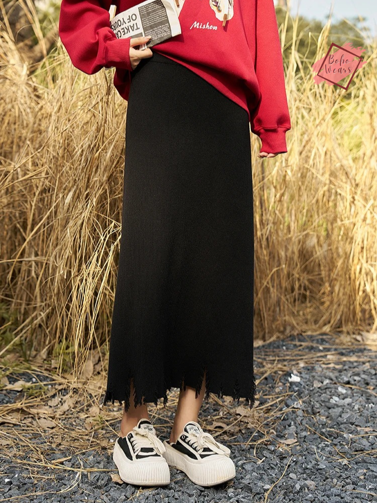 Chic Vintage Elastic Waist Midi Skirt - Women's Knit A-Line with Tassel and Raw Edge