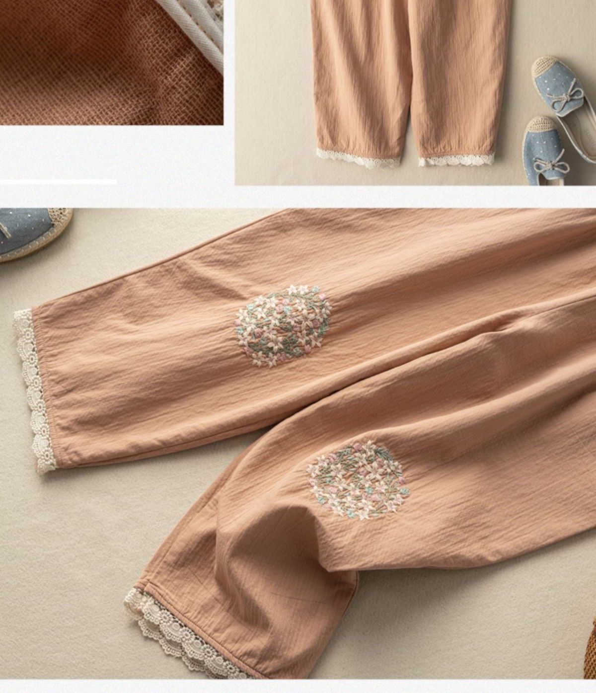 Baumwoll- und Leinen-bestickte Sommer-Retro-Haremshose mit lockerer Spitze