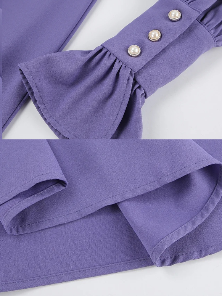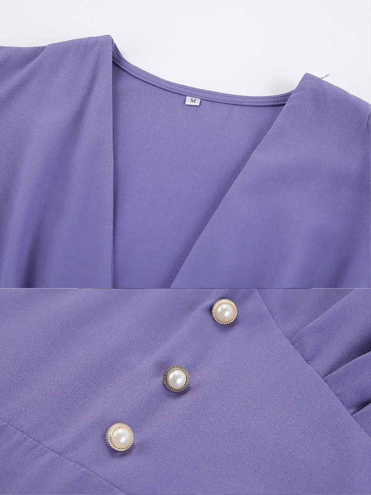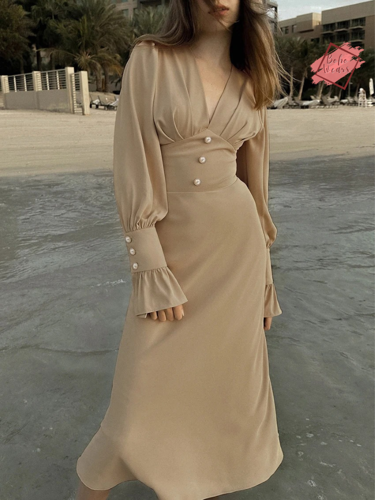 Elegant Women's V-Neck Midi Dress with Lantern Sleeves - Luxury Evening Wear, Ruched with Pearl Buttons for Office Ladies