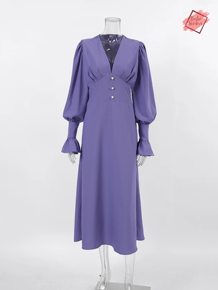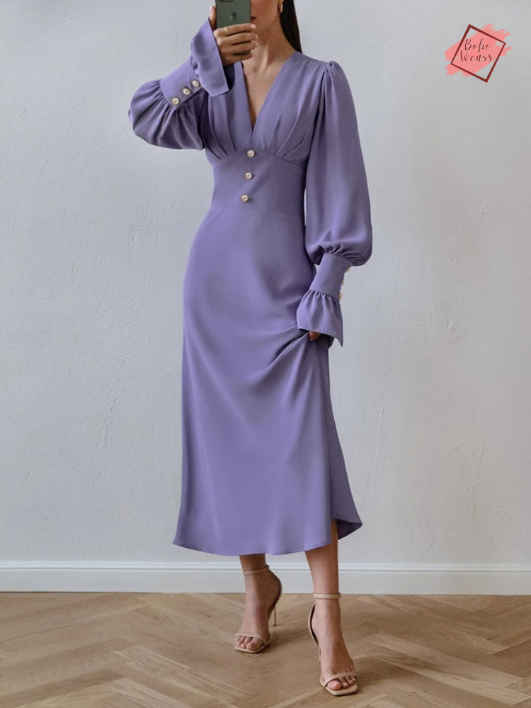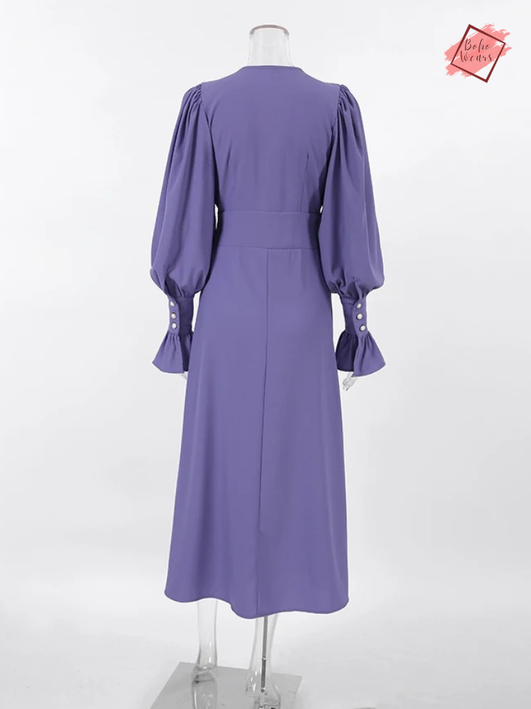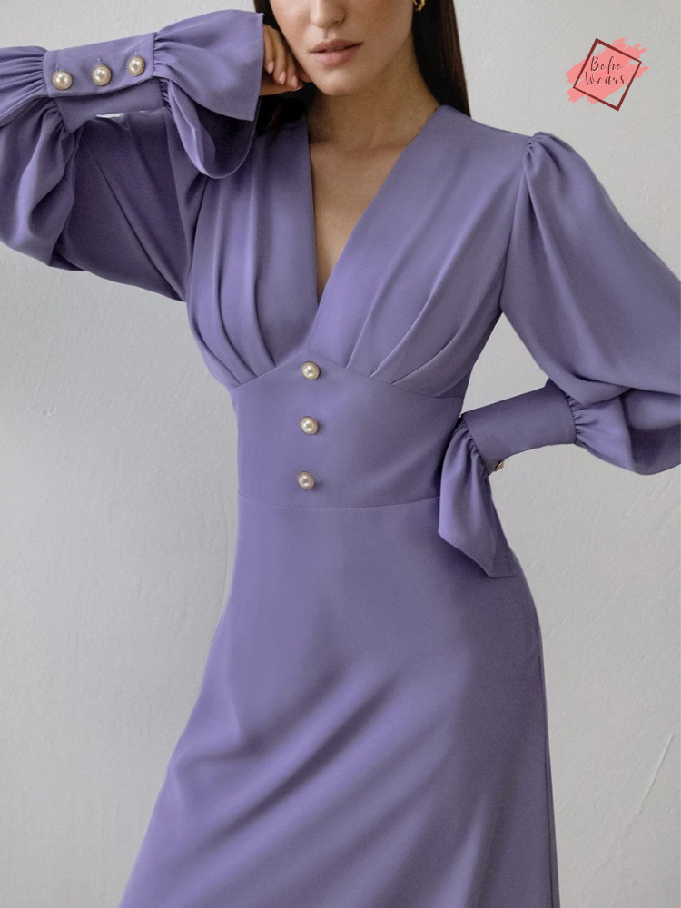 Elegant V-Neck Midi Dress with Lantern Sleeves - Perfect for Office and Evening Wear