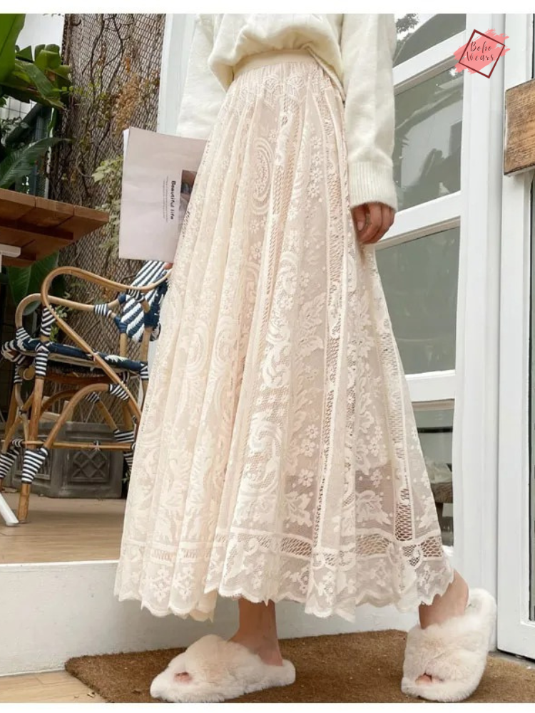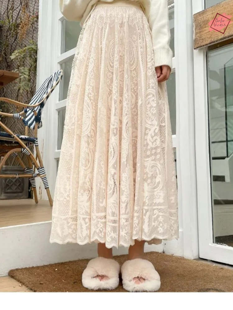 Channel boho goddess vibes in our ethereal crochet lace midi skirt. This vintage-inspired stunner features an empire waistline that flatters your figure and an A-line silhouette that sways elegantly with each step.