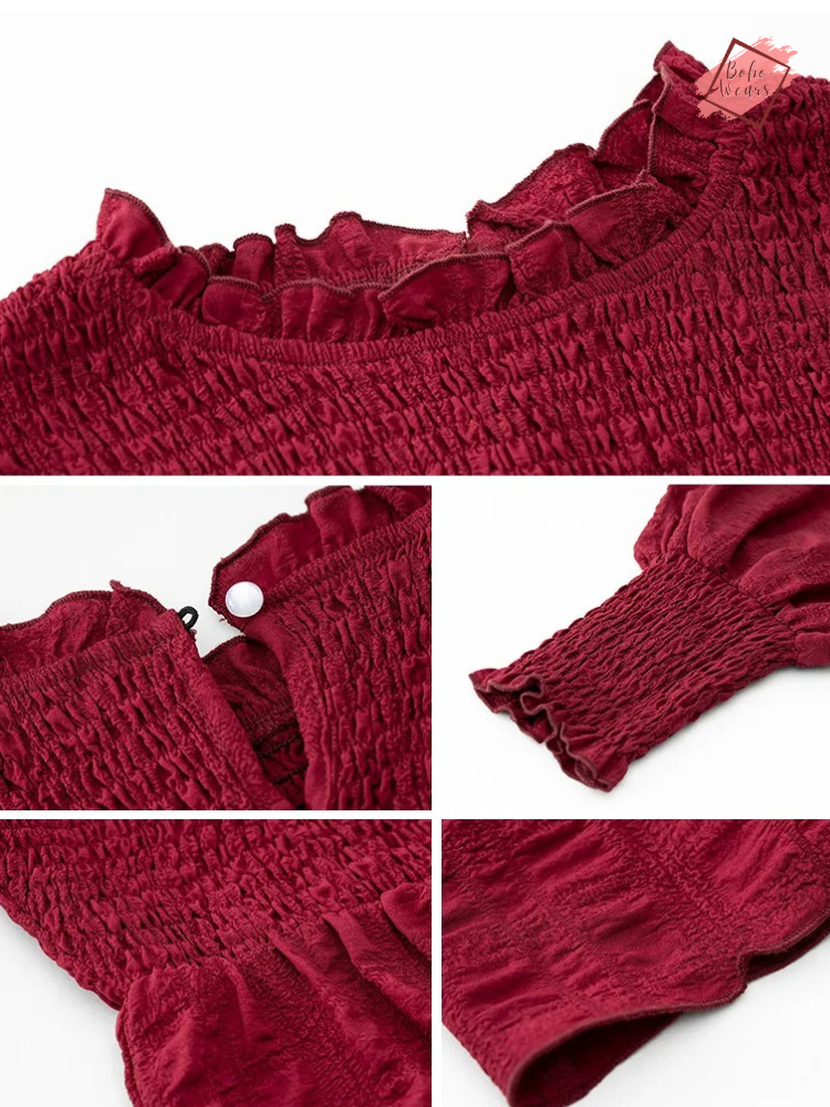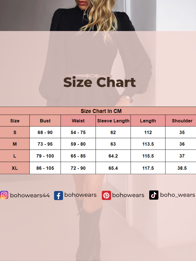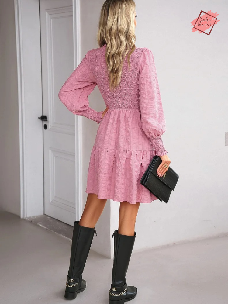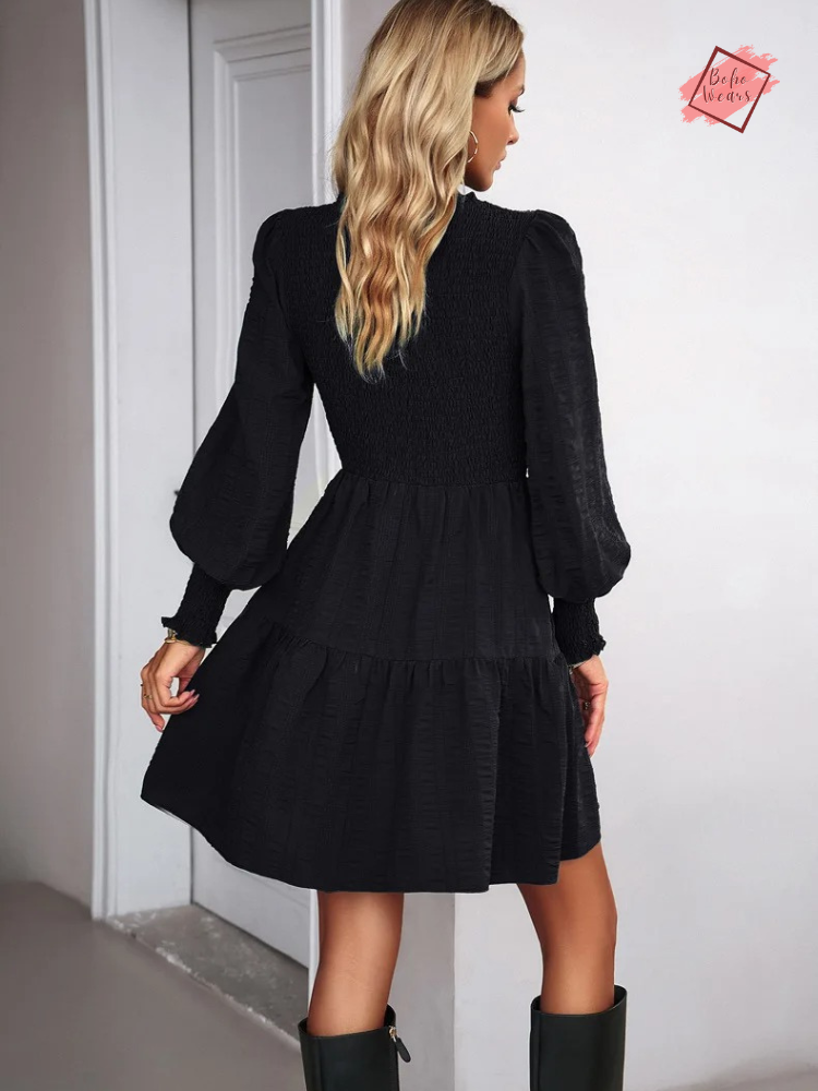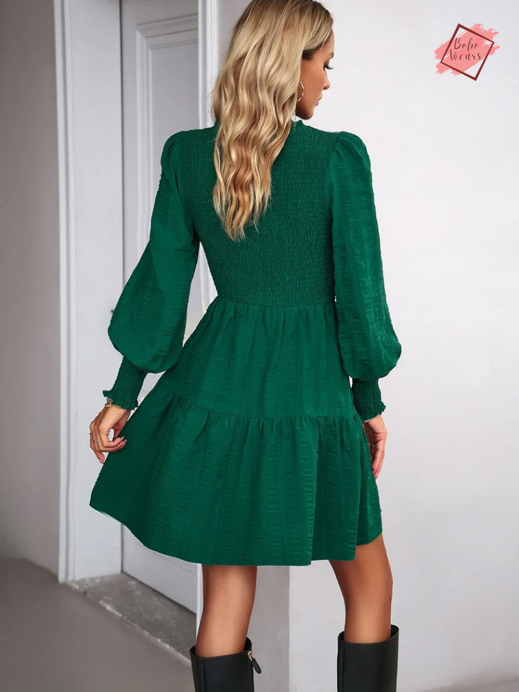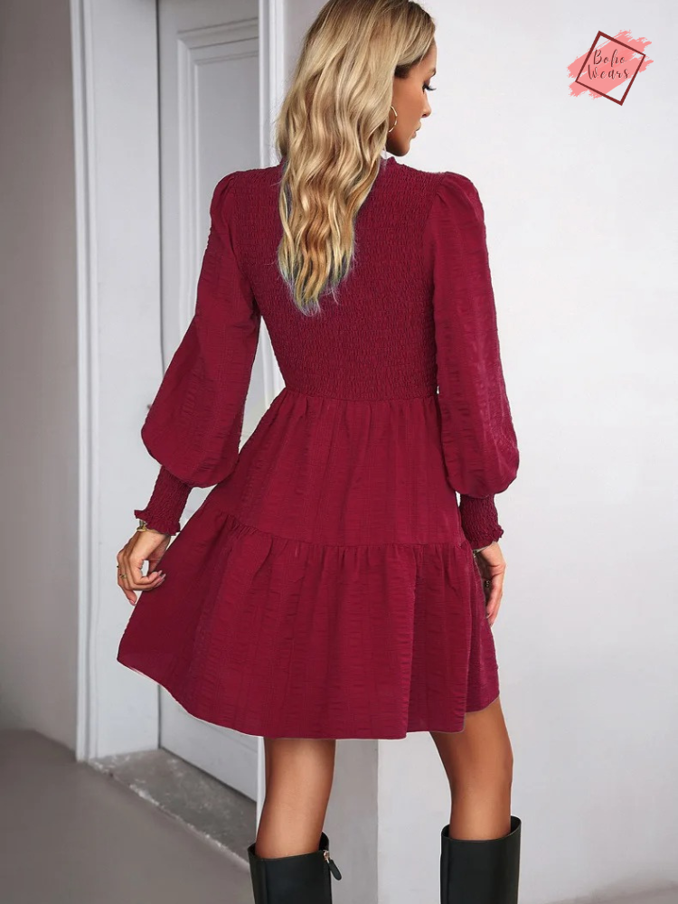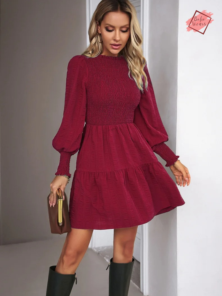 BohoWears Autumn/Winter Casual A-Line Dress - O-Neck, Puff Sleeve, Above Knee with Ruffles for Women