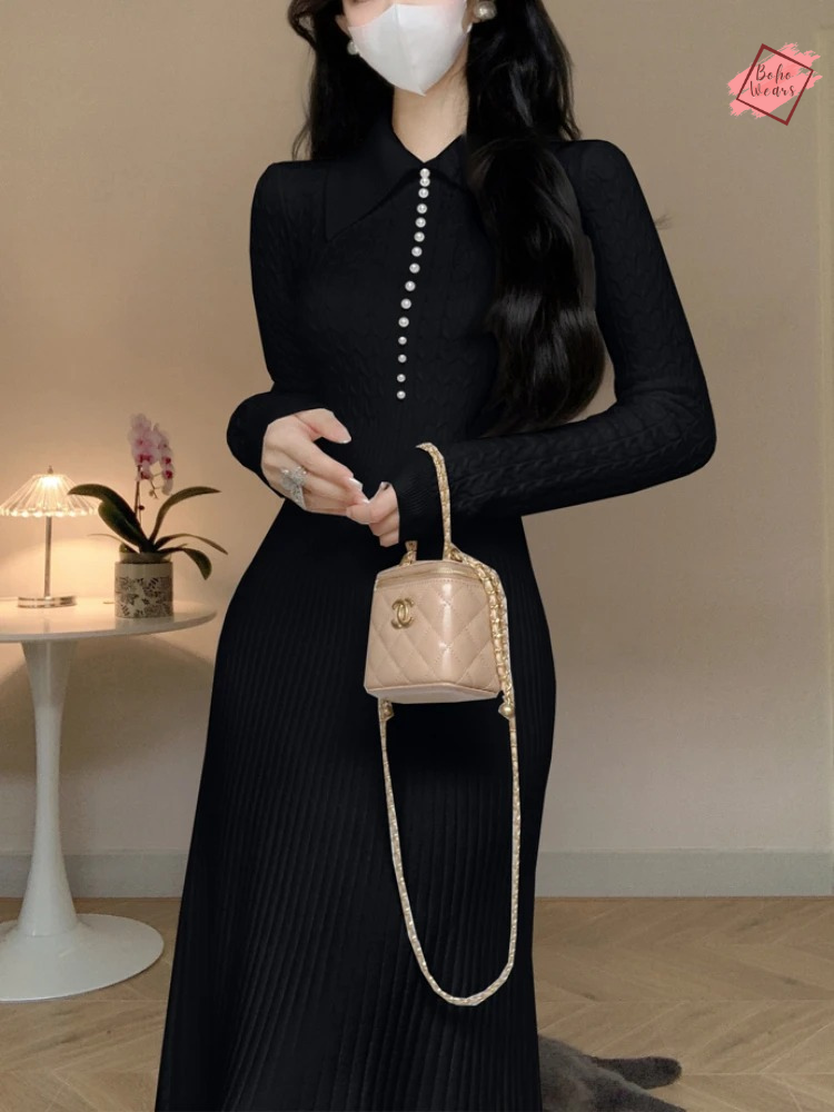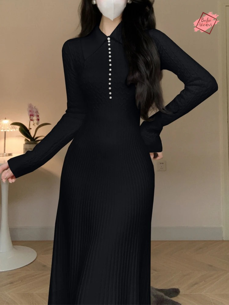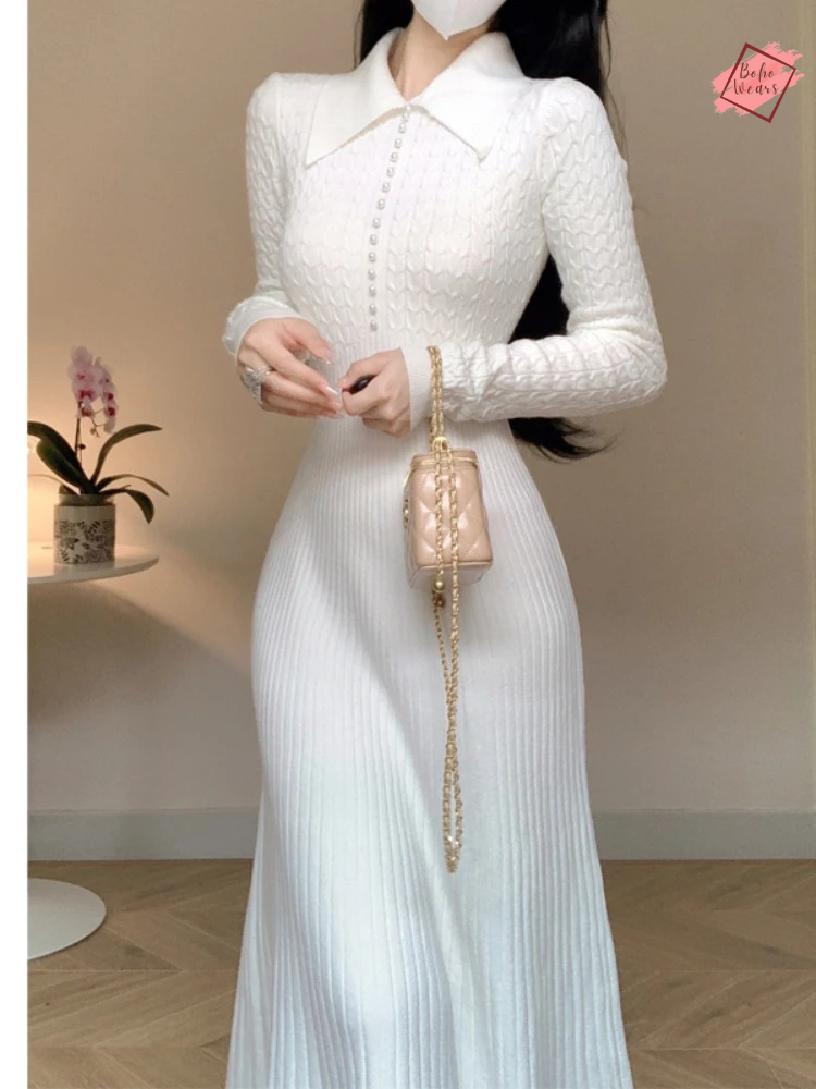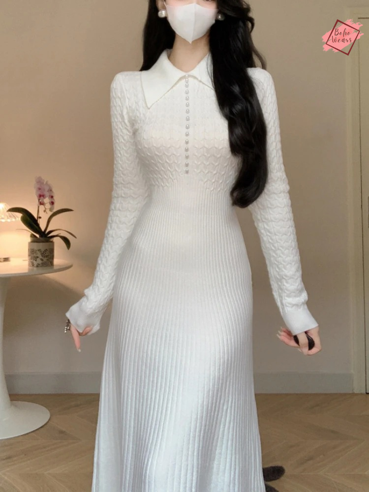 Elevate your autumn and winter wardrobe with this French Knitted A-Line Sweater Dress. Designed with a vintage-inspired aesthetic, this long sleeve dress features a stylish lapel and a slim fit to flatter your silhouette. The soft, knitted material ensures warmth and comfort during the cooler months, while the sweet A-line design adds a feminine touch.