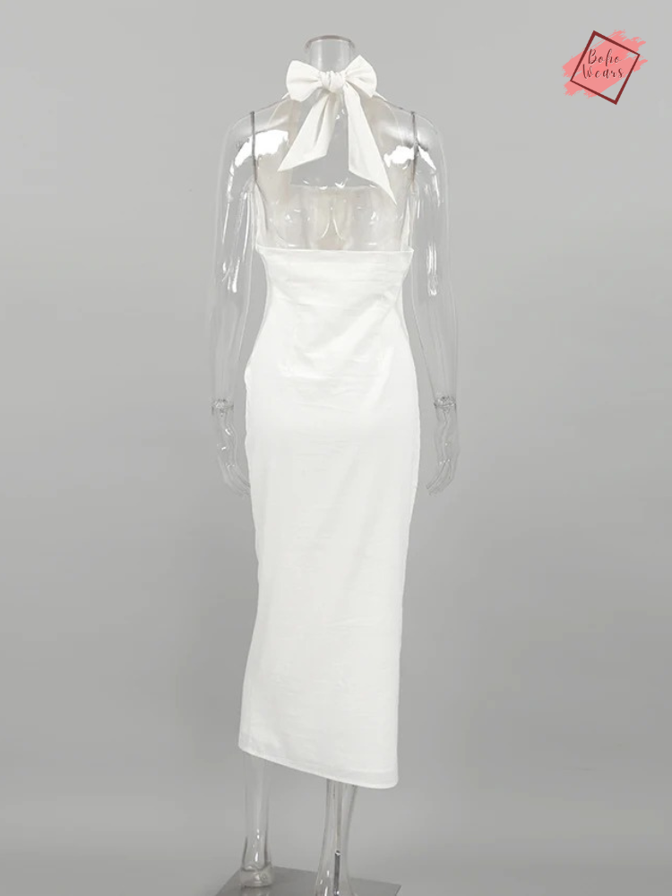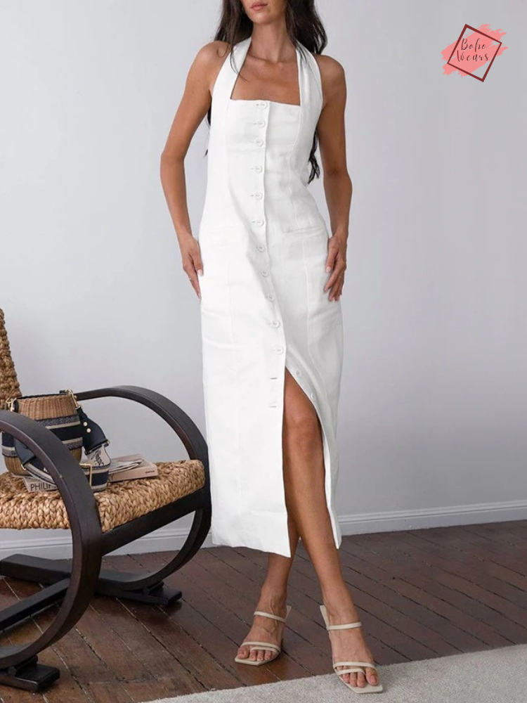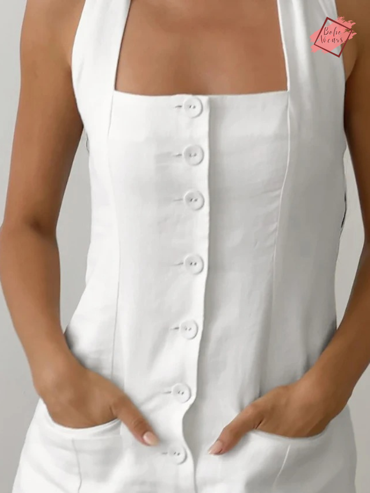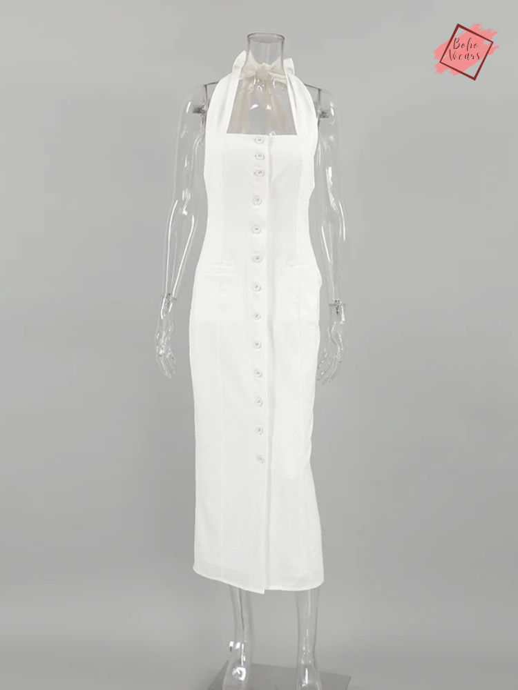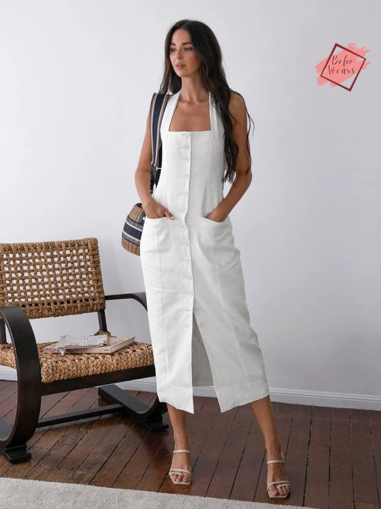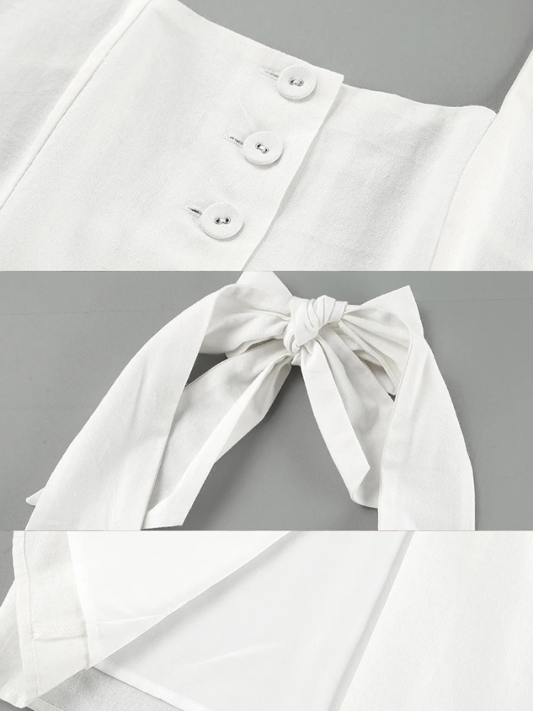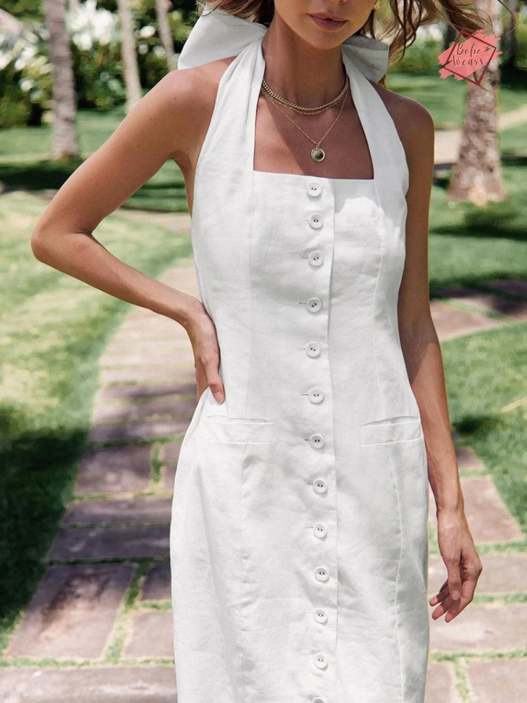 Elegant White Cotton Summer Dress for Women - Slim Straight Style with Lace-Up, Pockets, and Button Details