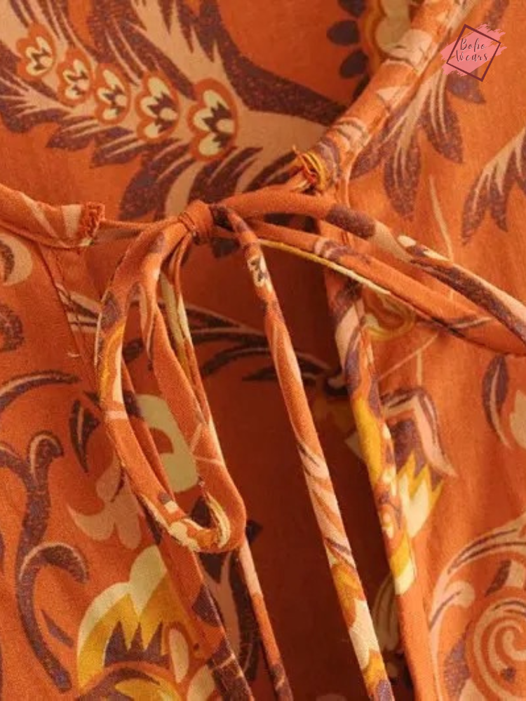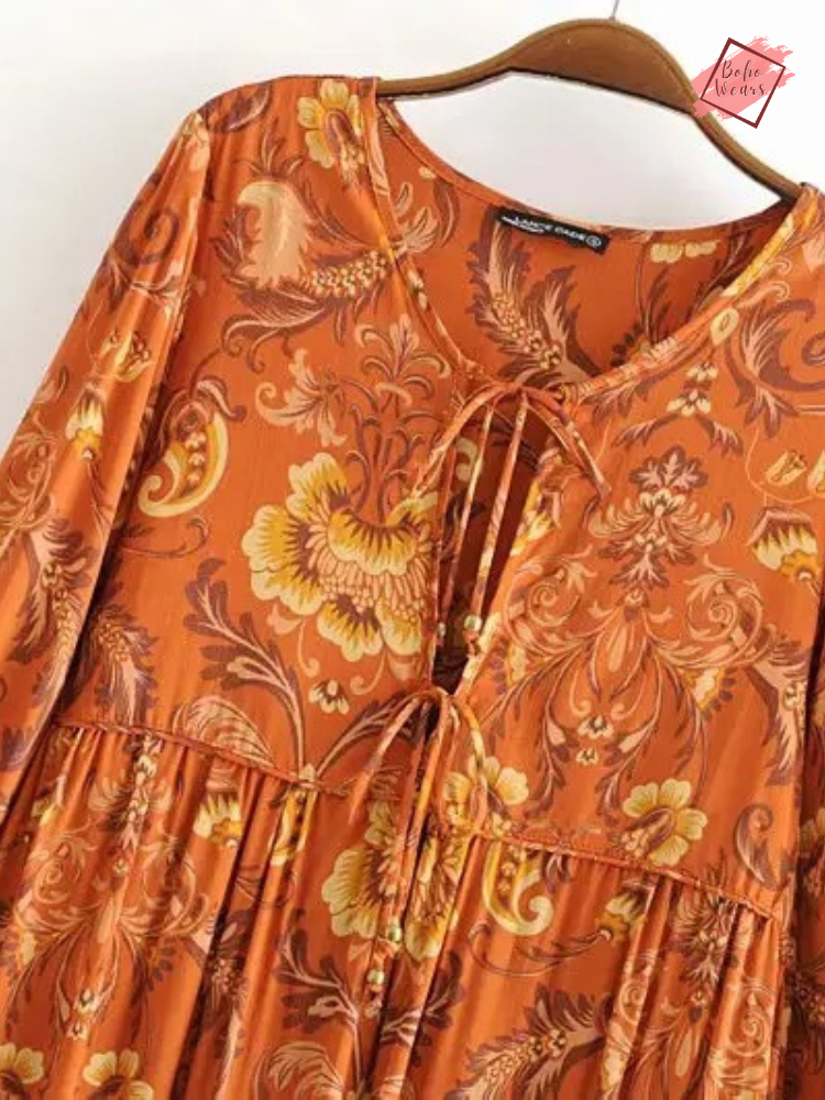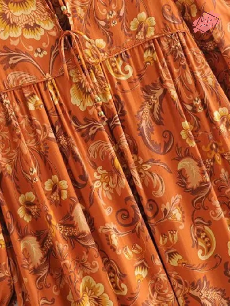 Explore Vintage Elegance: Floral Print Lace-Up Bohemian Midi Dress for Women!