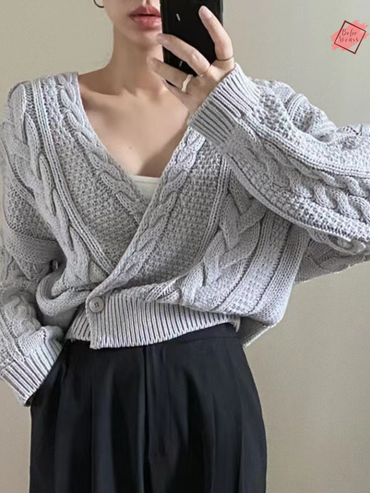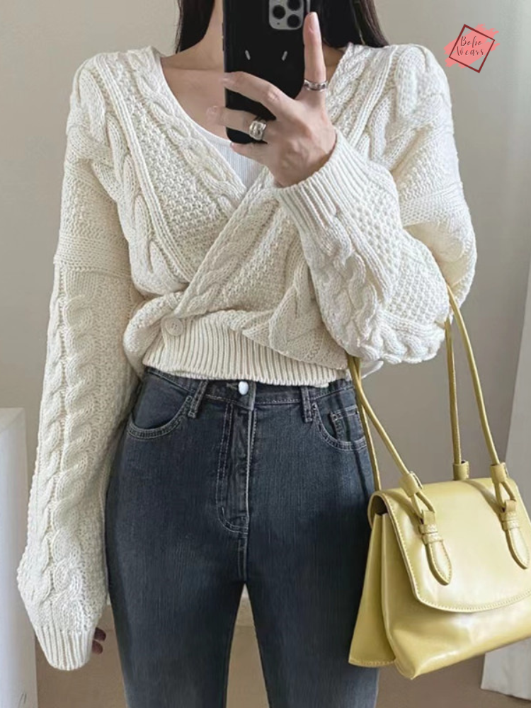 A touch of delicate detail comes from the single button and cross trim at the neckline while the V-neckline elongates the silhouette. The long sleeves help retain warmth on chilly days.