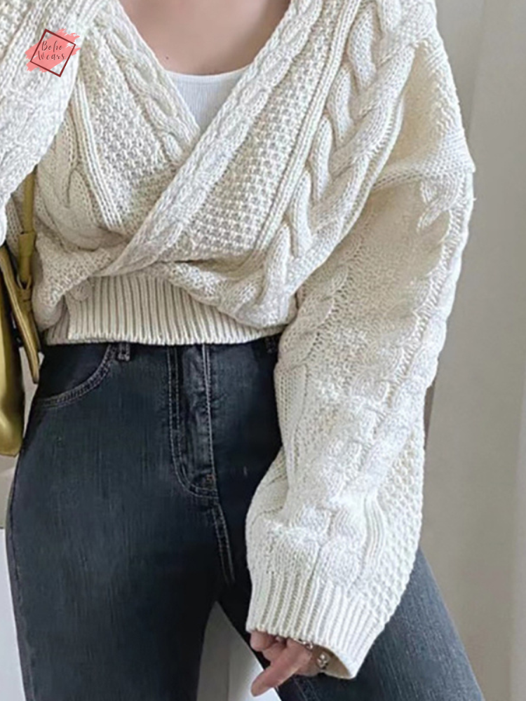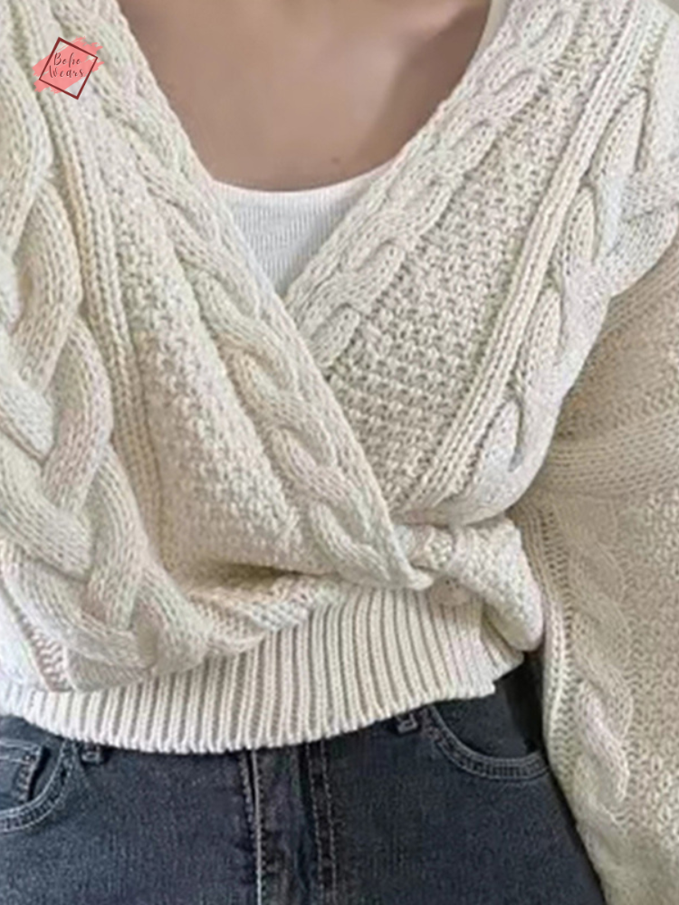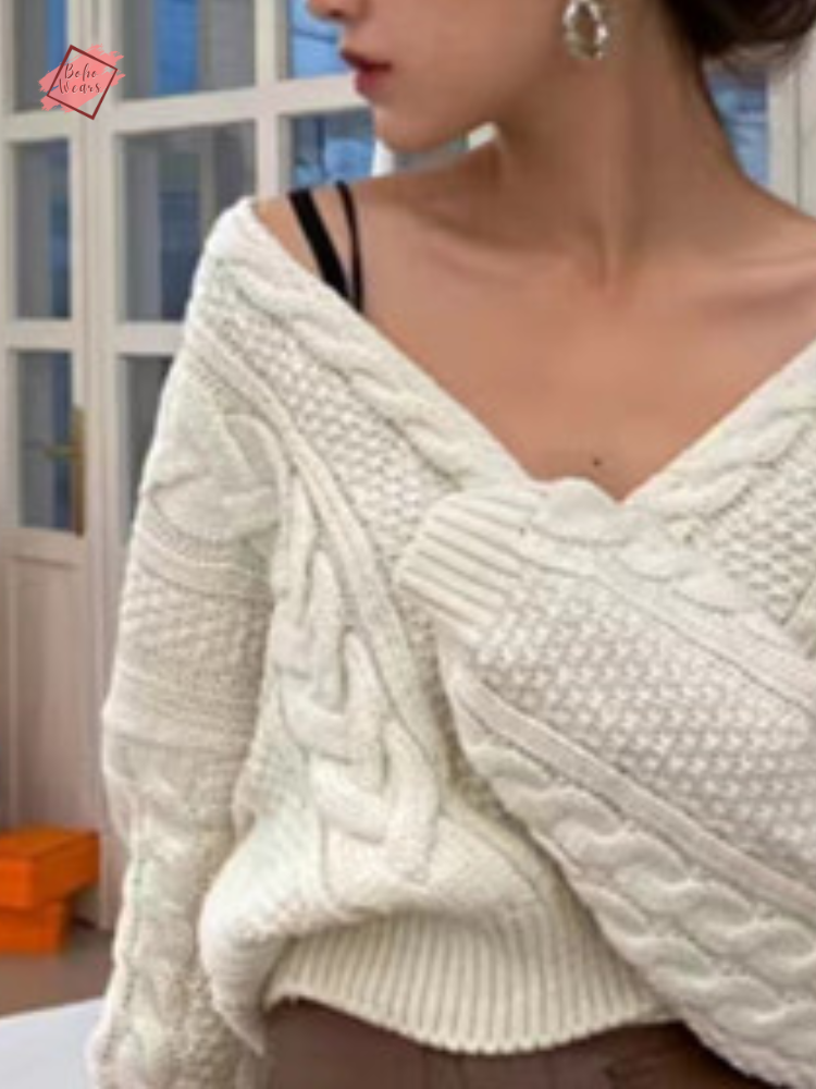 Plus Size Ribbed V-Neck Sweater - Loose Fit Winter Cardigan with Cross Trim for Women