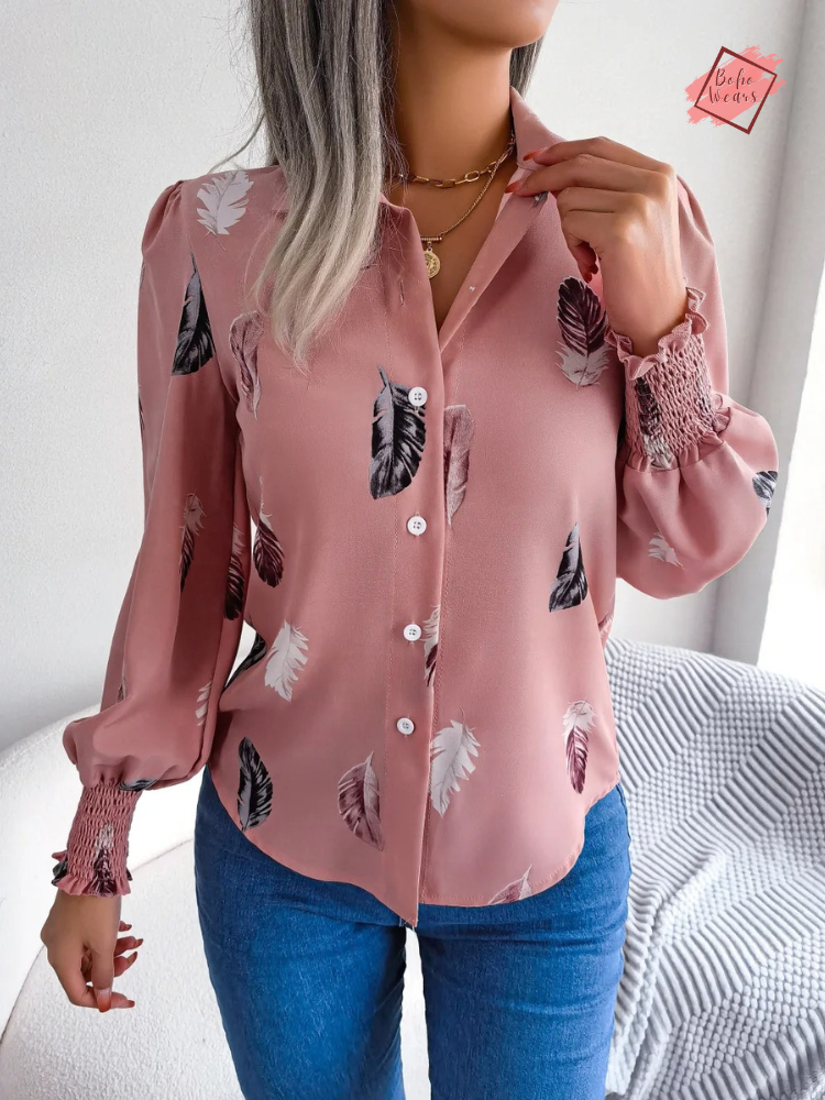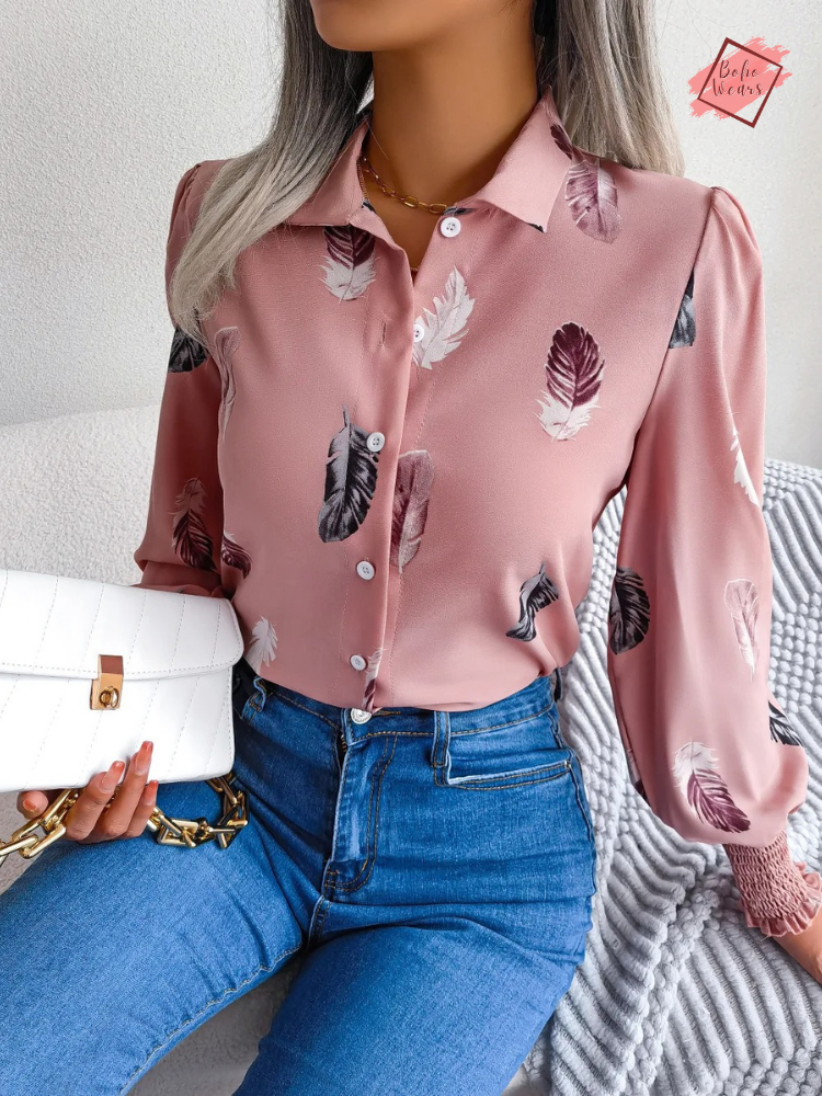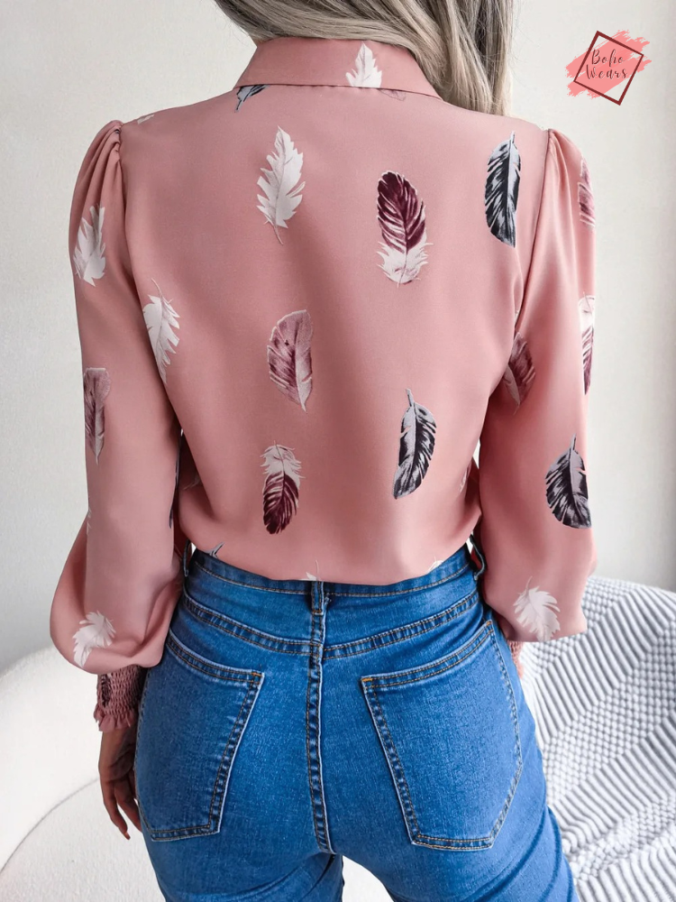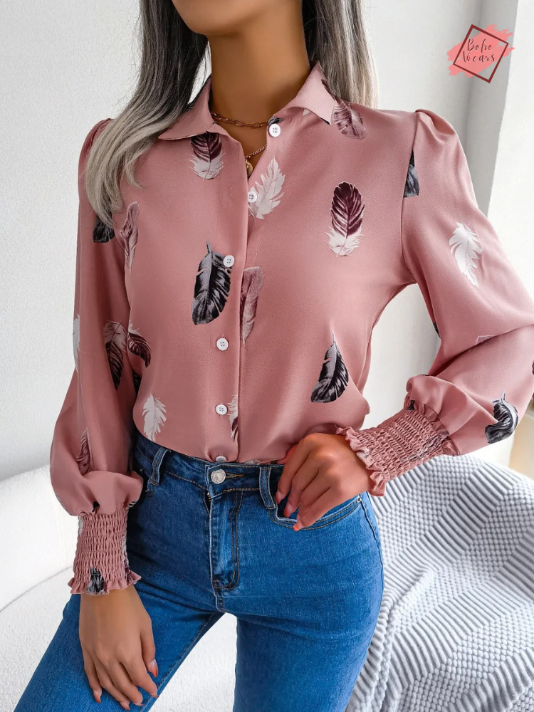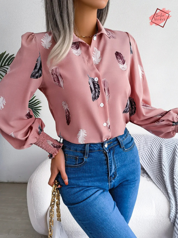 Women's Spring/Summer Collection: Chic Polo Shirt with Feather Lantern Sleeves - Single Breasted Top
