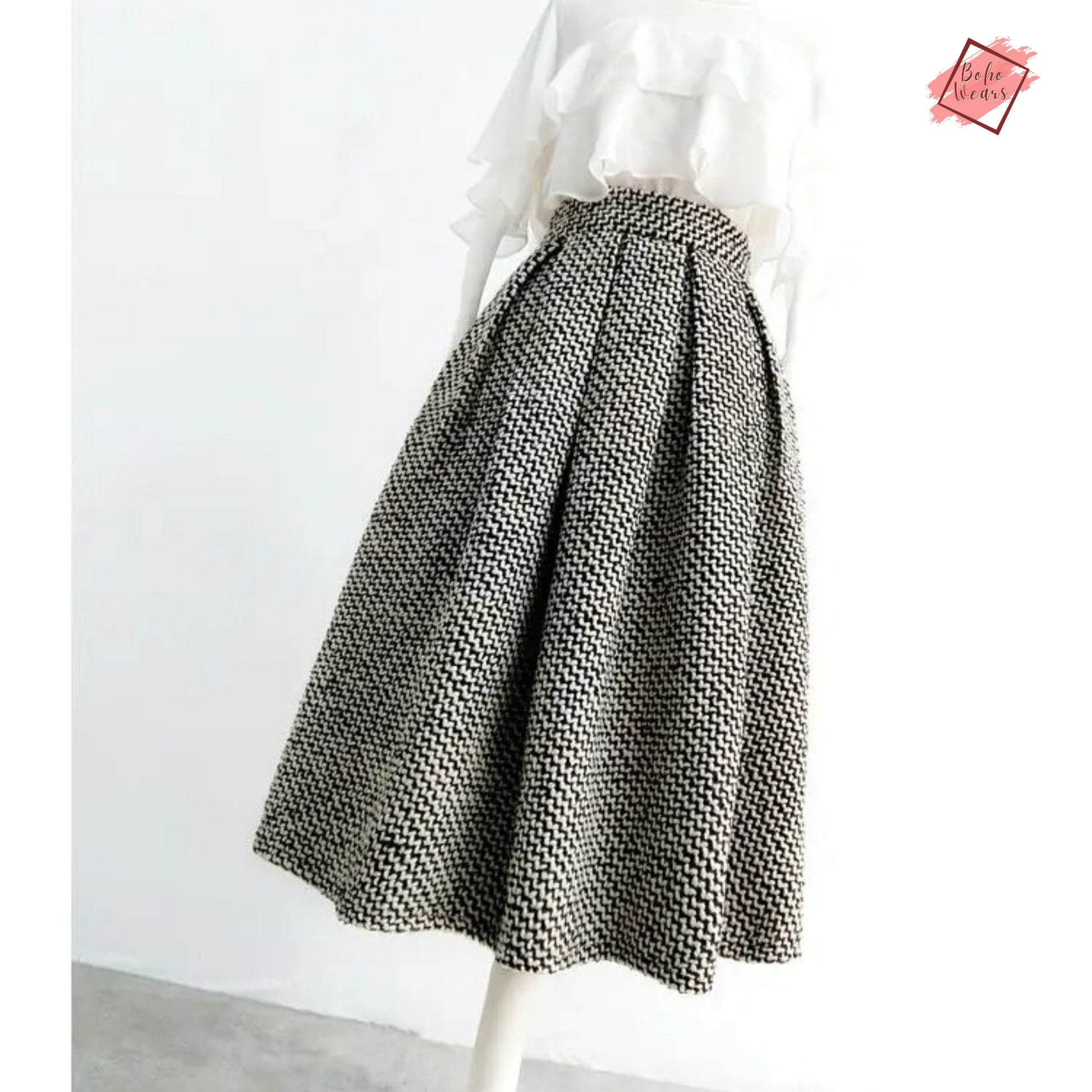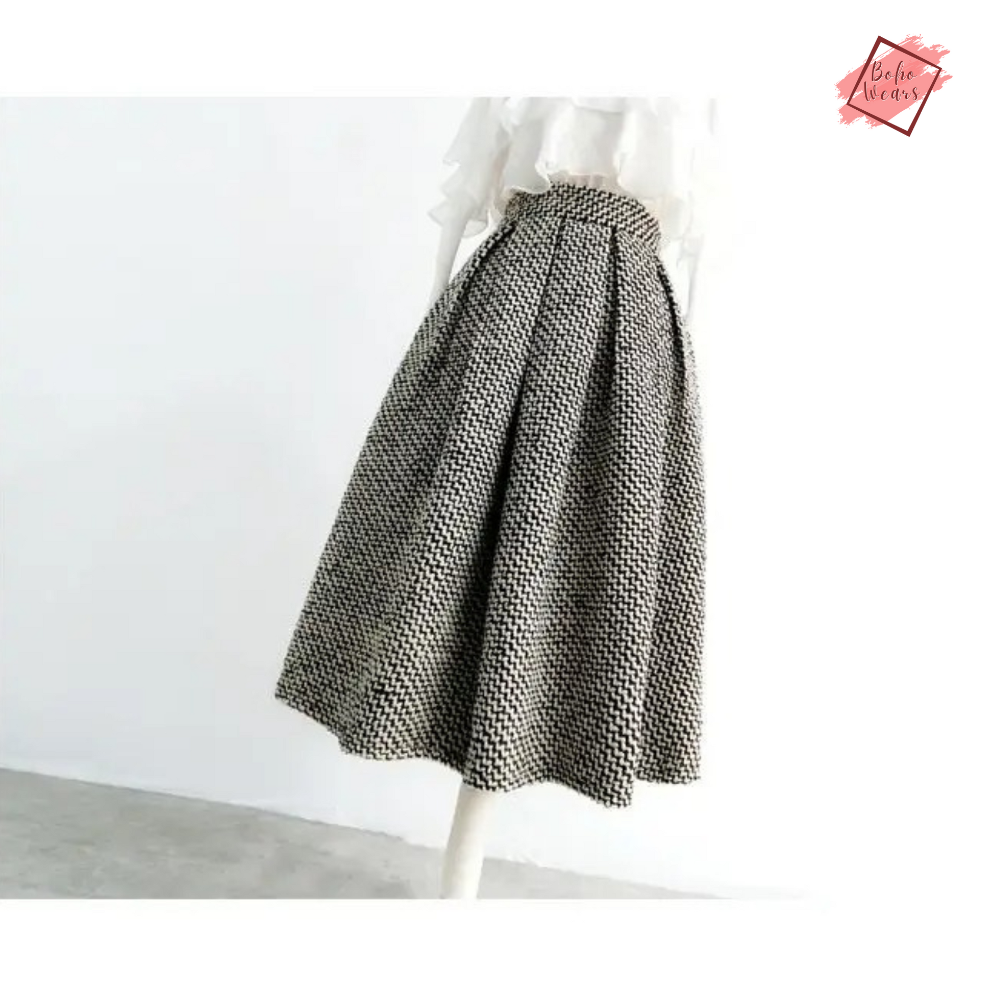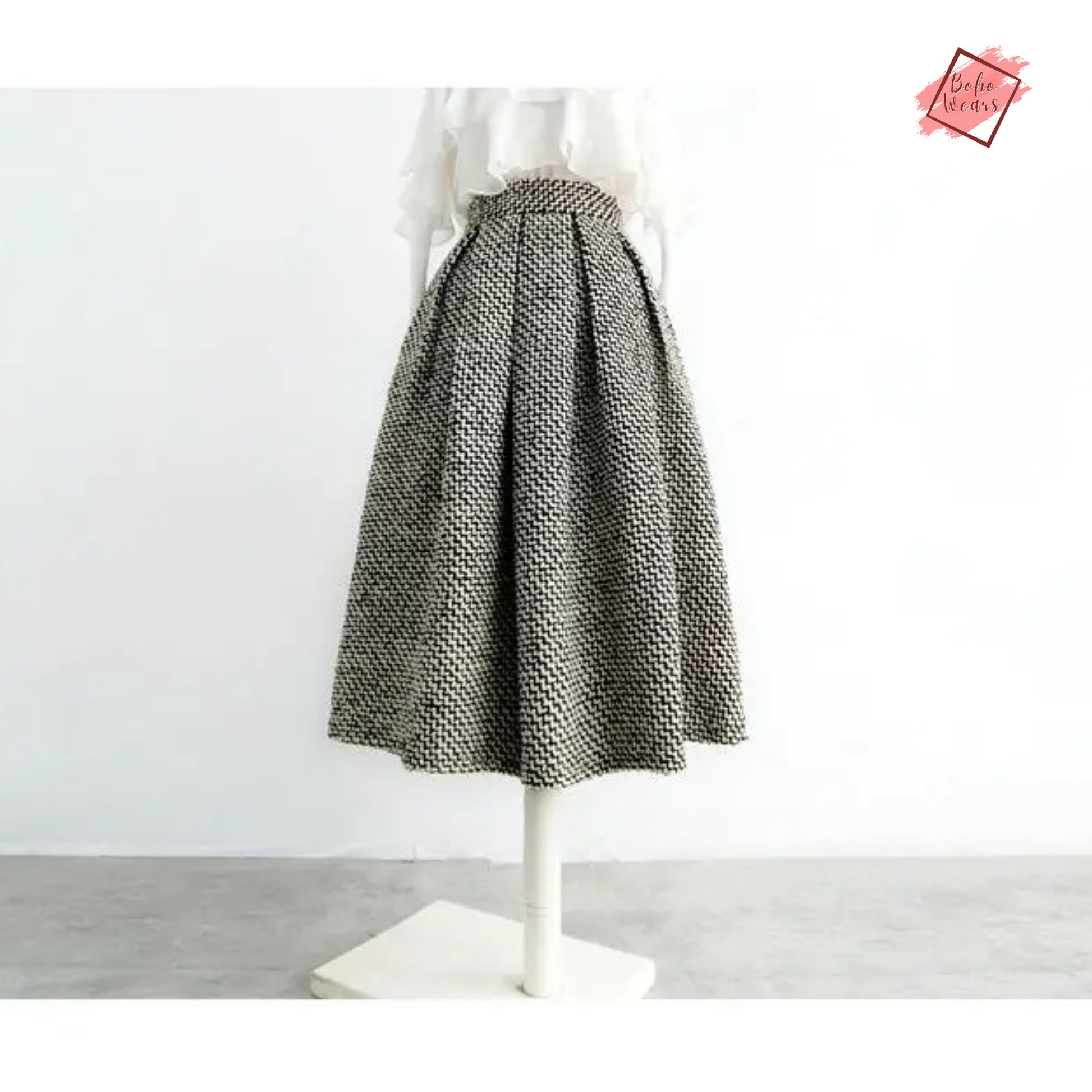 Embrace winter fashion with our hounds tooth skirt, a perfect blend of style and professionalism for winter office wear. This knee-length skirt, designed with a high waist and slim fit, accentuates your silhouette, embodying the elegance of a ball gown. The classic plaid pattern adds a timeless charm, while the zipper detail offers a modern twist.