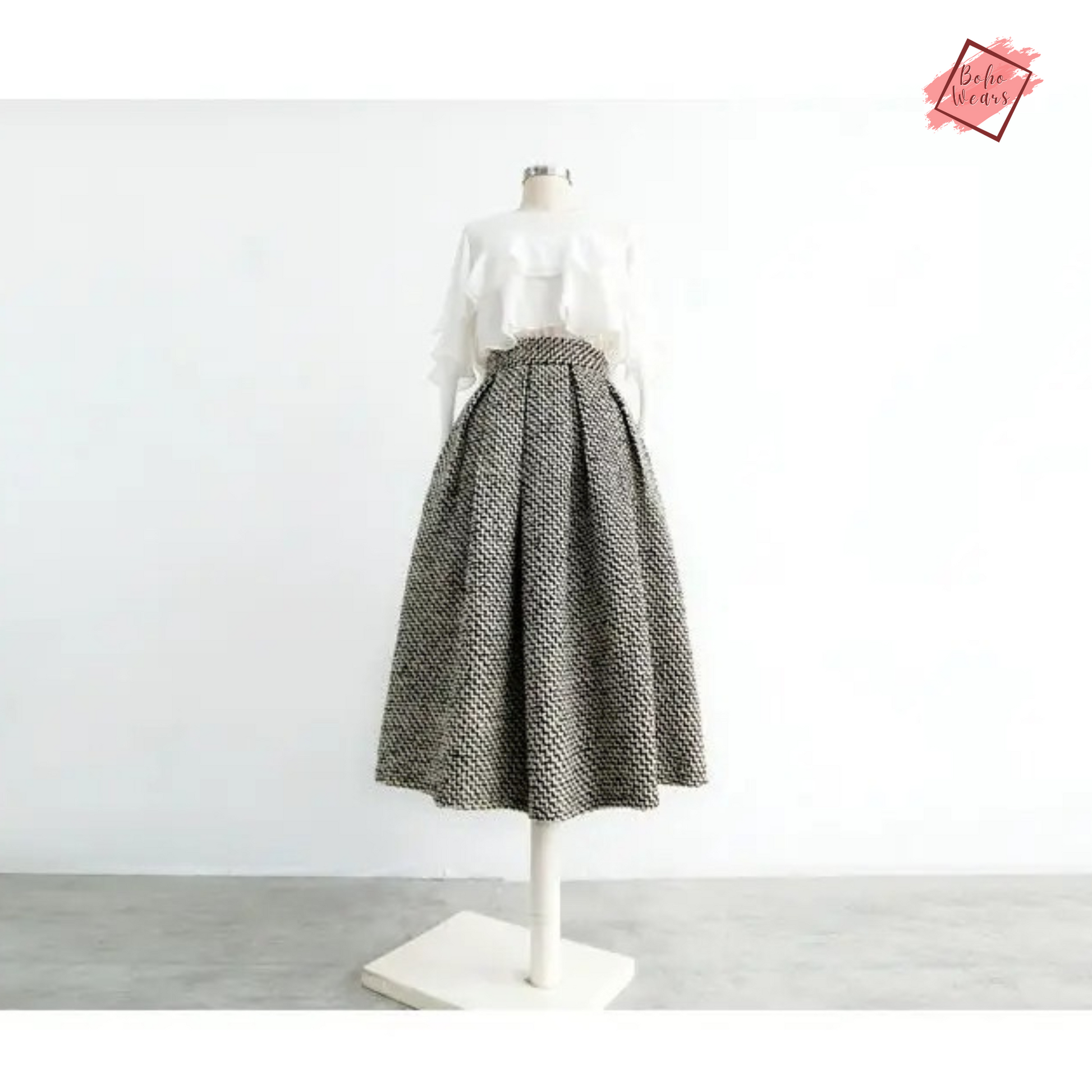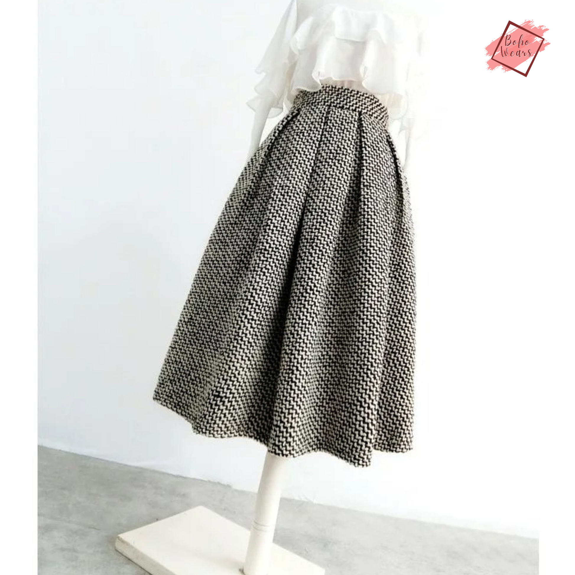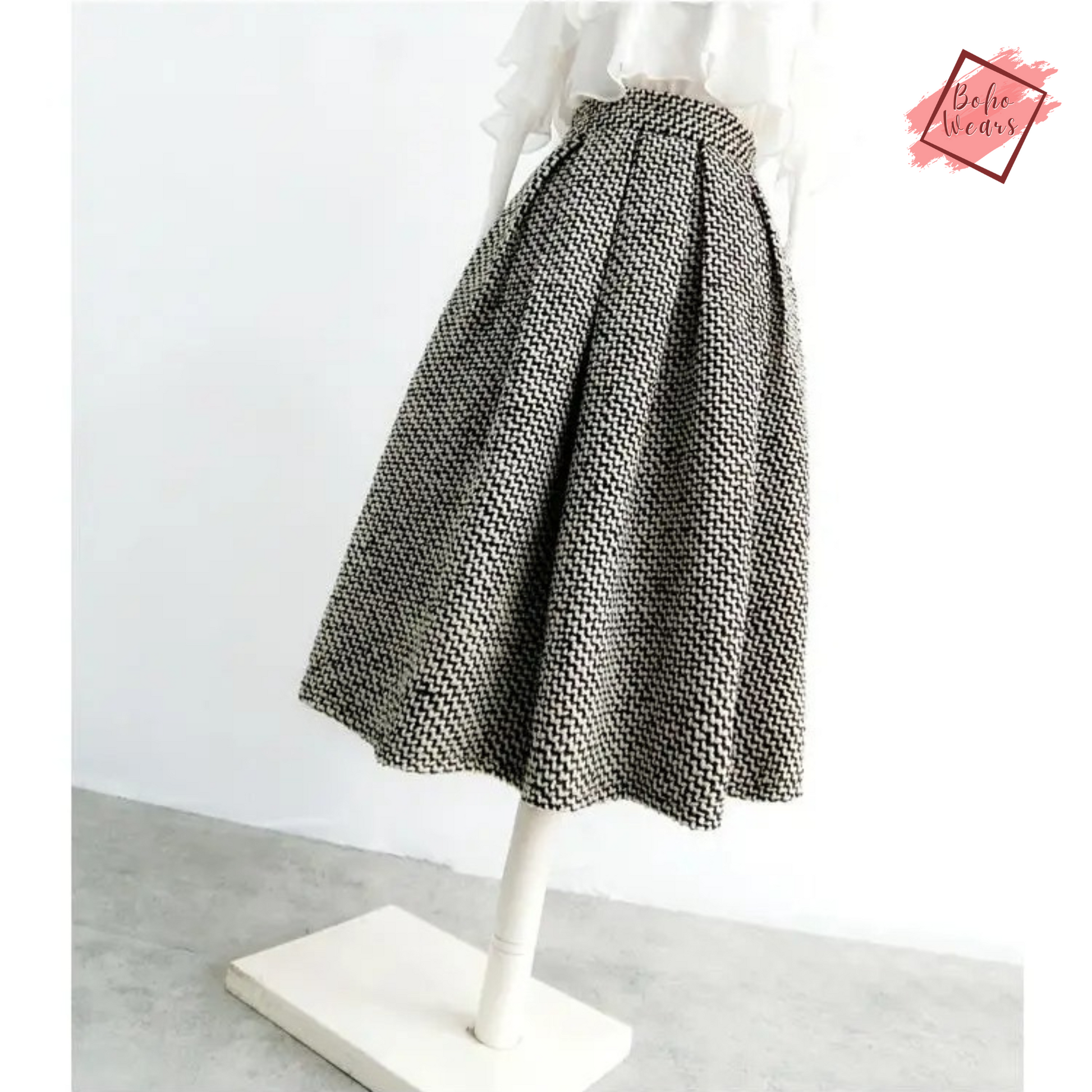 Embrace winter fashion with our hounds tooth skirt, a perfect blend of style and professionalism for winter office wear. This knee-length skirt, designed with a high waist and slim fit, accentuates your silhouette, embodying the elegance of a ball gown. The classic plaid pattern adds a timeless charm, while the zipper detail offers a modern twist.