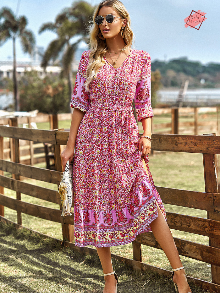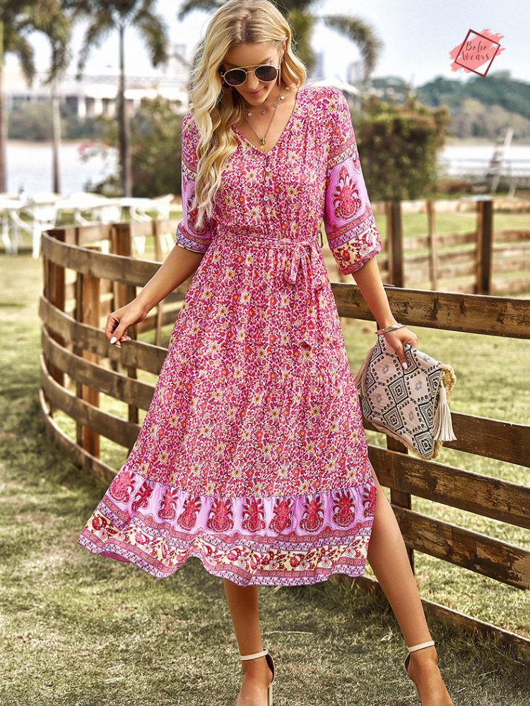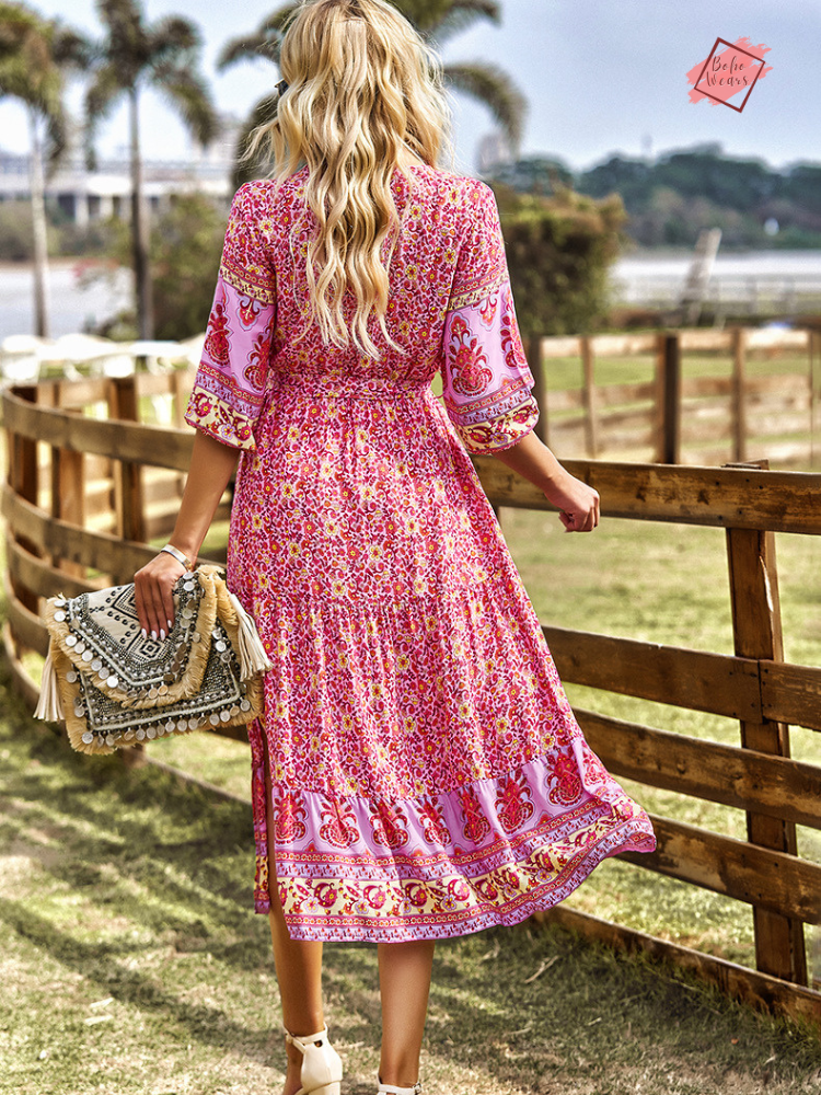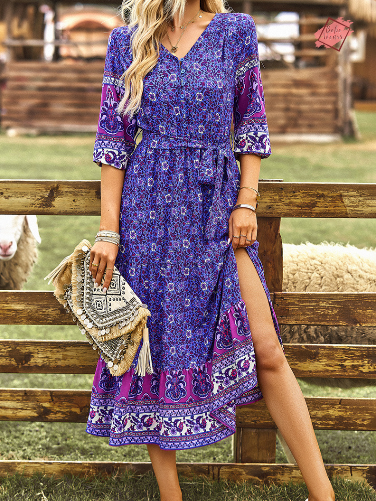 Floral Boho A-line Dress with Side Slit | V-Neck Long-Sleeved Summer Fashion | Casual Vacation Wear for Women