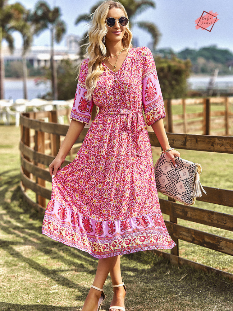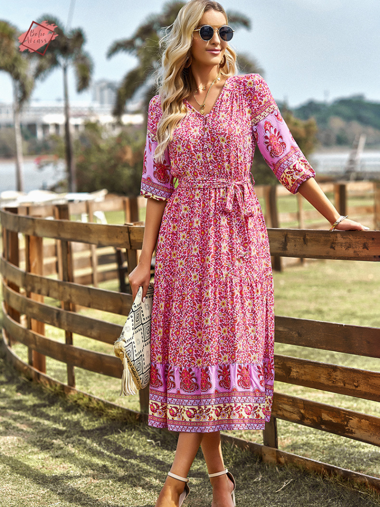 Elevate your warm-weather wardrobe with a touch of boho charm. Our Floral Boho A-line Dress is a blend of casual elegance and timeless fashion. Crafted from quality synthetic fiber, this mid-calf dress promises both style and comfort for those sun-soaked days.
