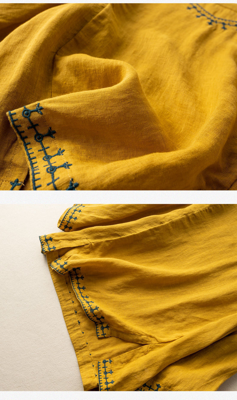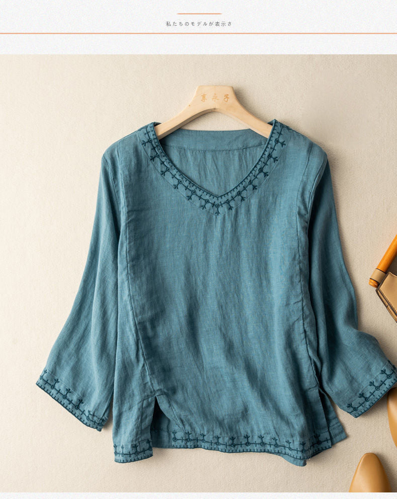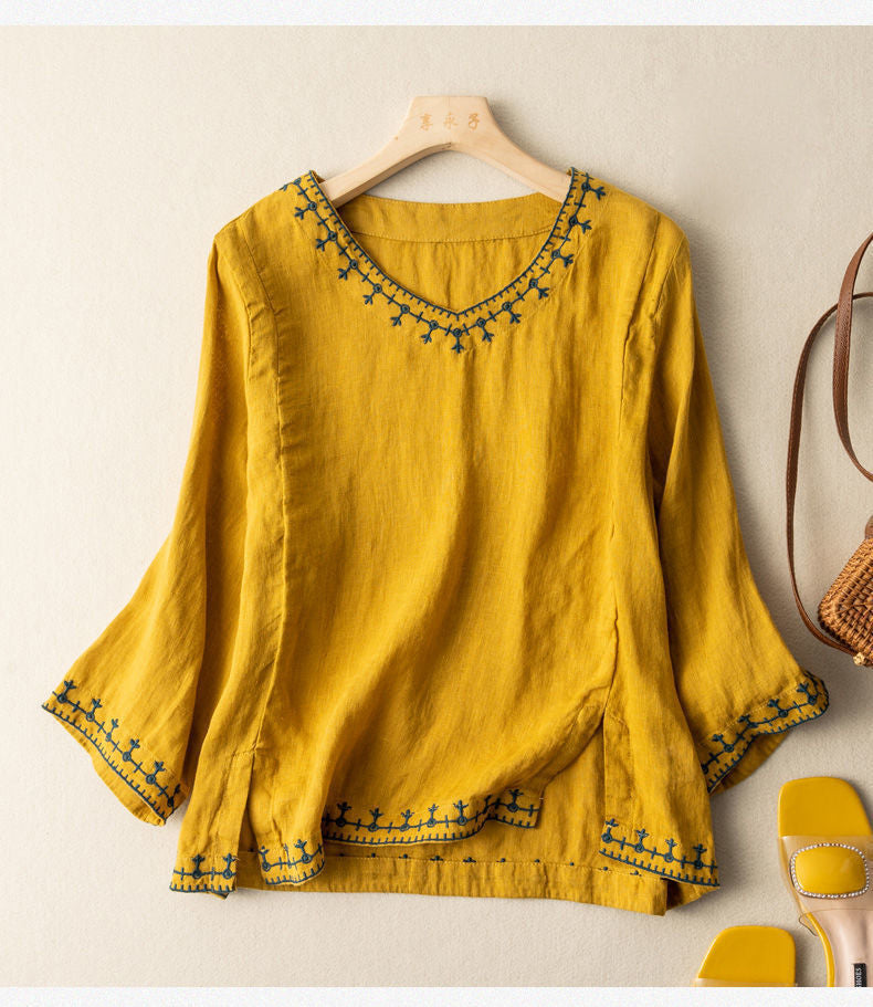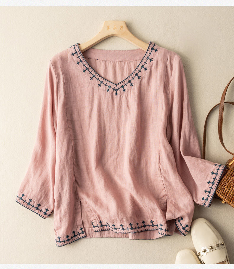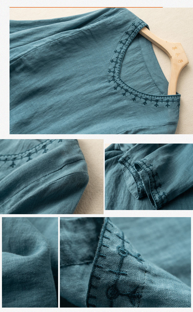 Cotton and Linen women tunic, V-neck retro thin embroidered top, boho linen blouse
