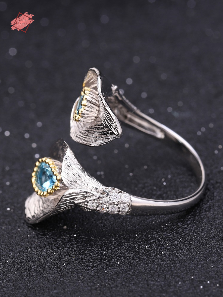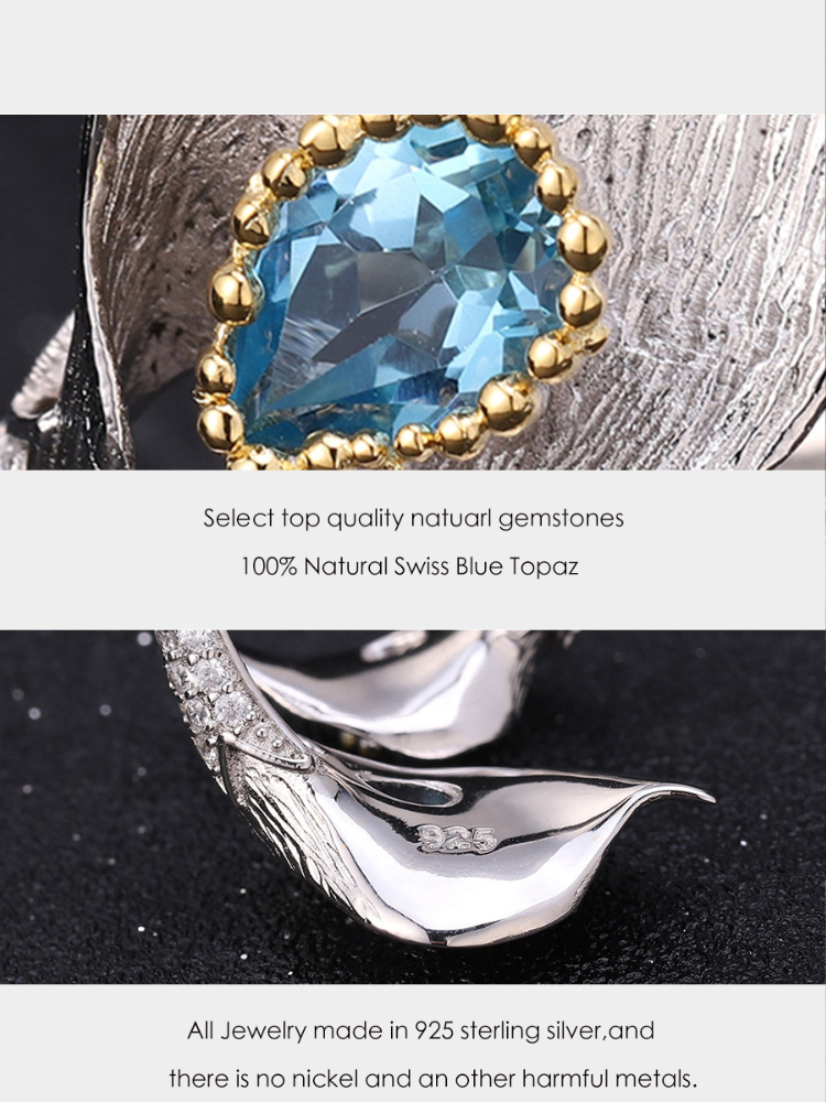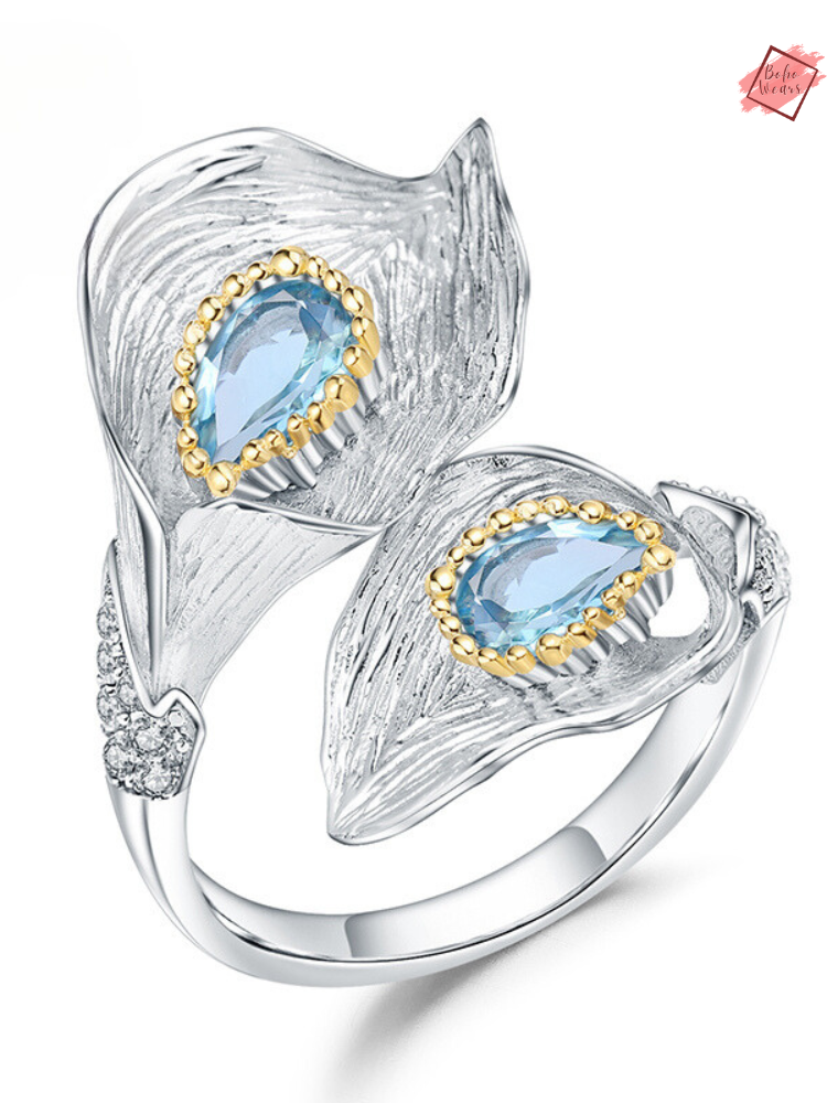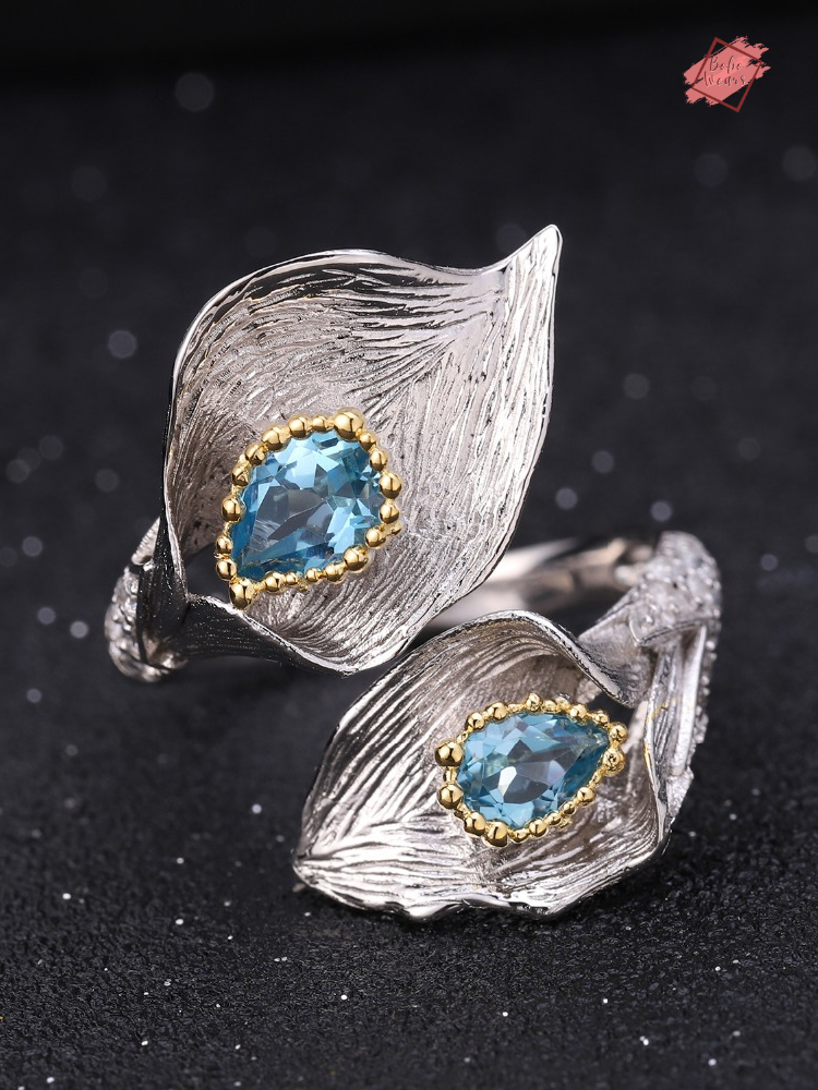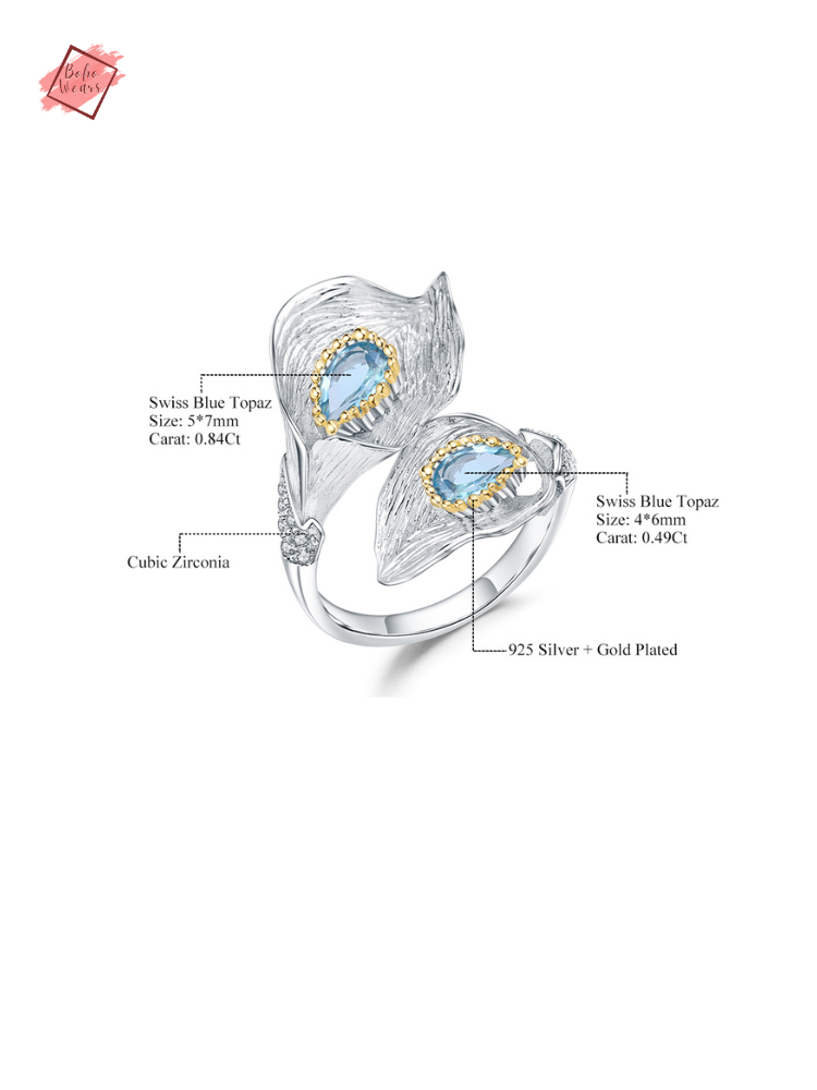 Indulge in the allure of our 1.25-carat natural Swiss Blue Topaz Calla Lily Leaf Ring, a masterpiece of design and craftsmanship. The calla lily leaf motif, crafted in sterling silver and gold plated, gracefully cradles the mesmerizing Swiss Blue Topaz, creating an exquisite blend of vintage charm and modern style.