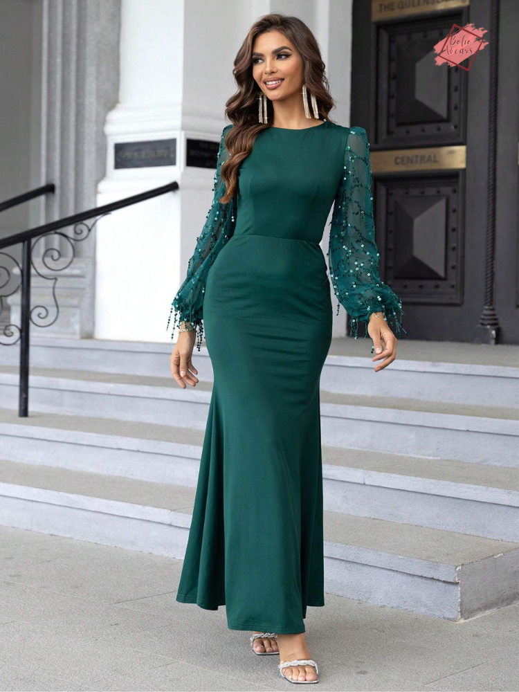 Elegant Evening Gown: Contrast Sequin Mermaid Hem Dress with Lantern Sleeves