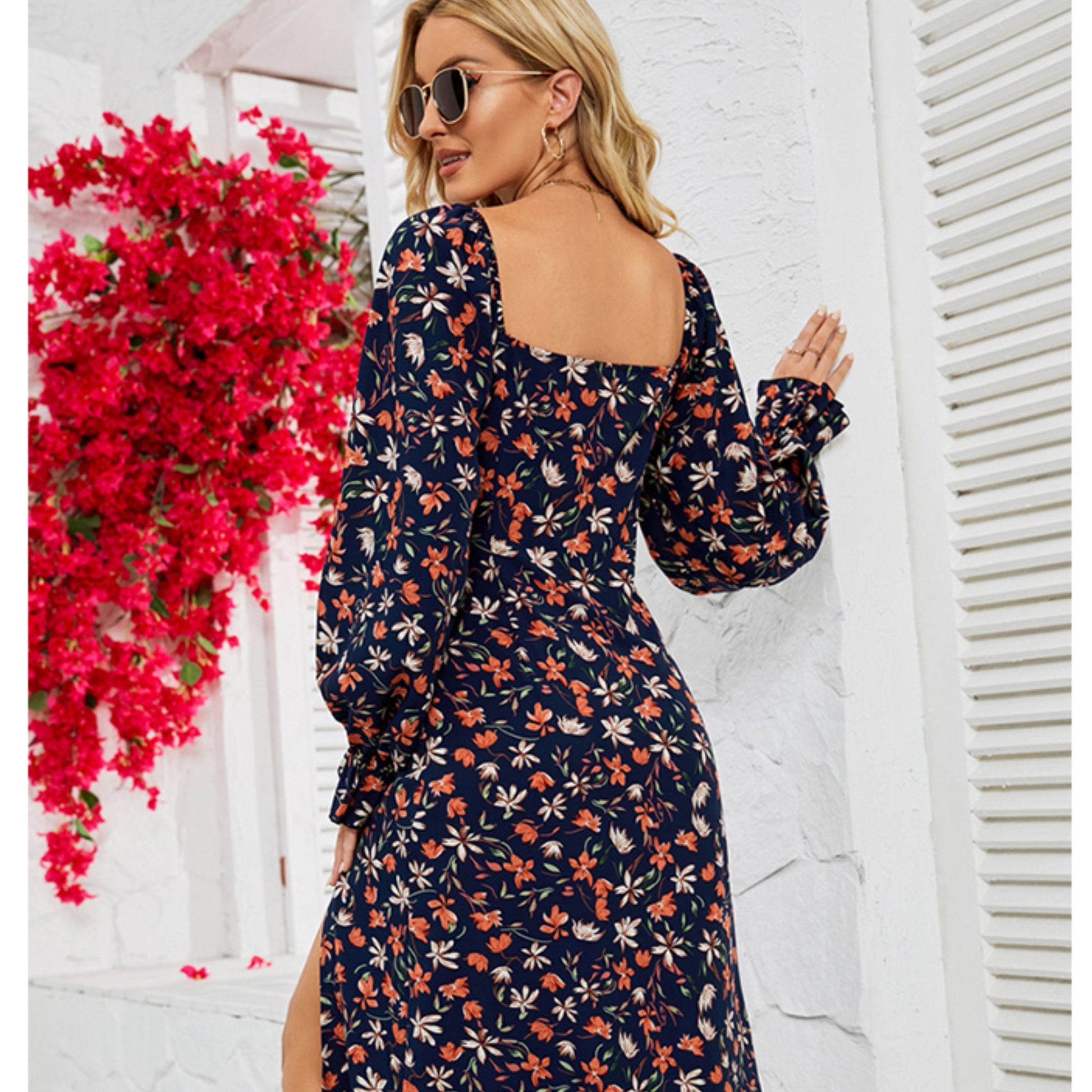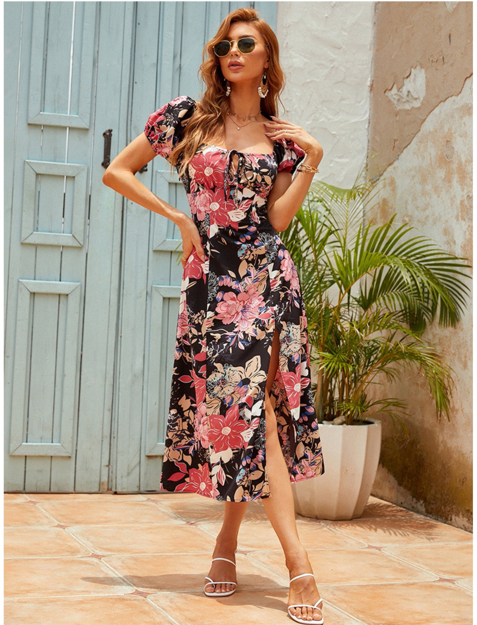 Elegant Summer Bohemian Floral Printed Square Collar Side Split Dress For Women