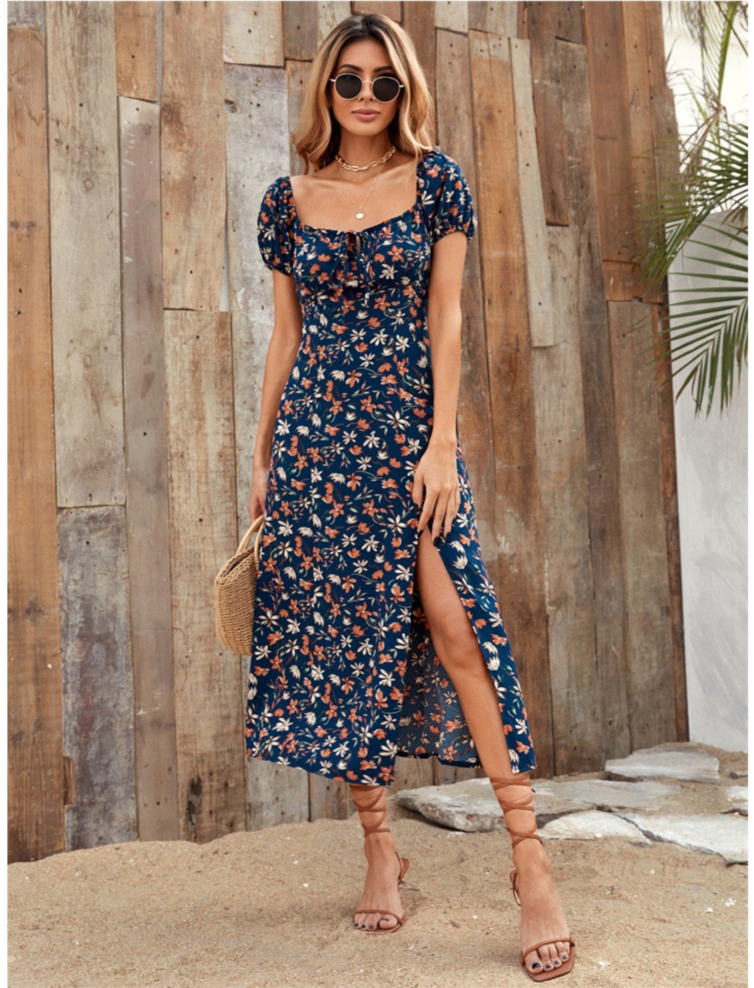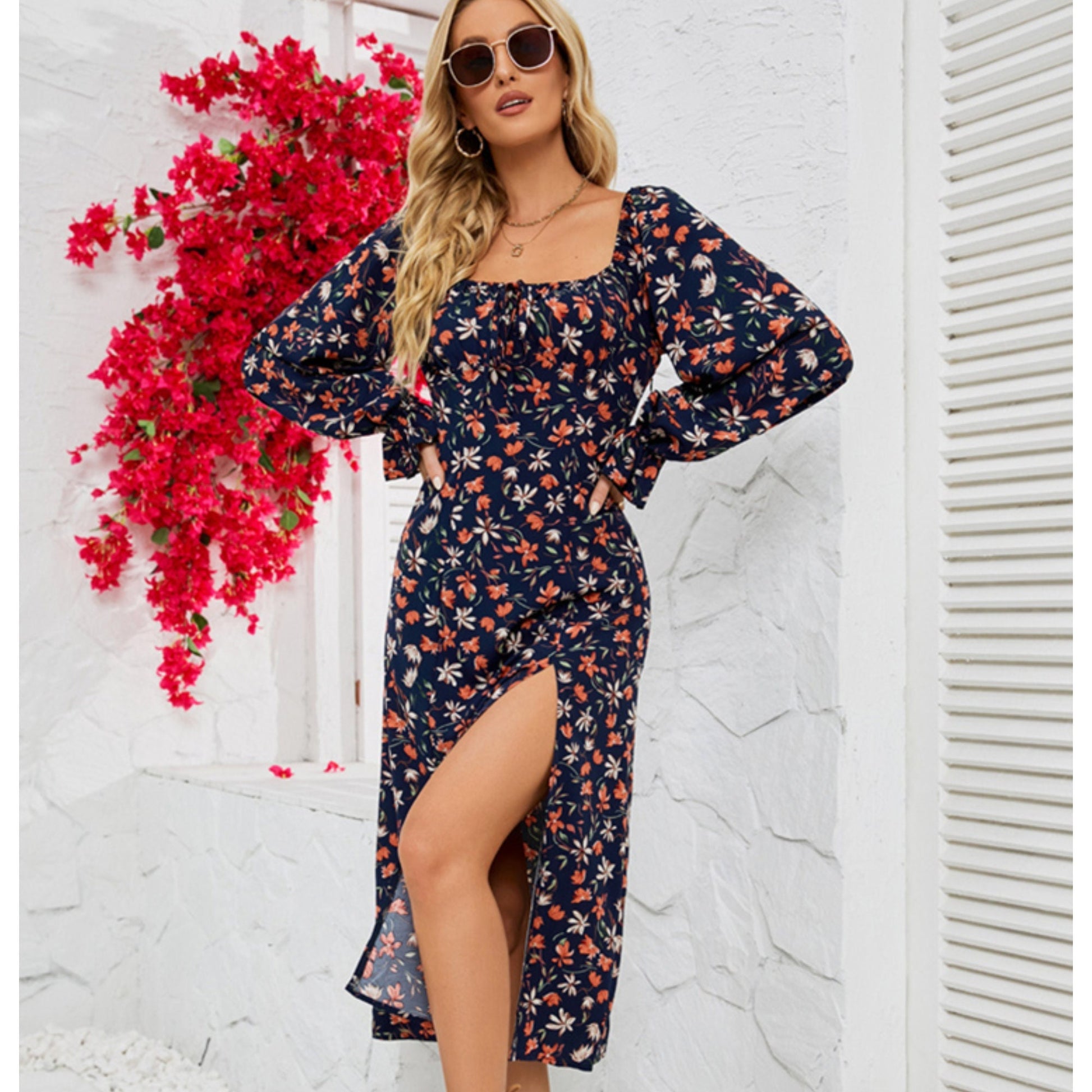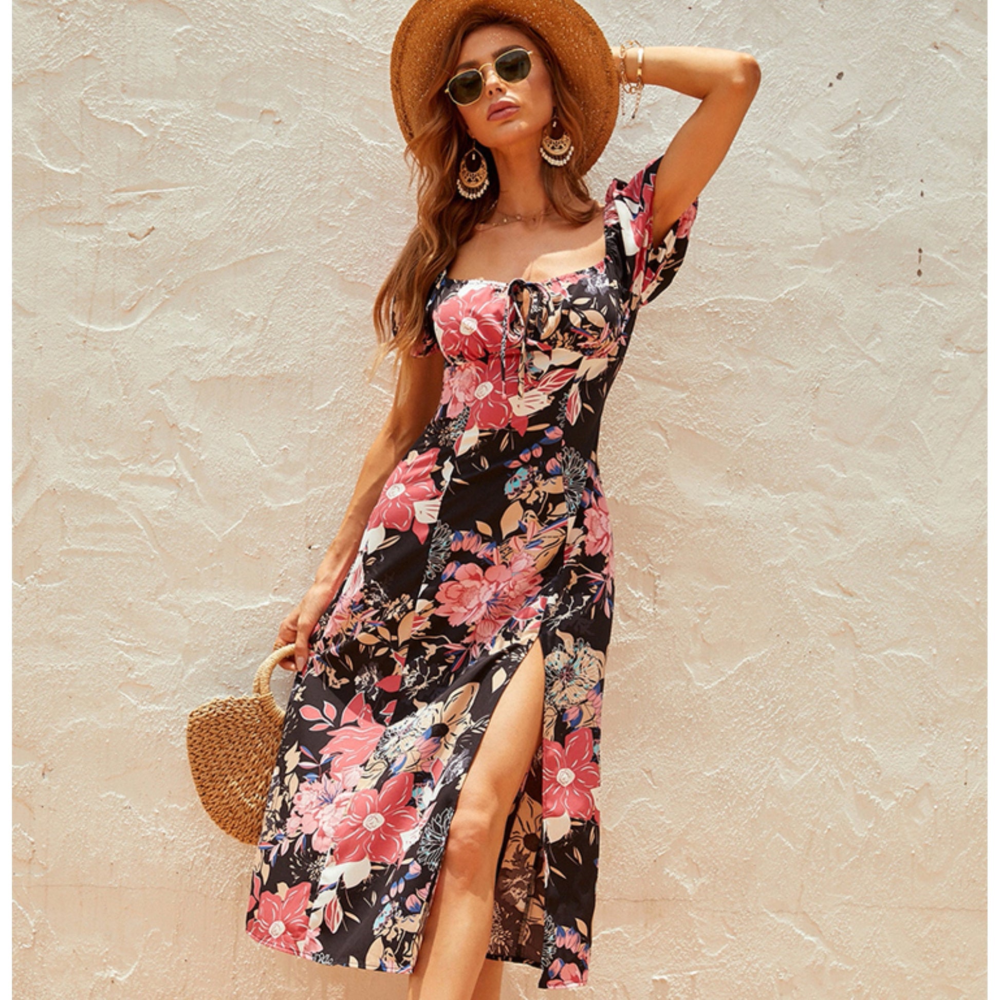Experience the charm of bohemian style summer dresses with our Boho Floral Printed Dress. This elegant boho dress for women encapsulates the free-spirited boho chic fashion with its floral design and square collar detail.