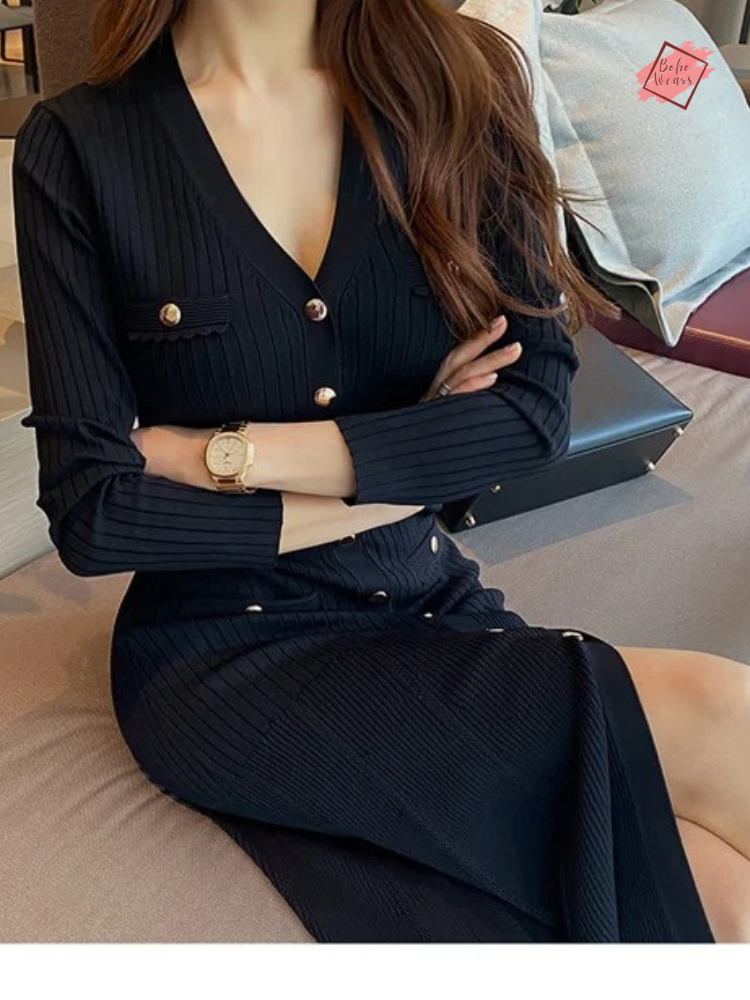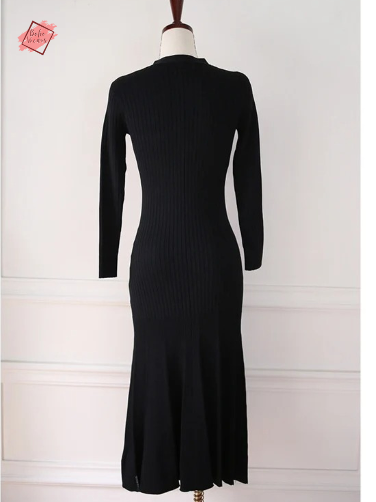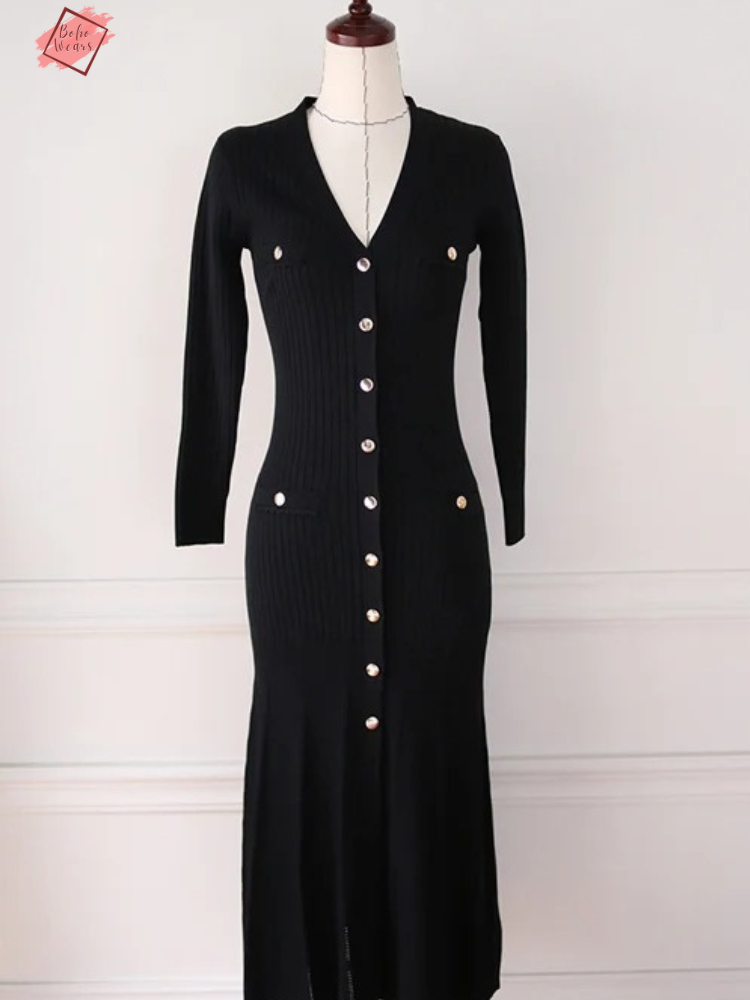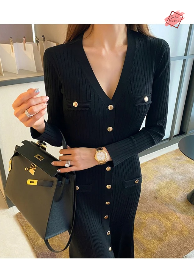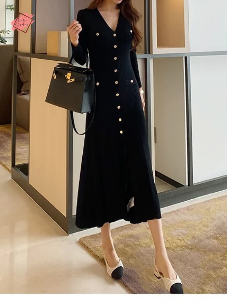 Dive into a realm of timeless grace with our Vintage Korean Maxi Dress. This Autumn/Winter collection piece, intricately knitted, promises not just warmth but also a dazzling showcase of style. With its flattering V-neck and full sleeves, the dress elegantly contours the body, echoing a trumpet/mermaid silhouette that celebrates your every move.
