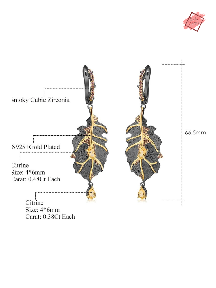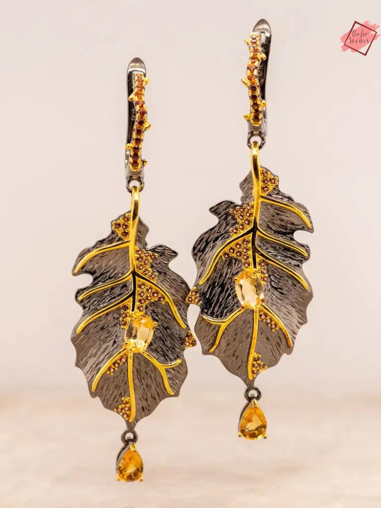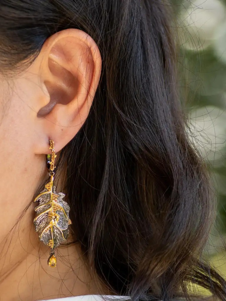 Artistic Monstera Leaves Earrings Inspired by Georgia O'Keeffe with Natural Citrine