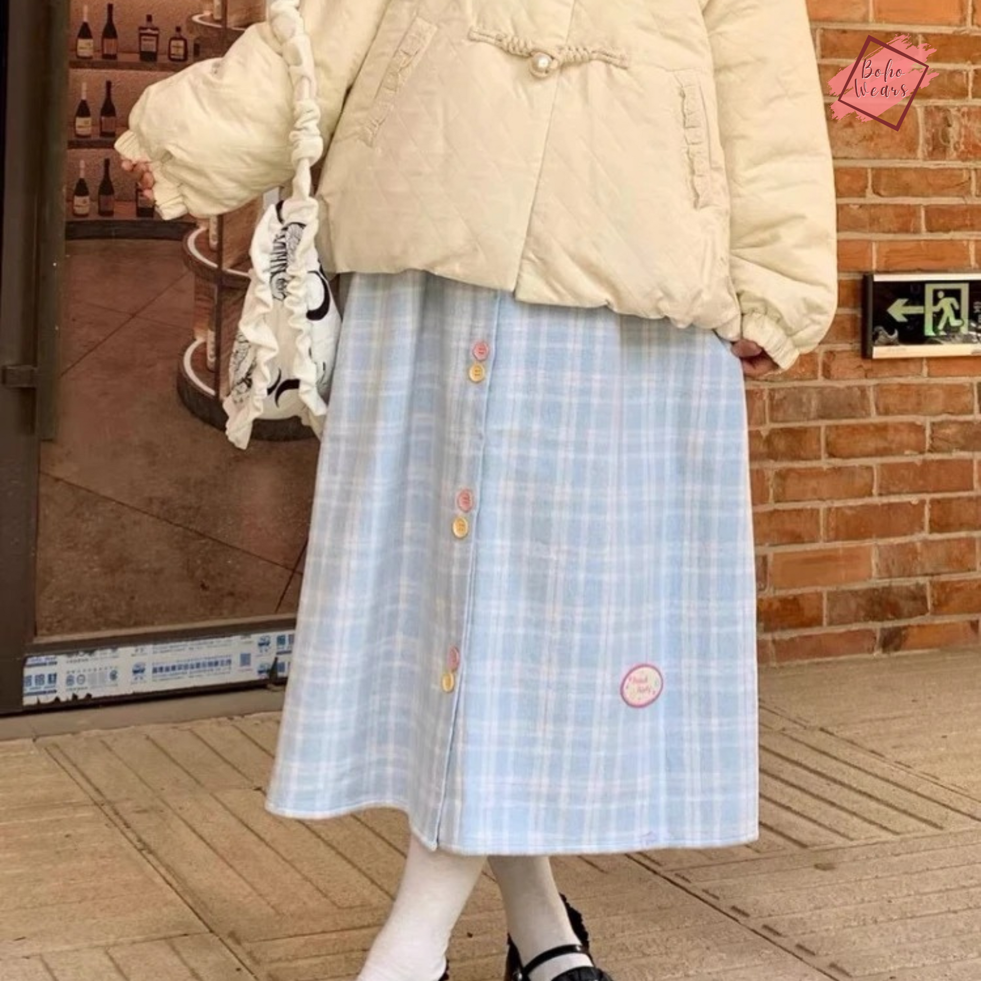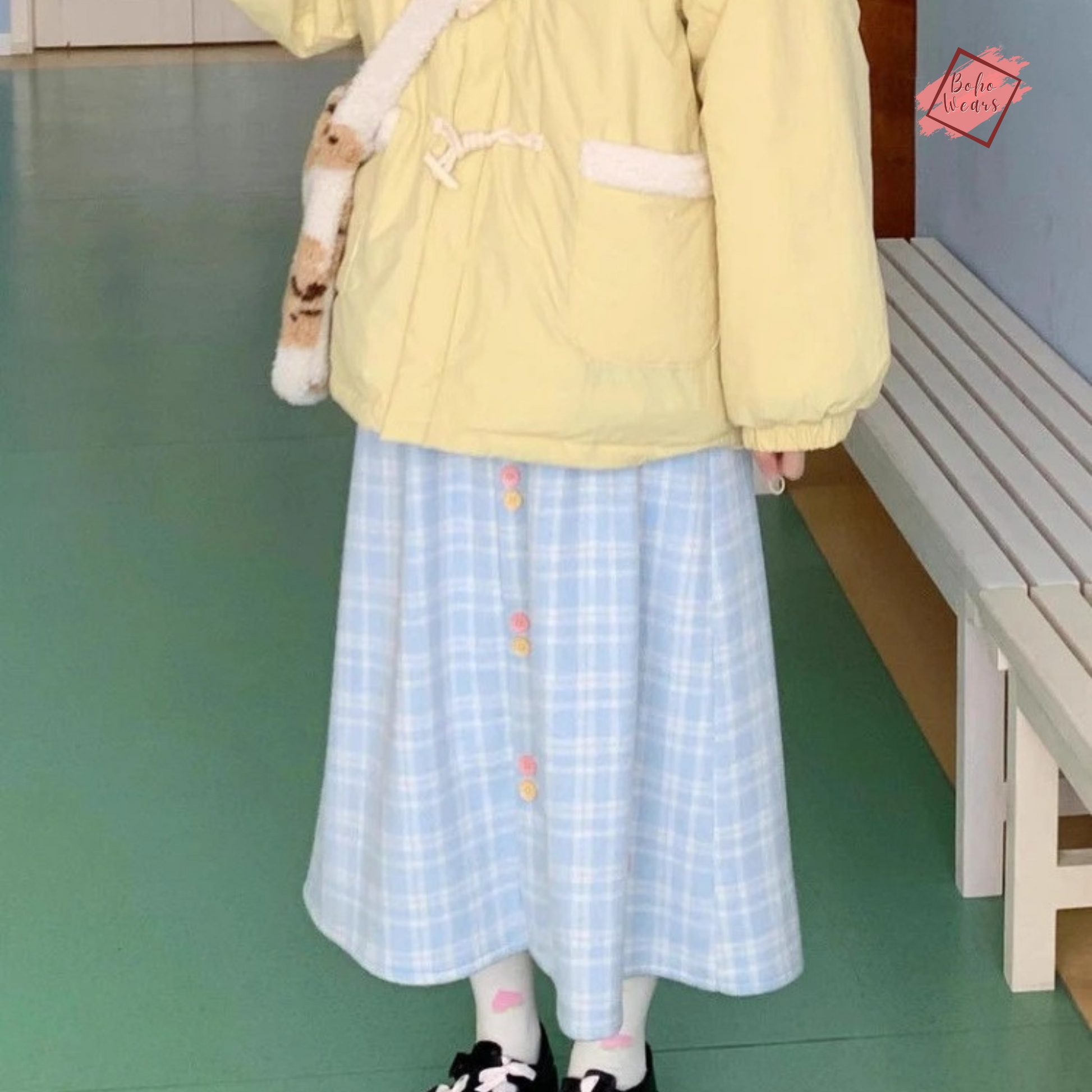 Kawaii Patchwork Plaid Skirt - Cute Blue Woolen Long Skirt - Elastic Waist - Winter A-line Button Style