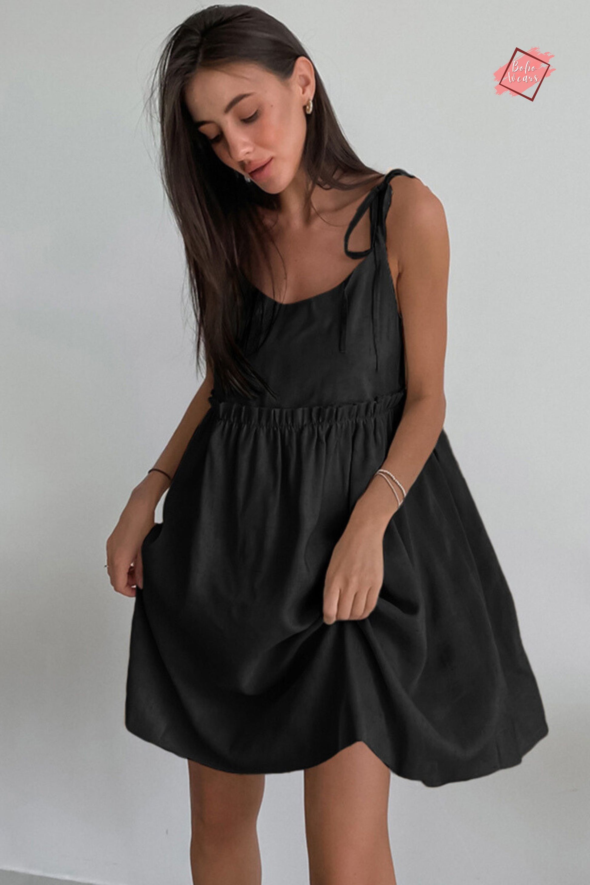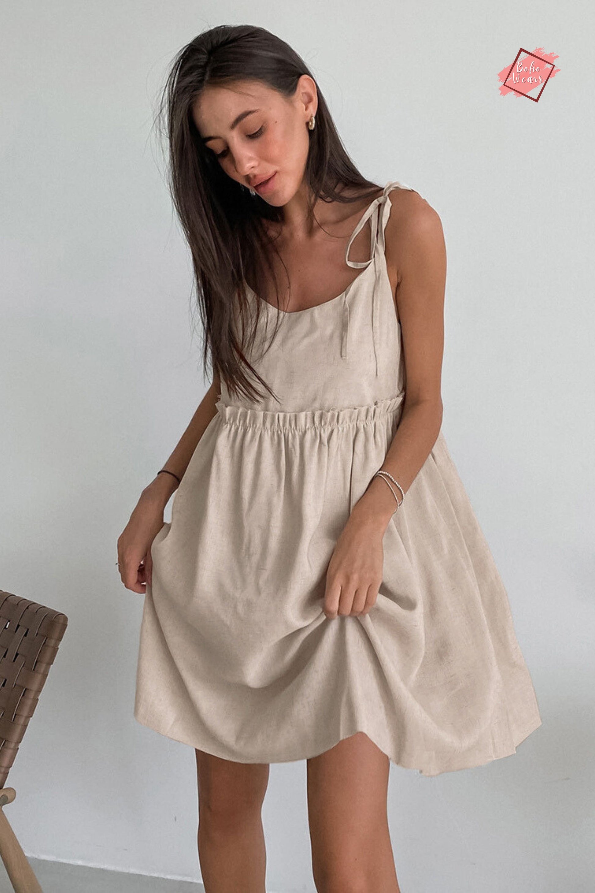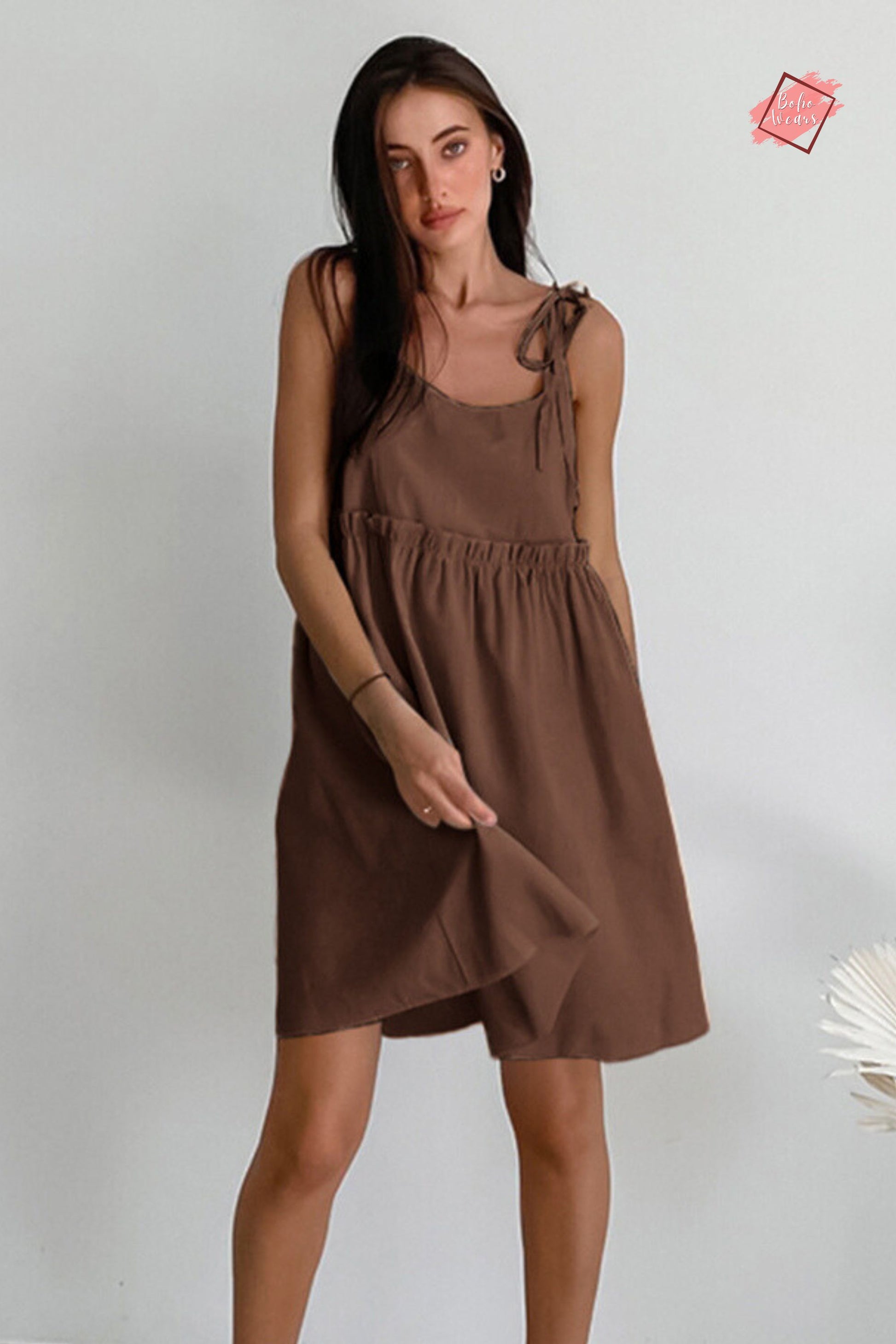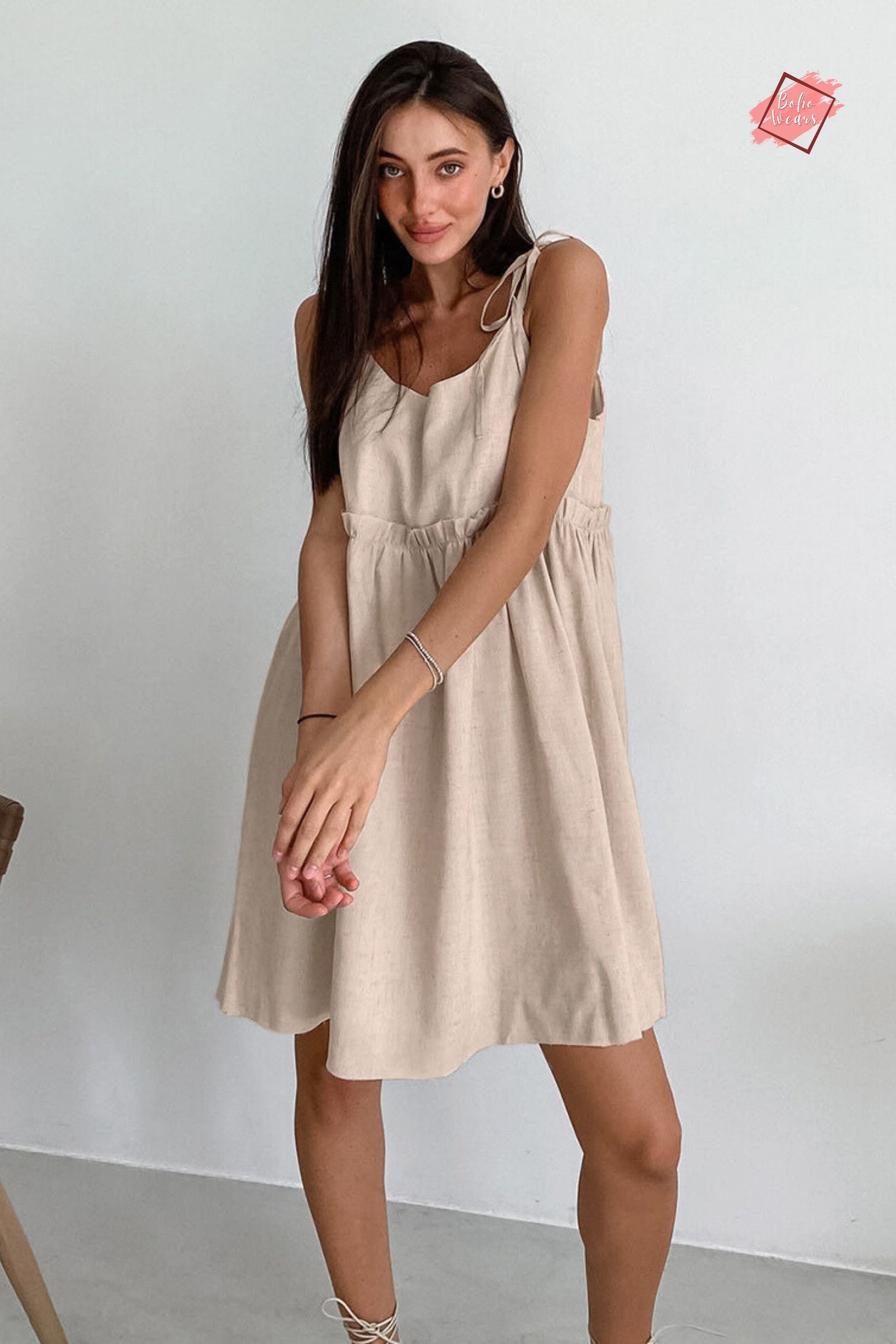 Linen A-Line Mini Dress with Spaghetti Straps and Lace-Up Detail - BohoWears Women's Summer Fashion