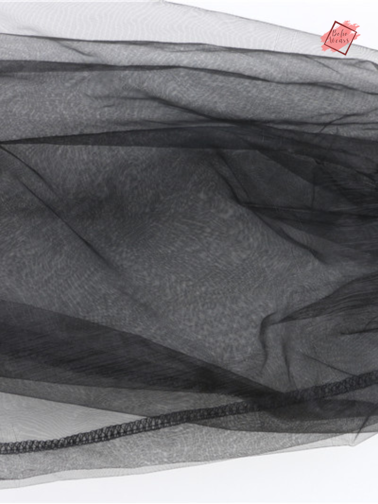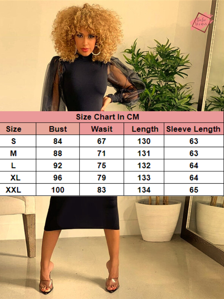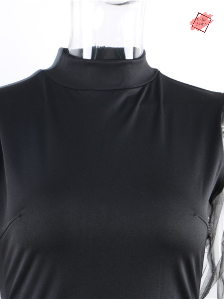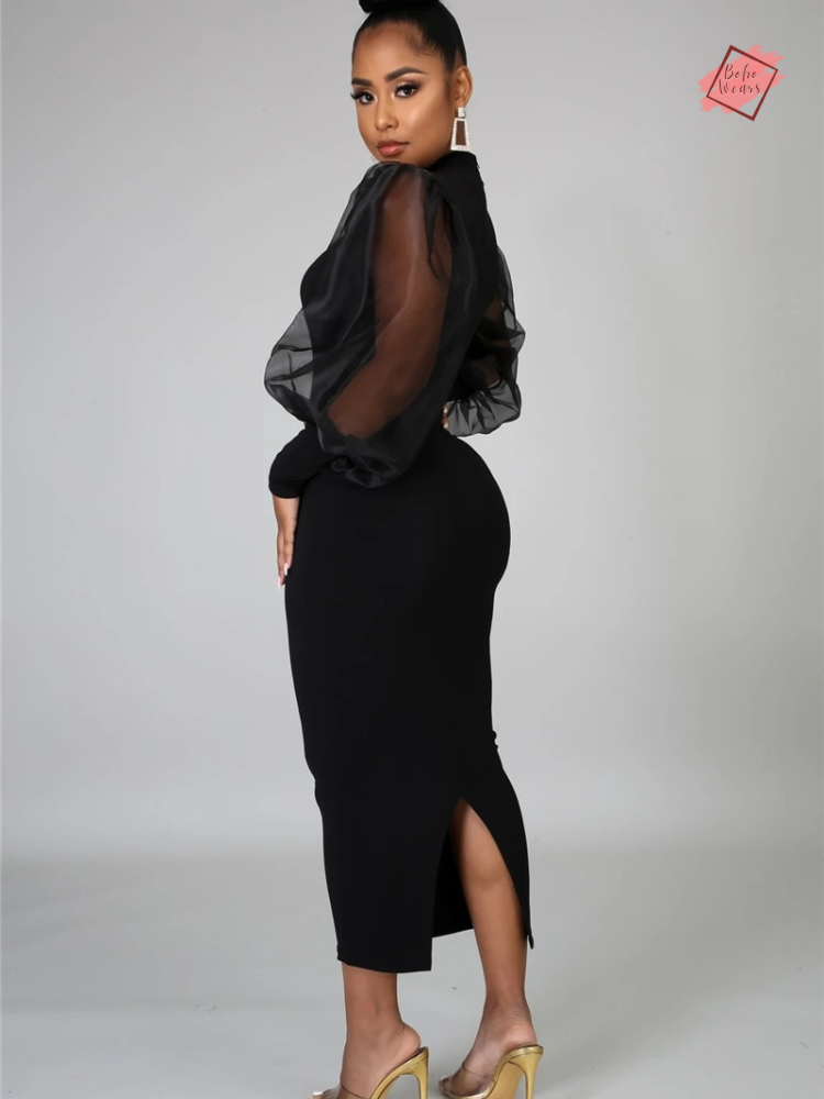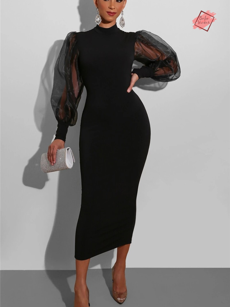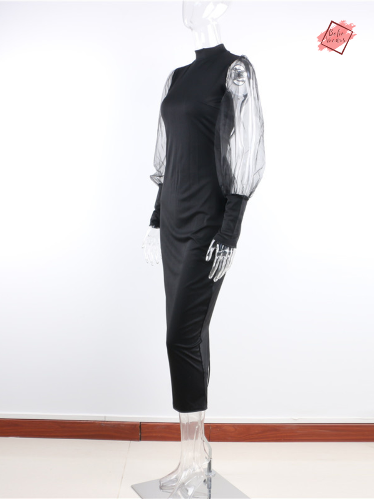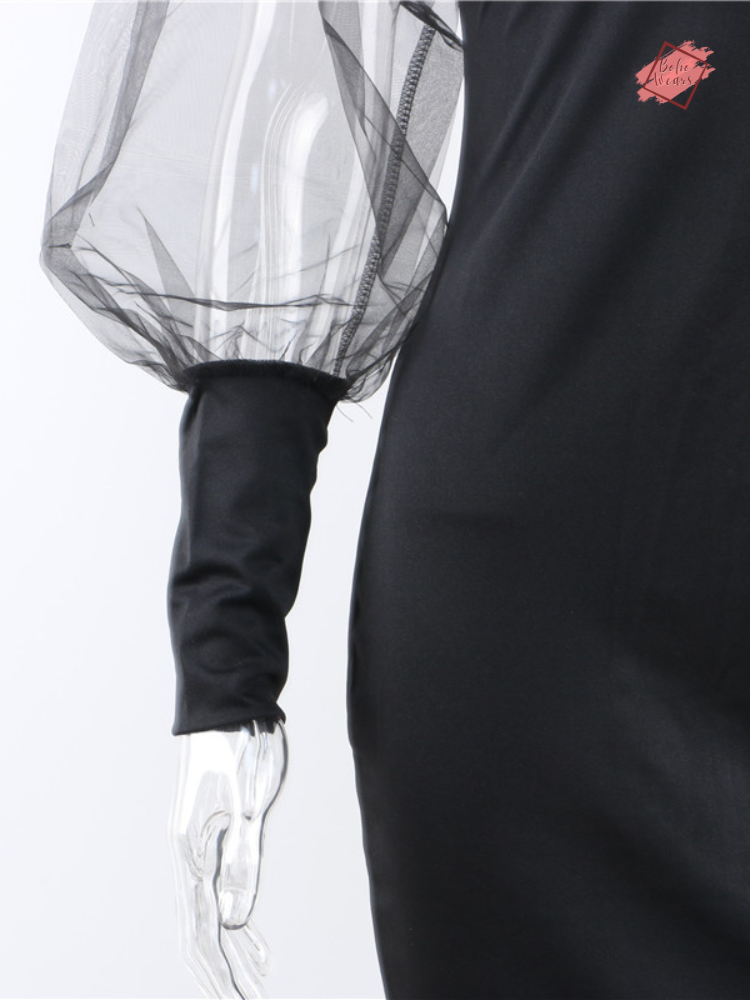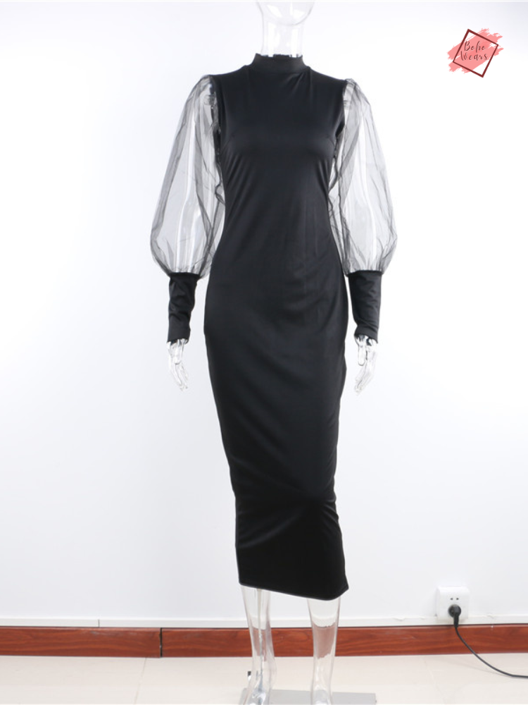 Mesh Puff Sleeve Sexy Bodycon Dresses Women High Neck Club Back Split Black Party Maxi Dress