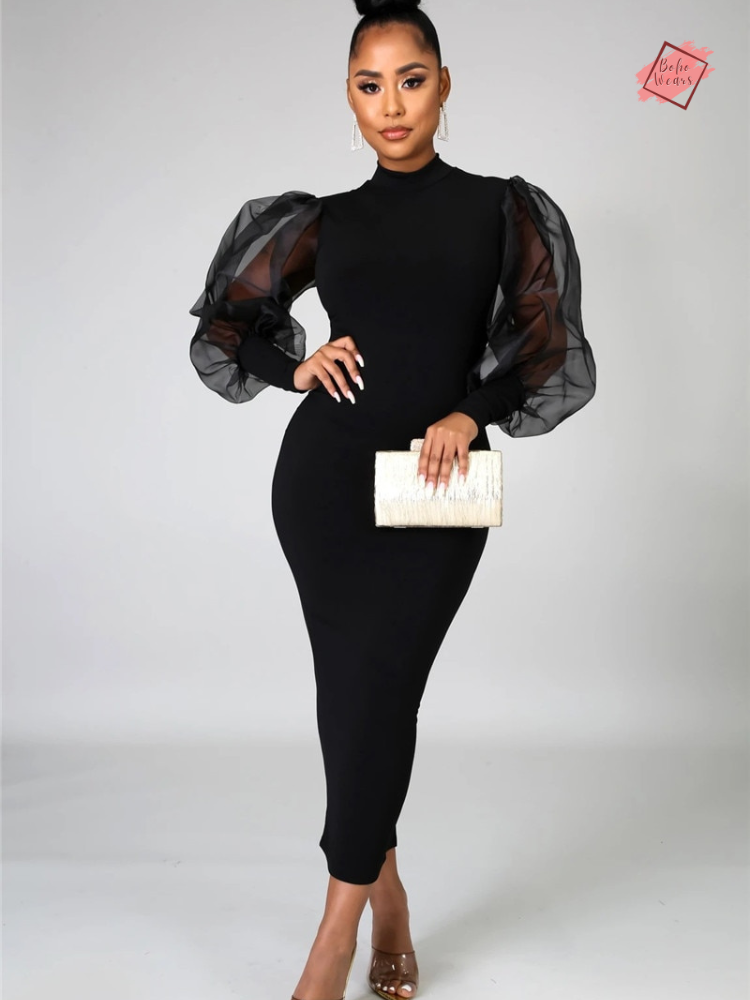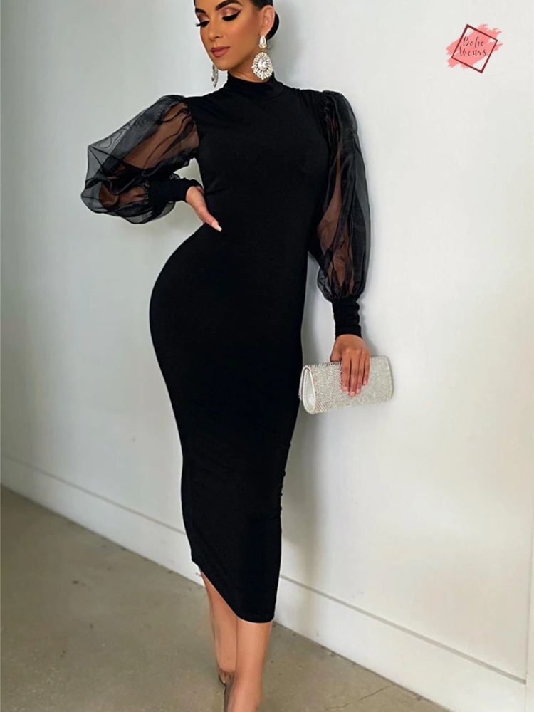 Designed with a turtleneck neckline and full-length puff sleeves, this dress exudes sophistication and drama. Its body-hugging sheath silhouette and back split provide both style and comfort, while the full-length zipper ensures a secure fit.