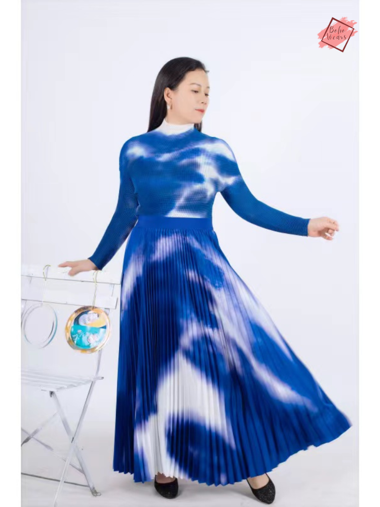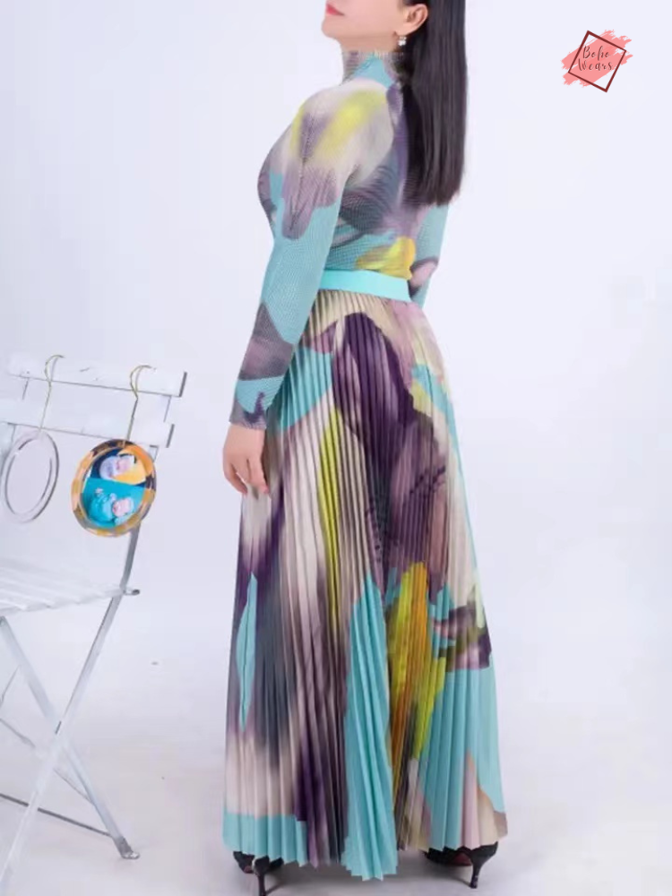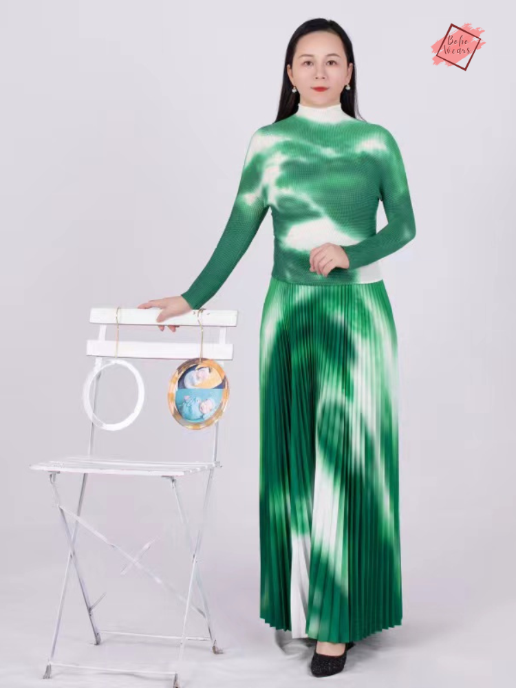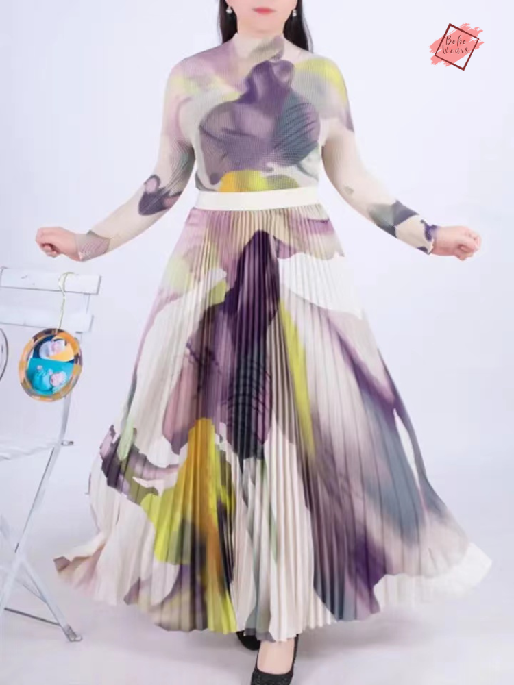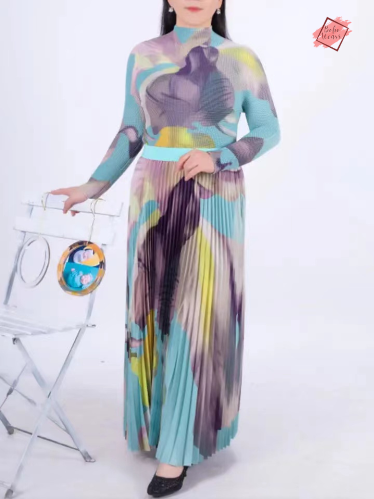 Spring Summer Women's Miyake Pleated Suit - Stylish 2-Piece Set with Printed Top & Skirt