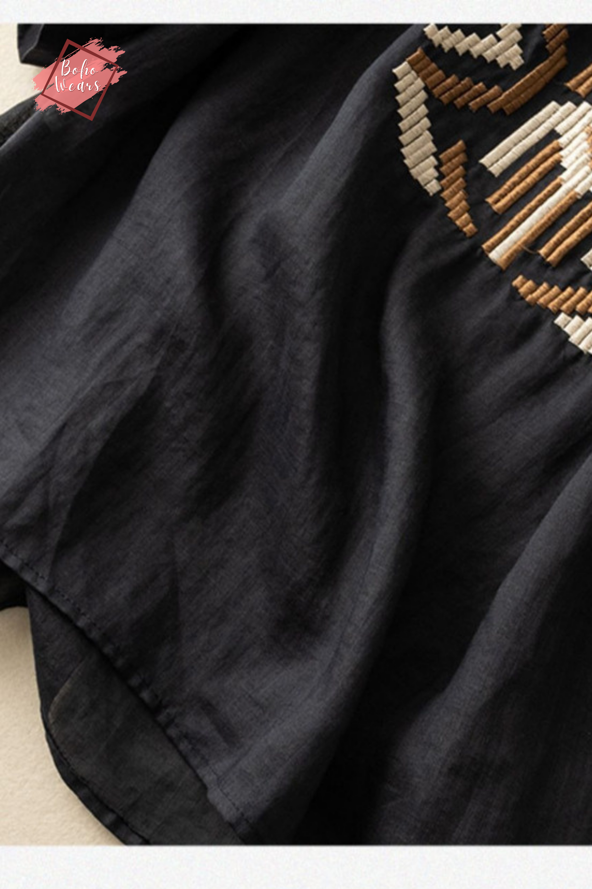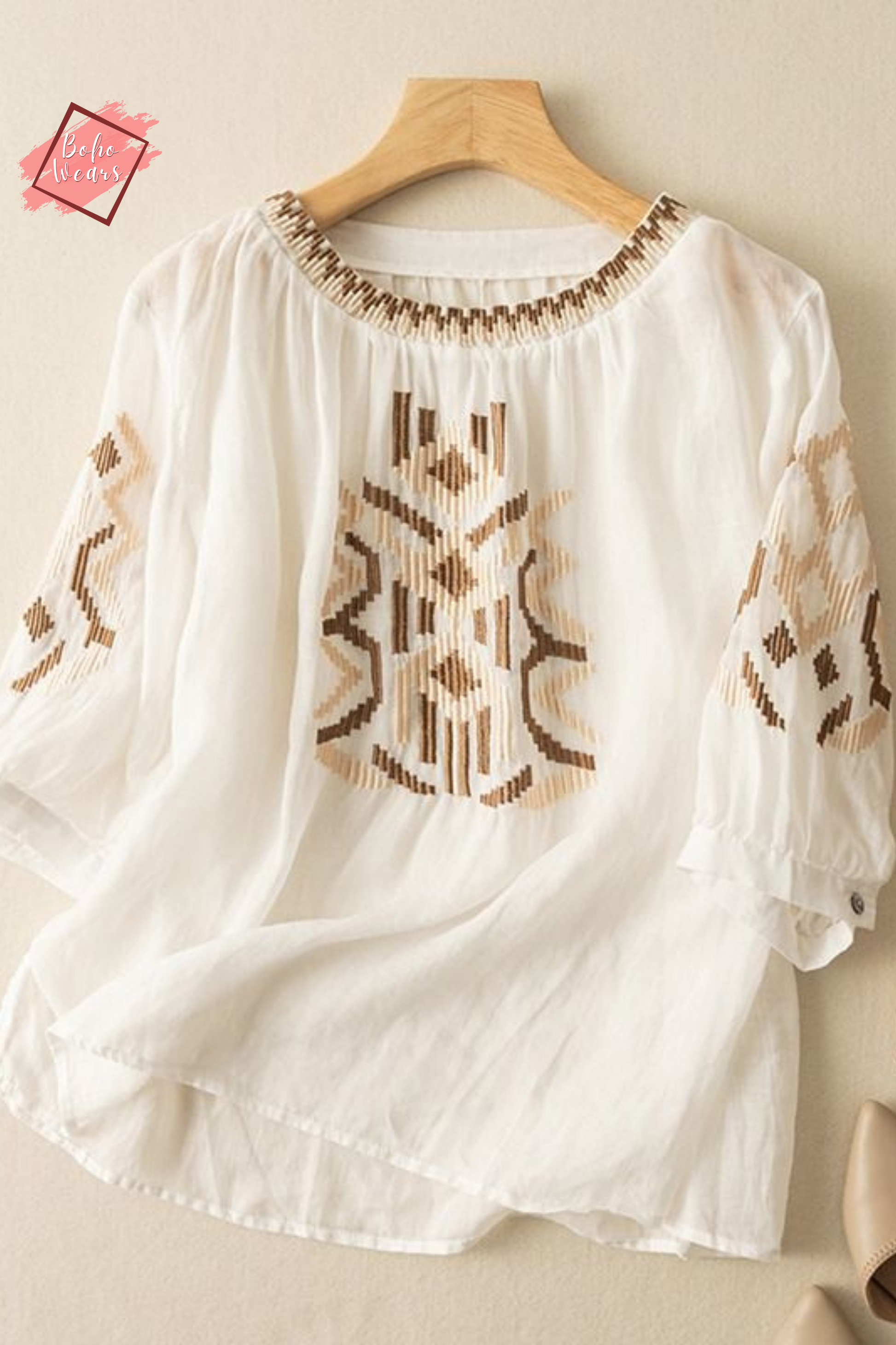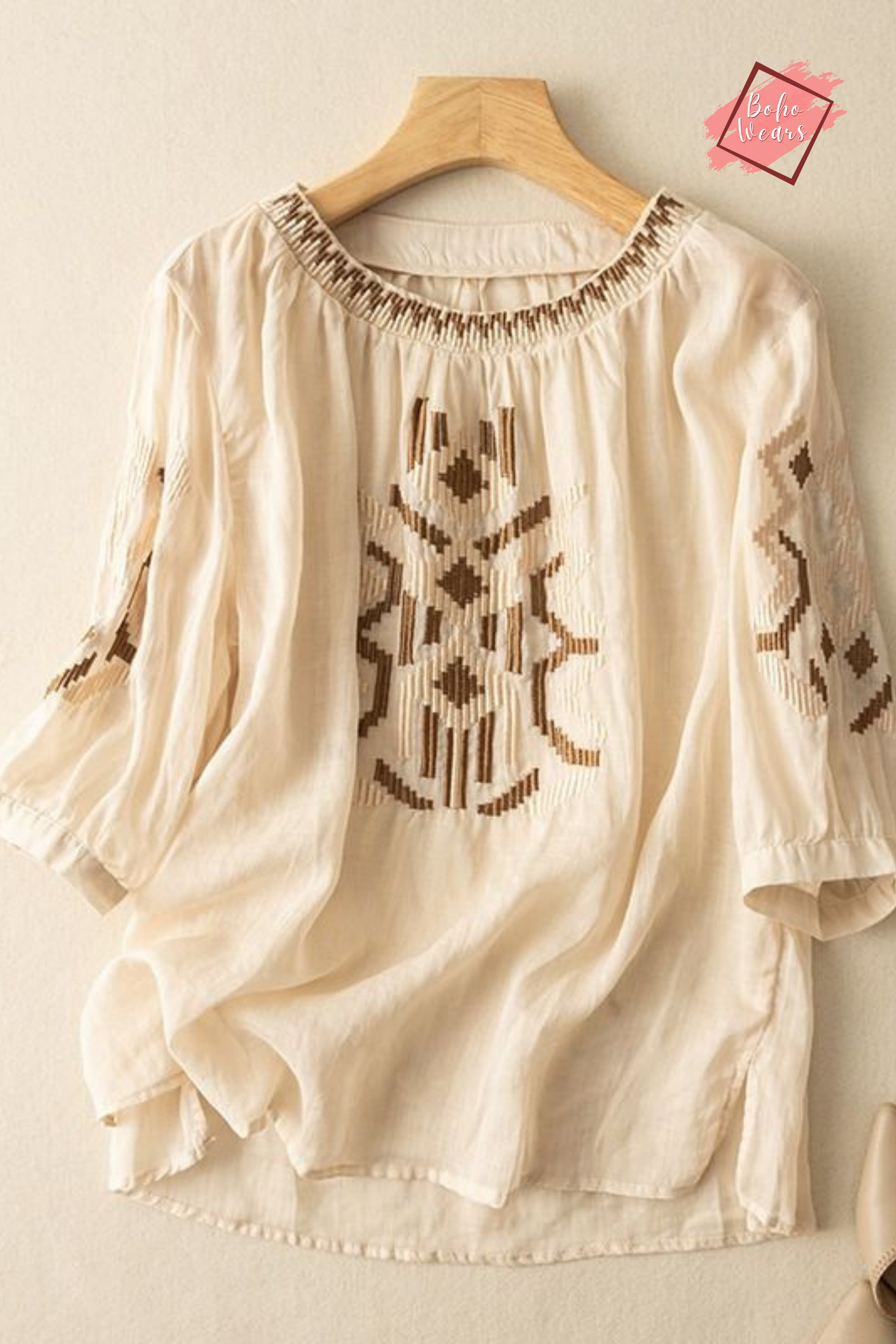 Introducing our Women's Fashionable Slimming Cotton and Linen Embroidered Crew Neck Top, a beautifully crafted garment that effortlessly combines style and comfort. Made from a blend of soft cotton and linen fabric, this top is designed to provide a cozy and breathable feel throughout the day.