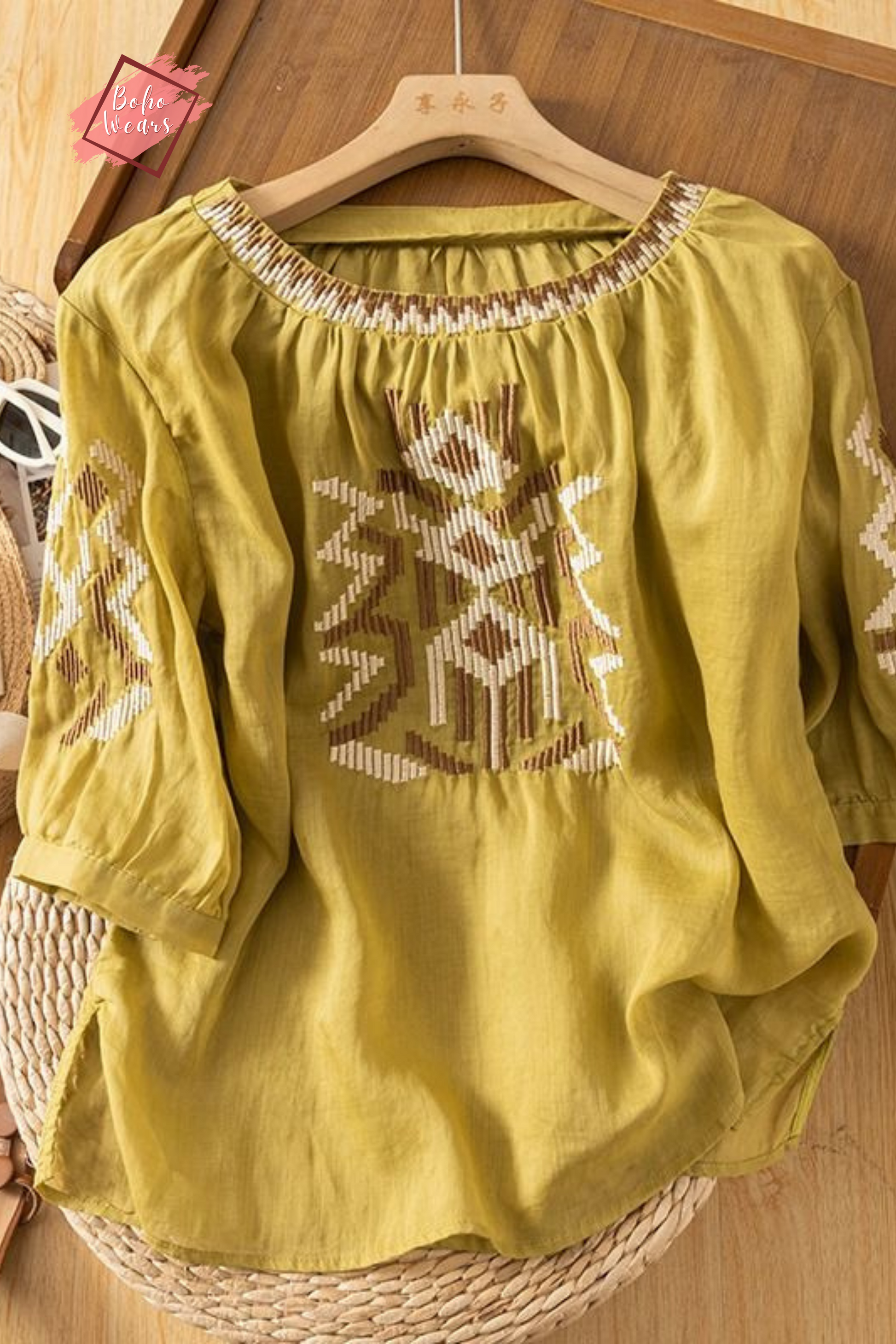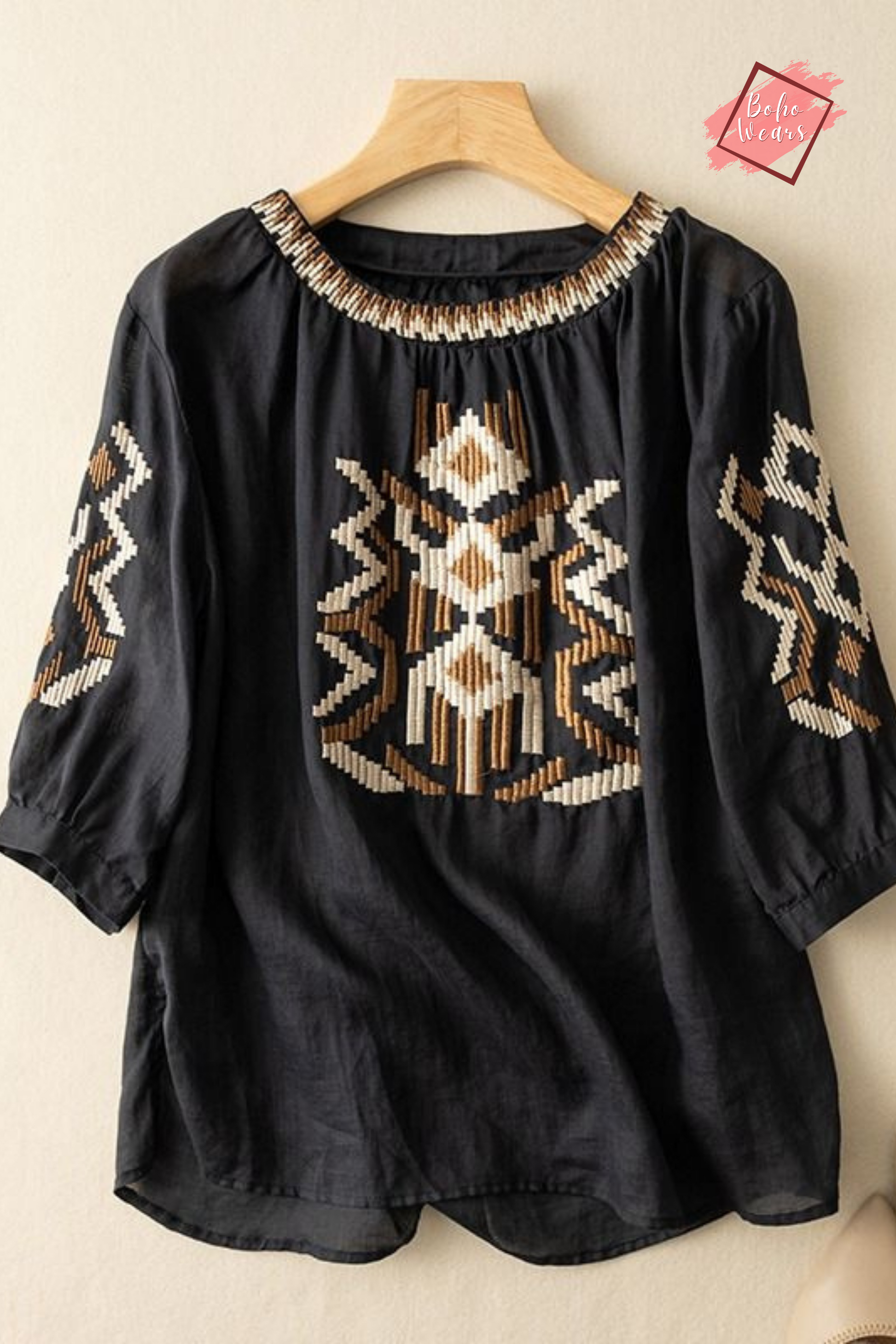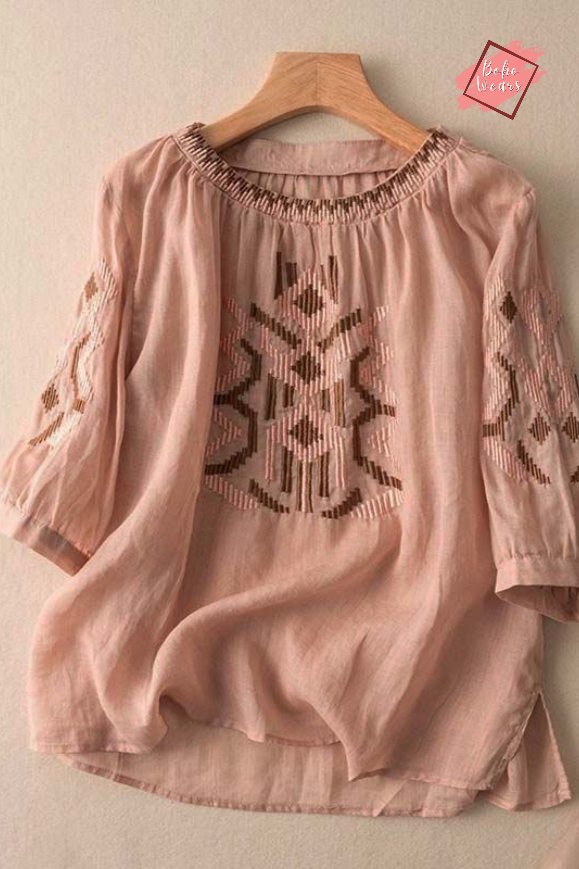 Introducing our Women's Fashionable Slimming Cotton and Linen Embroidered Crew Neck Top, a beautifully crafted garment that effortlessly combines style and comfort. Made from a blend of soft cotton and linen fabric, this top is designed to provide a cozy and breathable feel throughout the day.