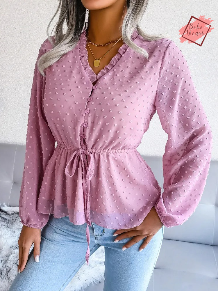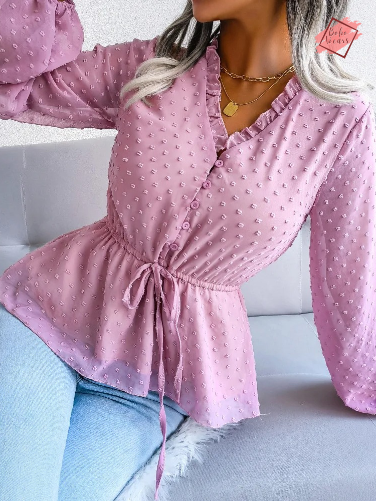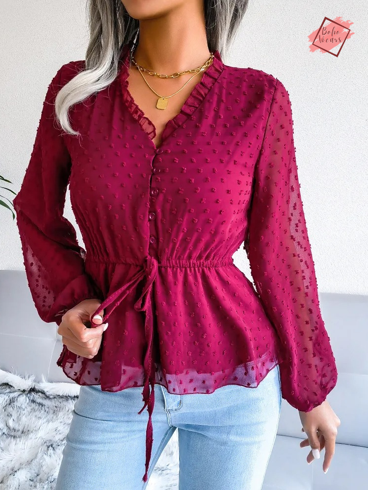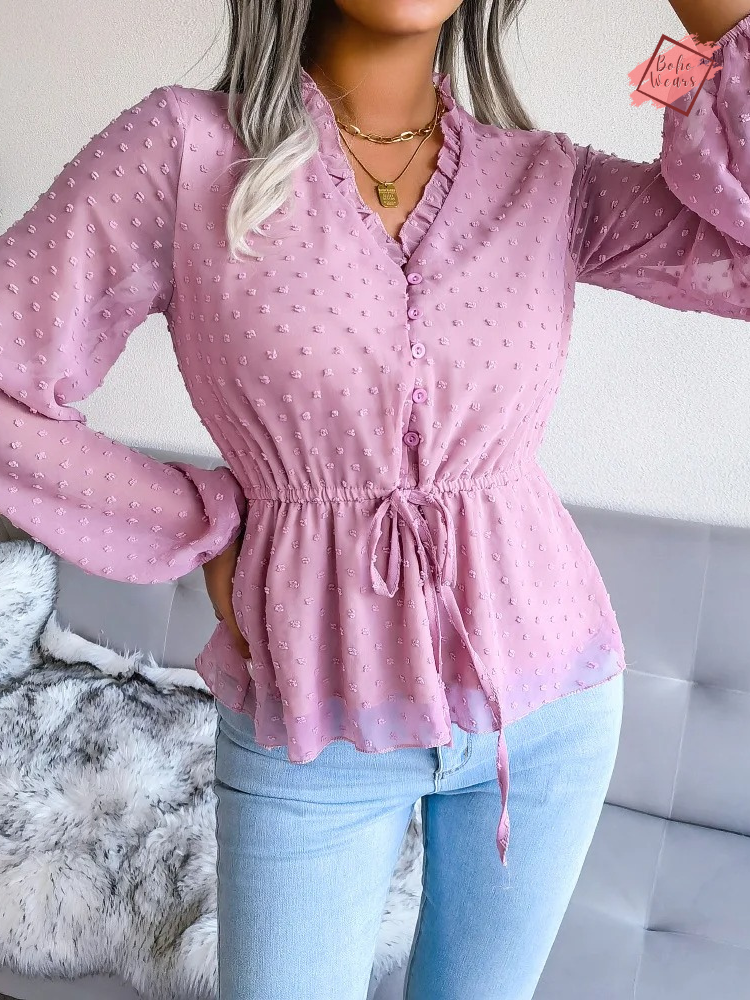 Spring/Summer Women's V-Neck Blouse - Lantern Long Sleeve, Solid Color with Waist Button Detail