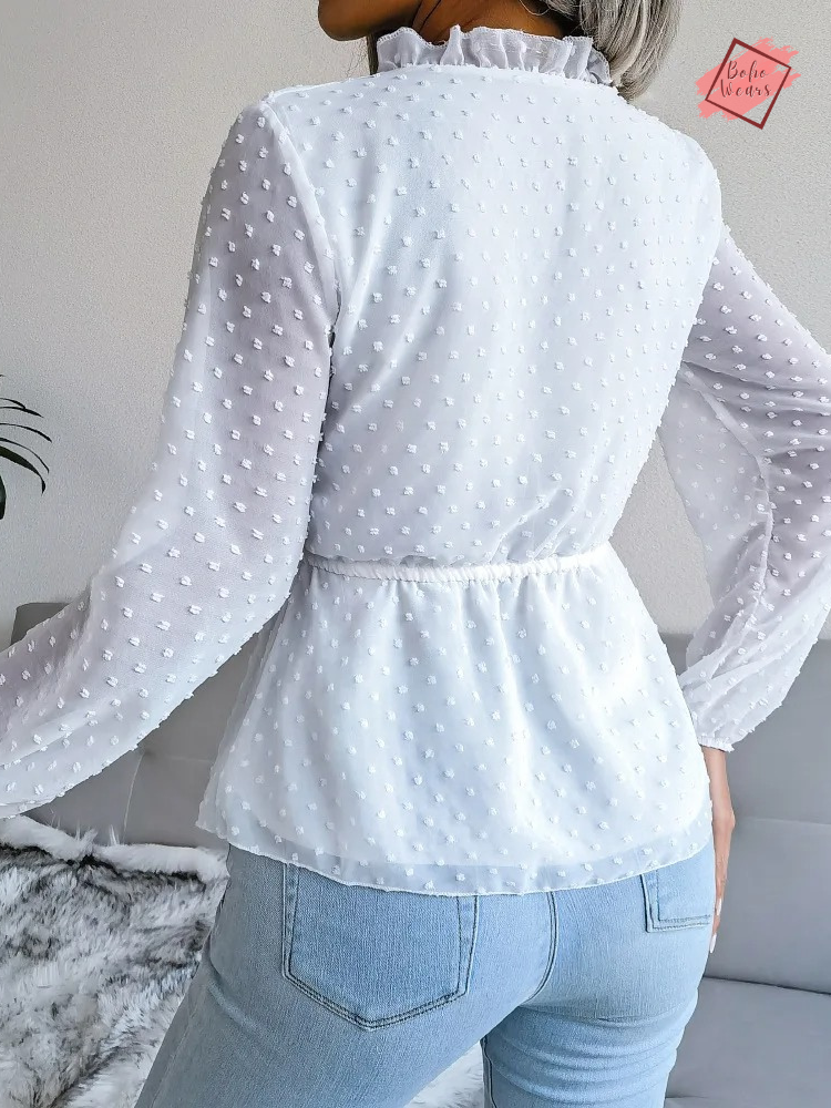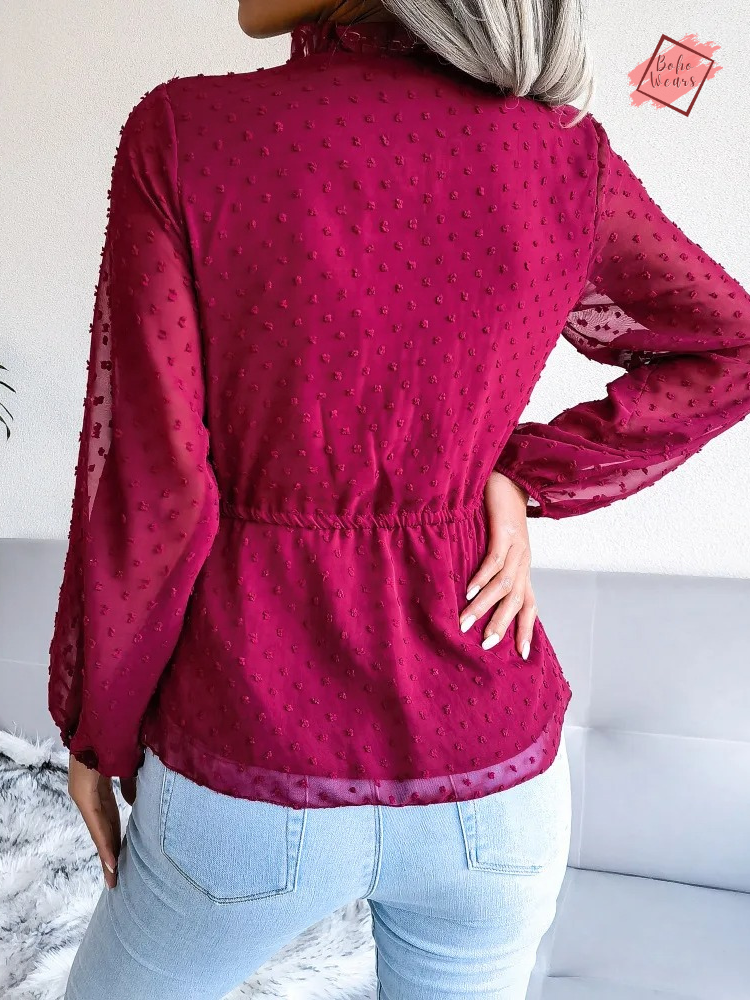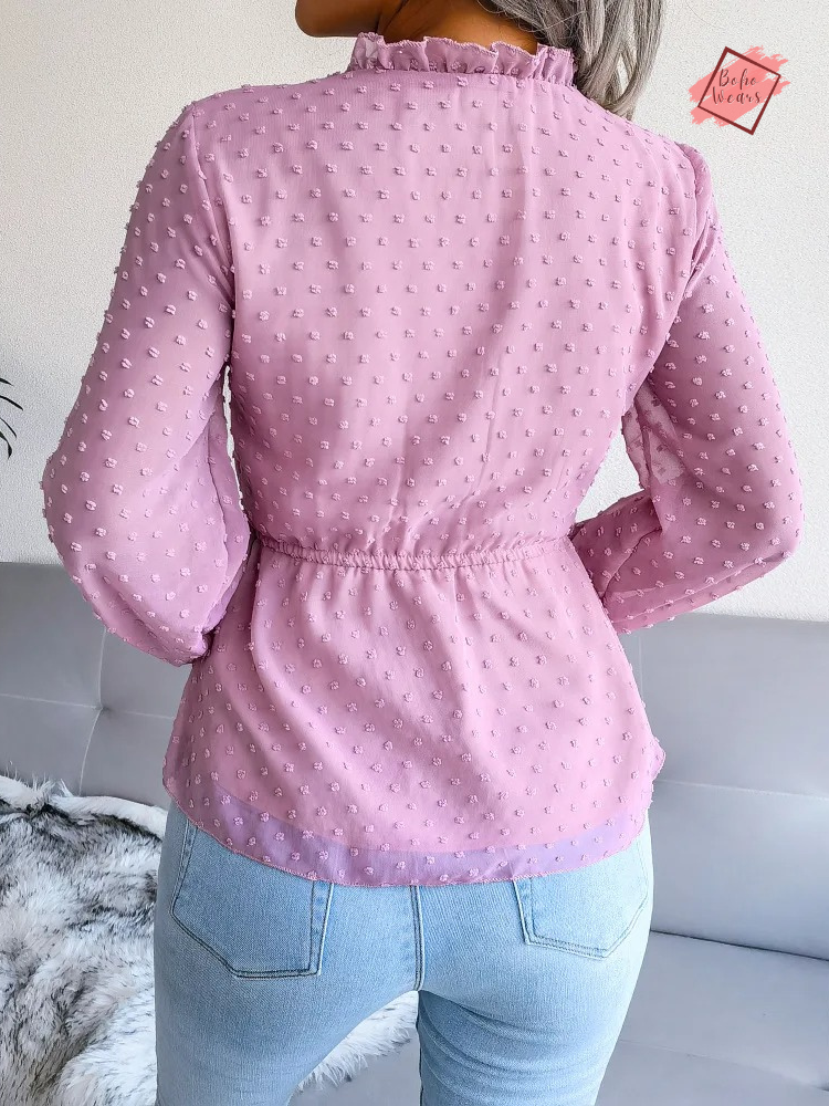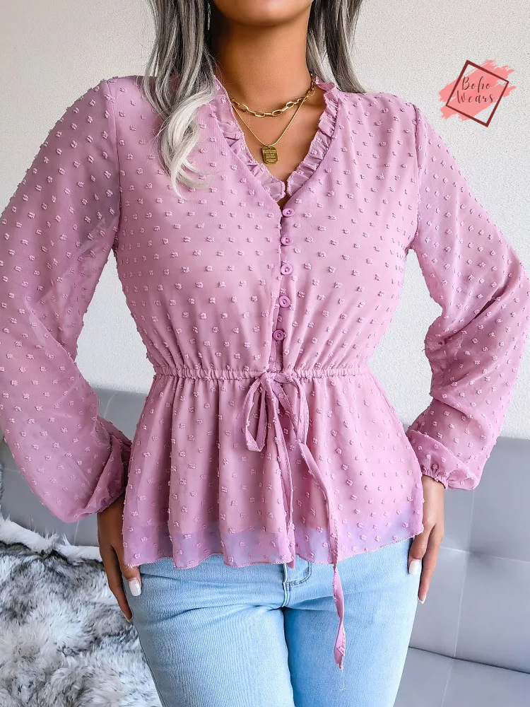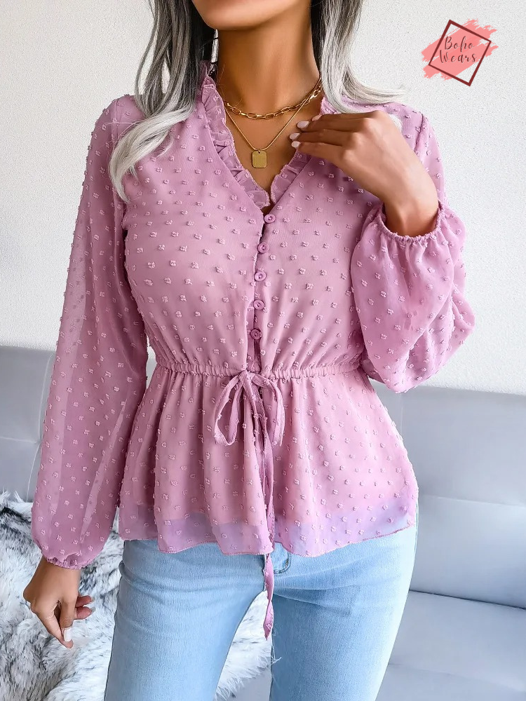 Spring/Summer Women's V-Neck Blouse - Lantern Long Sleeve, Solid Color with Waist Button Detail