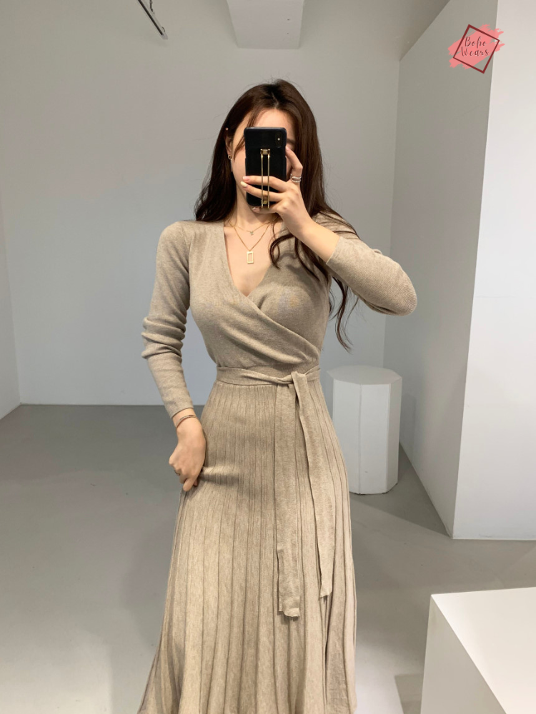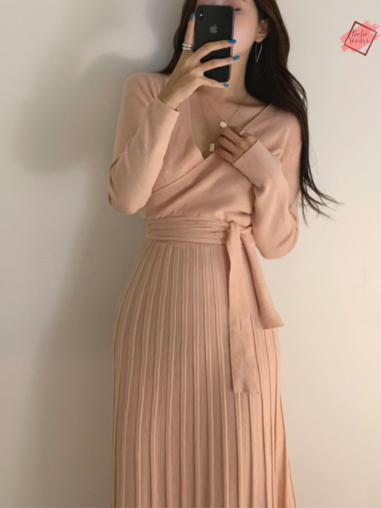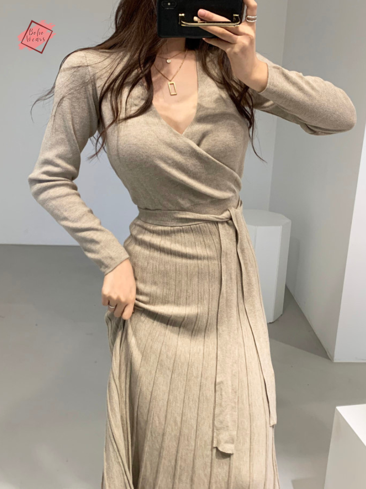 Stretchy Knitted Bodycon Dress for Women | V-Neck, Long Sleeve Winter Vestidos | Chic Korean Style