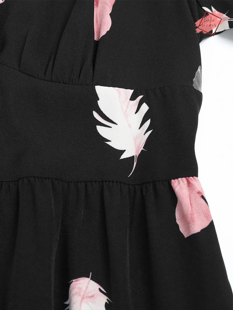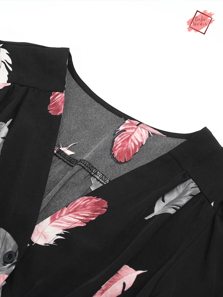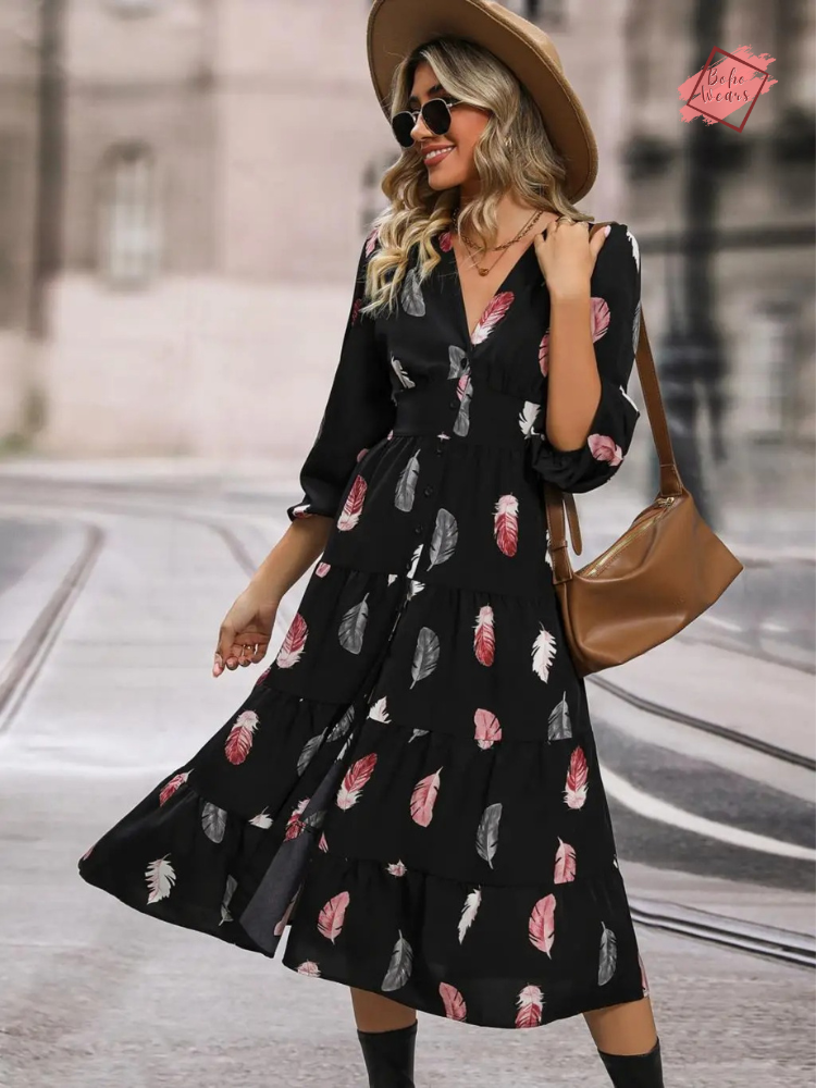Stylish Women's Autumn Winter Print Dress - Casual Single Breasted, Short Sleeve, V Neck