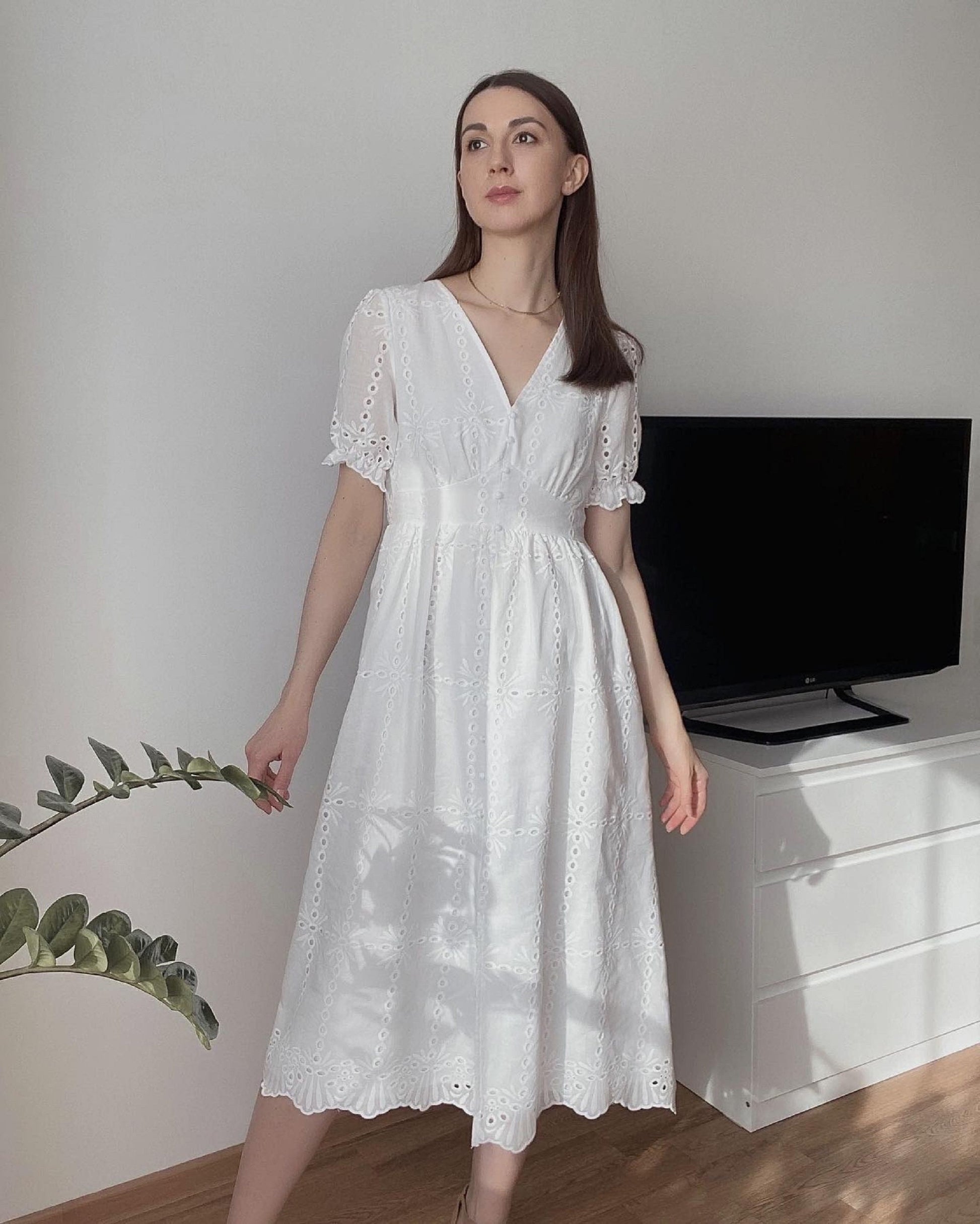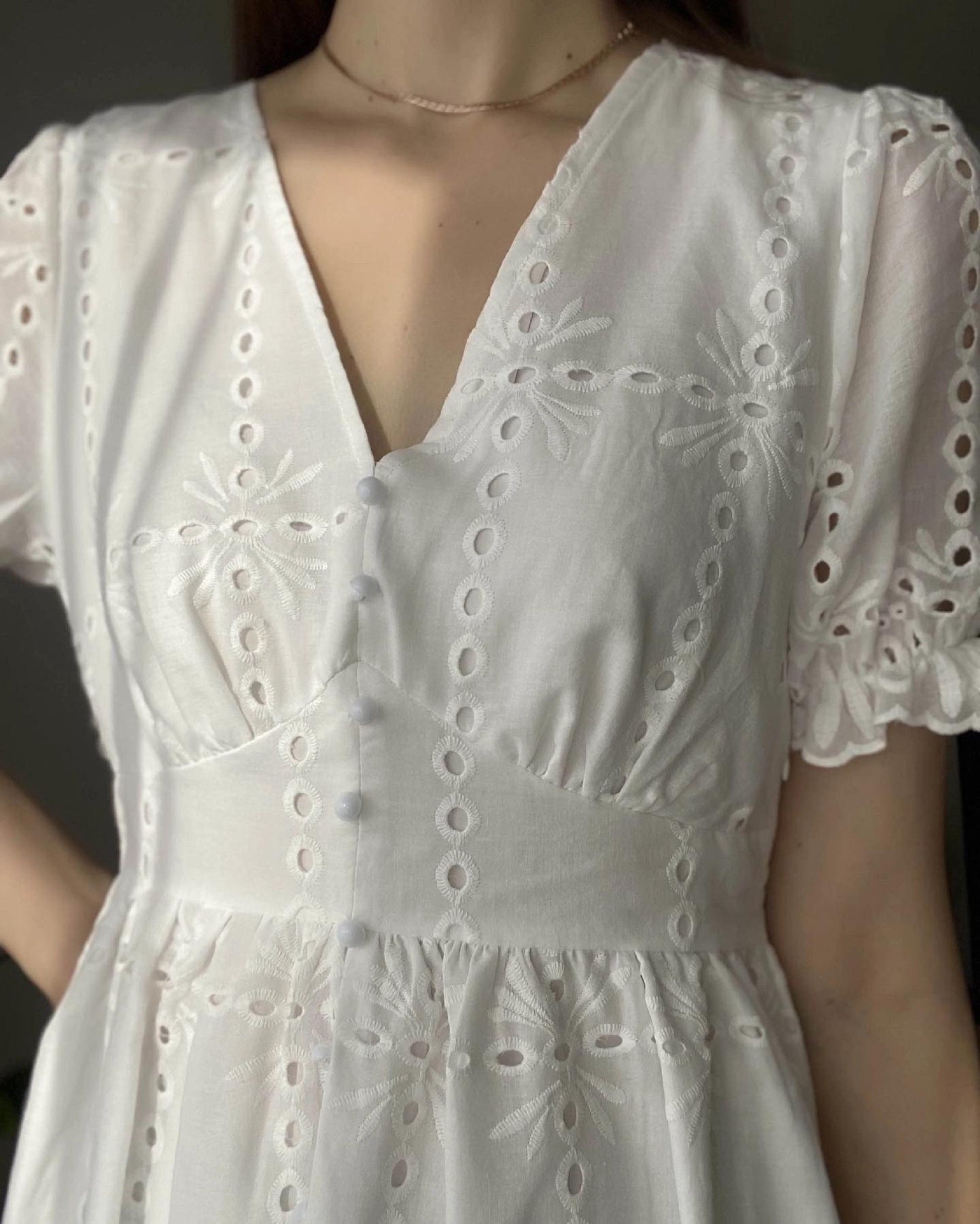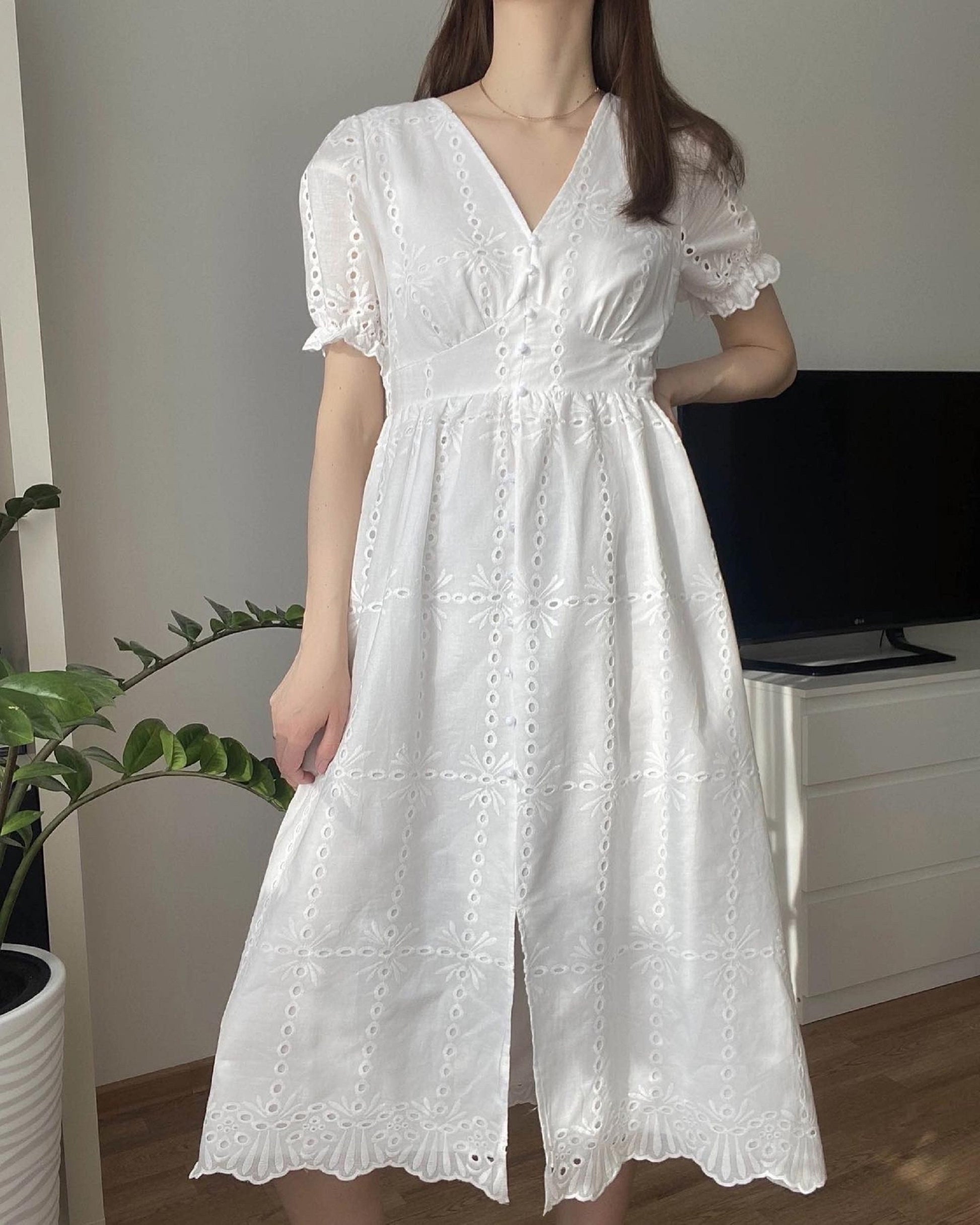 Summer Cotton Dress, Hollow out Midi Dress, Women Puff Short Sleeve Dress, Summer Split Front Dress