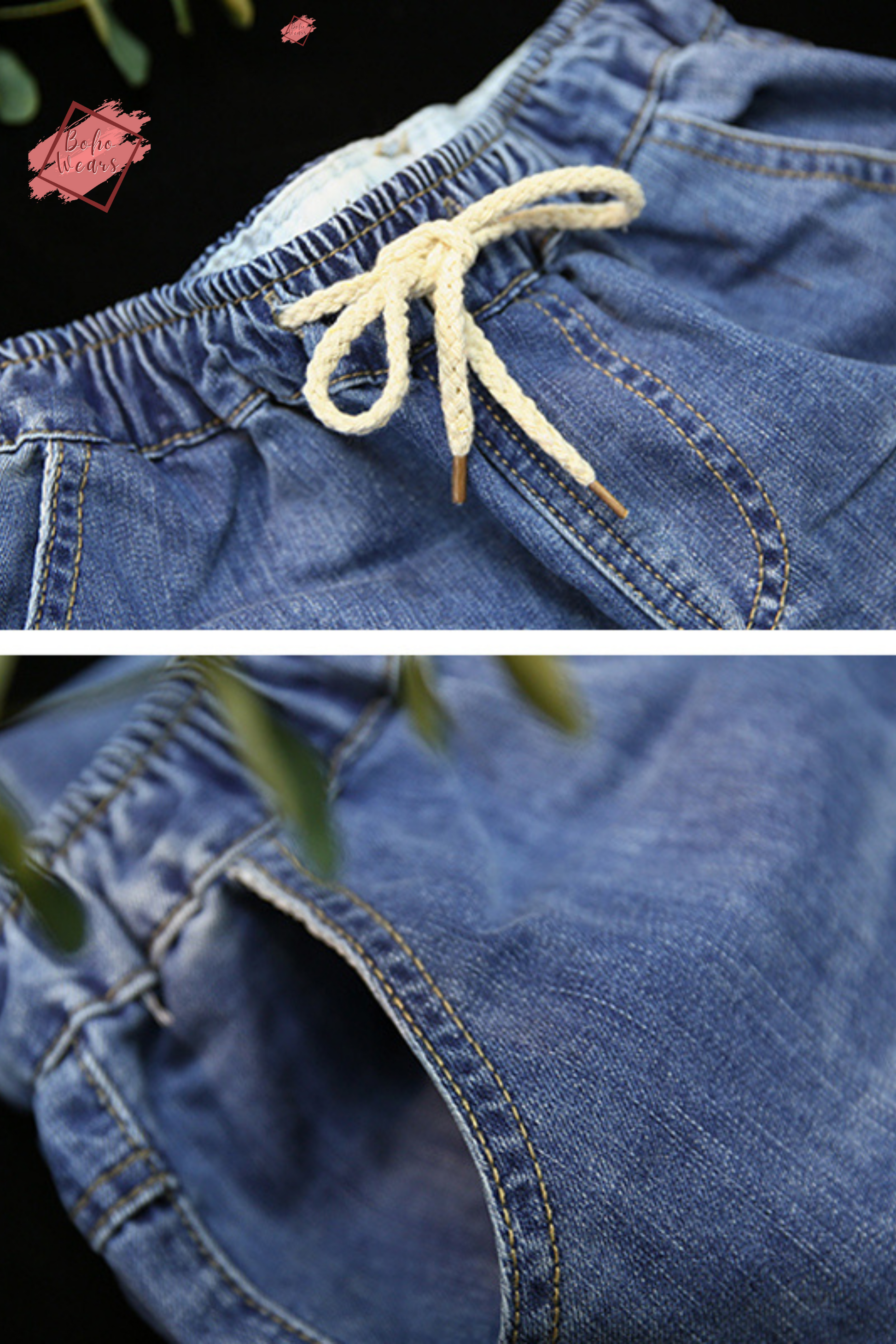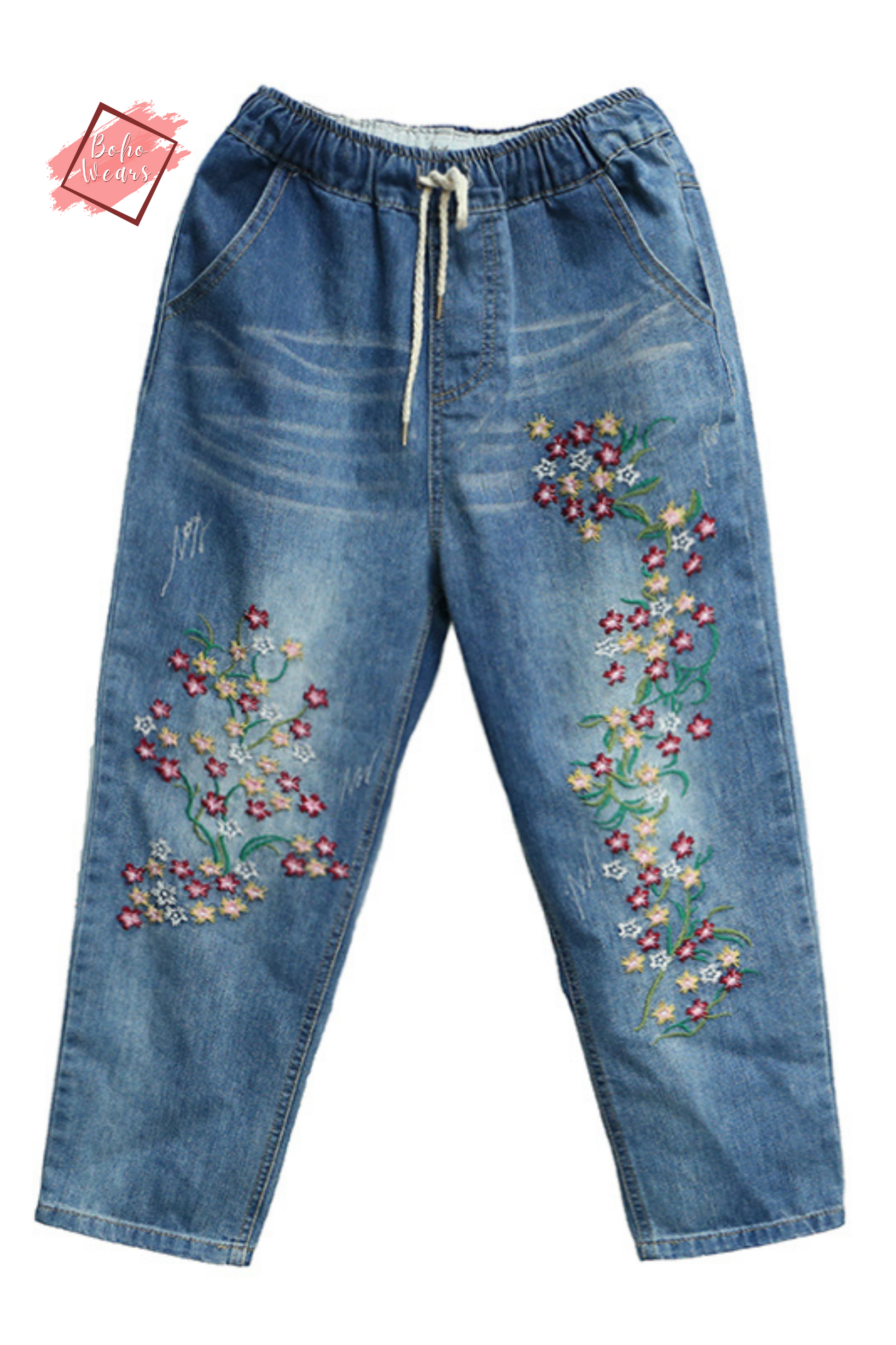 Constructed from premium denim, these mid-waist capris pants are adorned with a stunning floral embroidery that evokes a sense of nostalgia for vintage style. The relaxed, baggy fit ensures absolute comfort while lending a trendy harem style silhouette that suits a variety of body types.