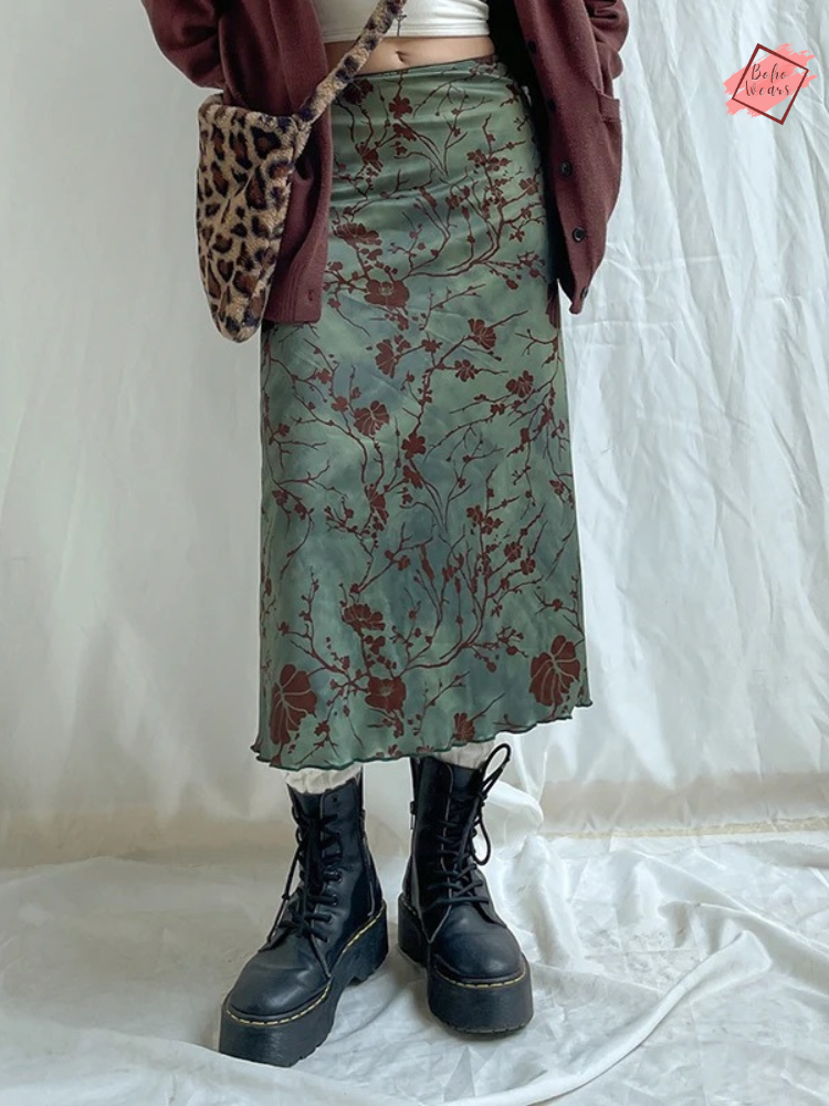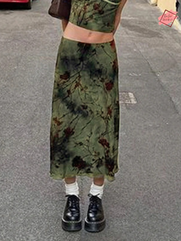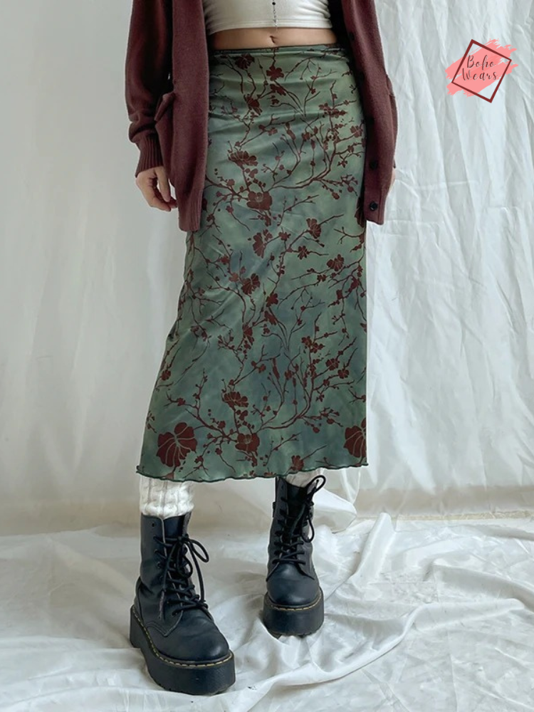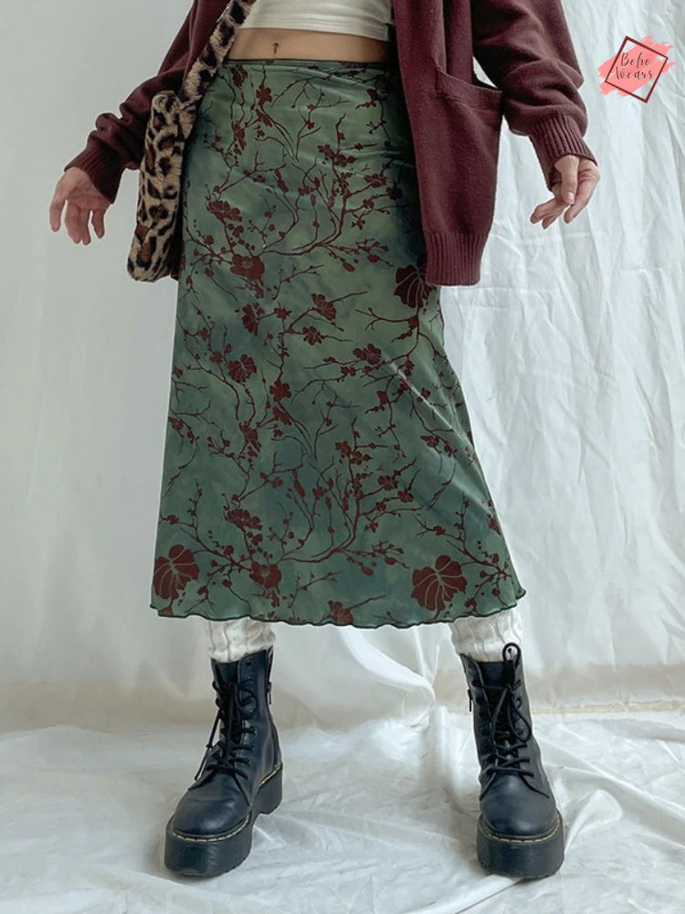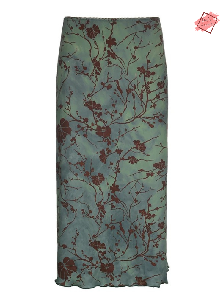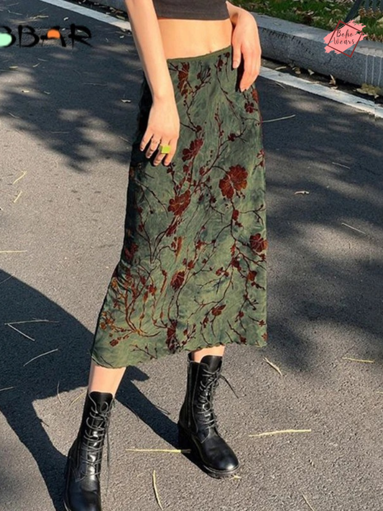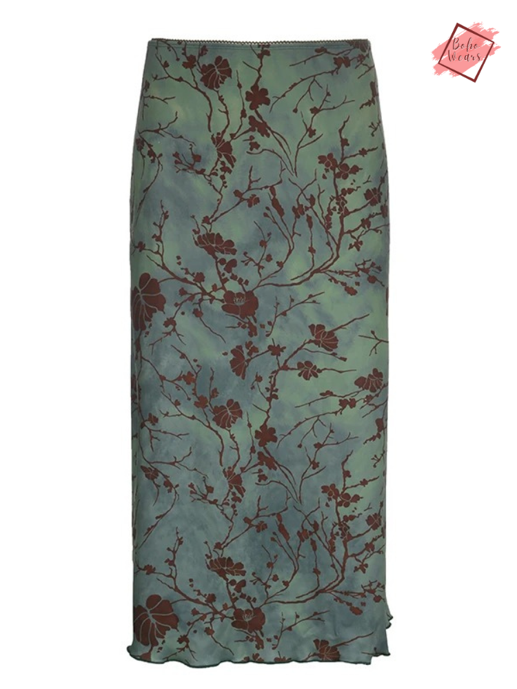 Vintage Floral Print Low Rise Straight Midi Skirt for Women – Boho Chic Long Skirt