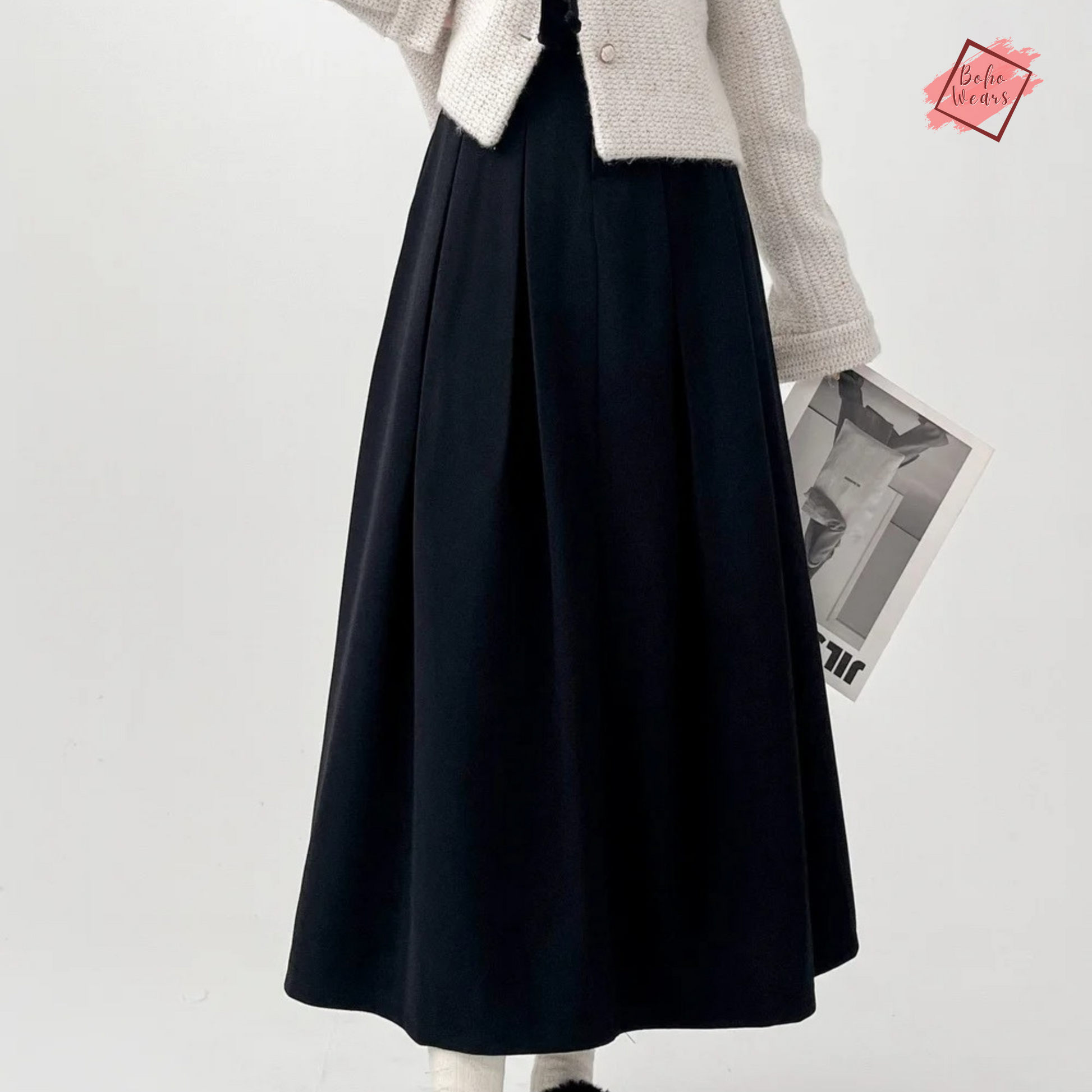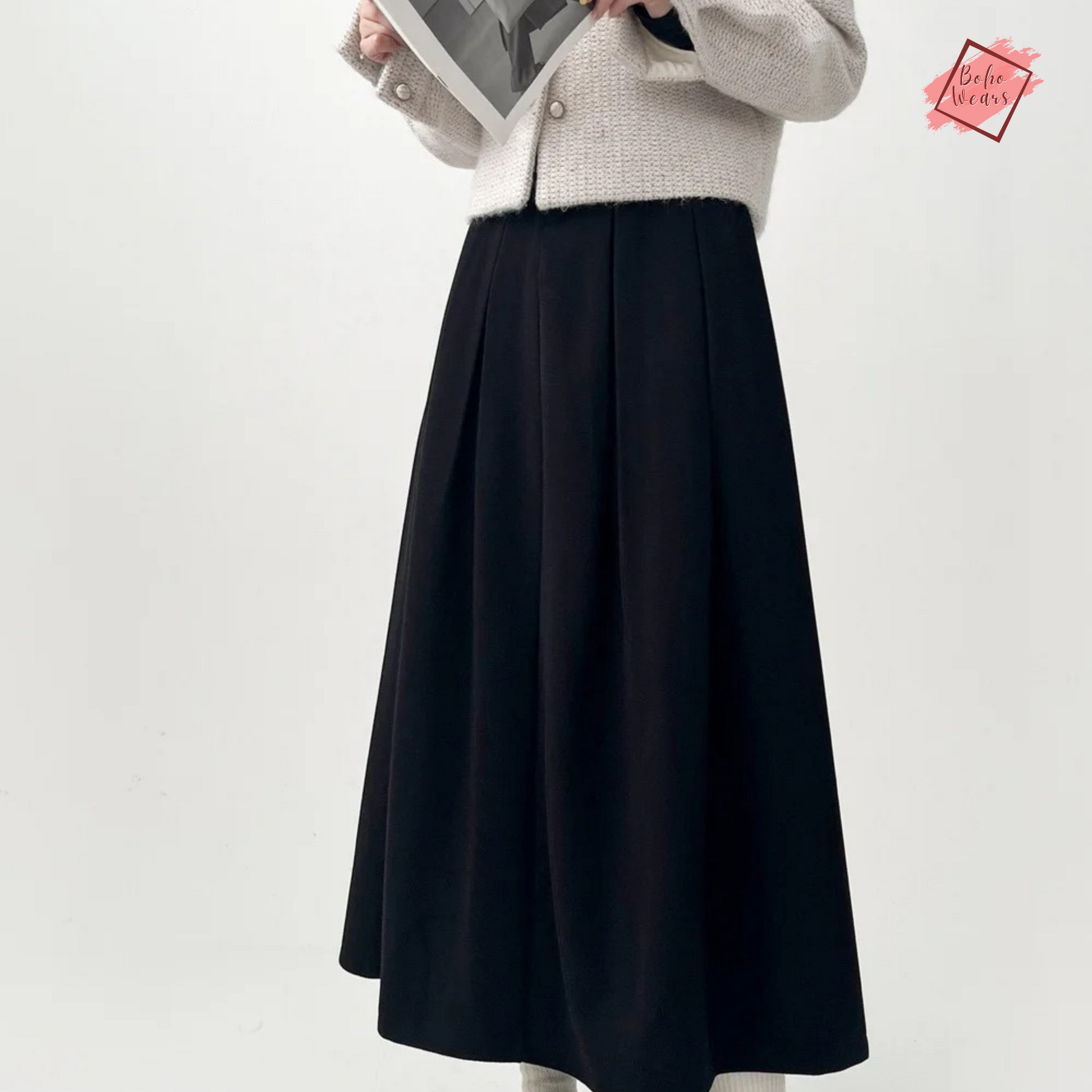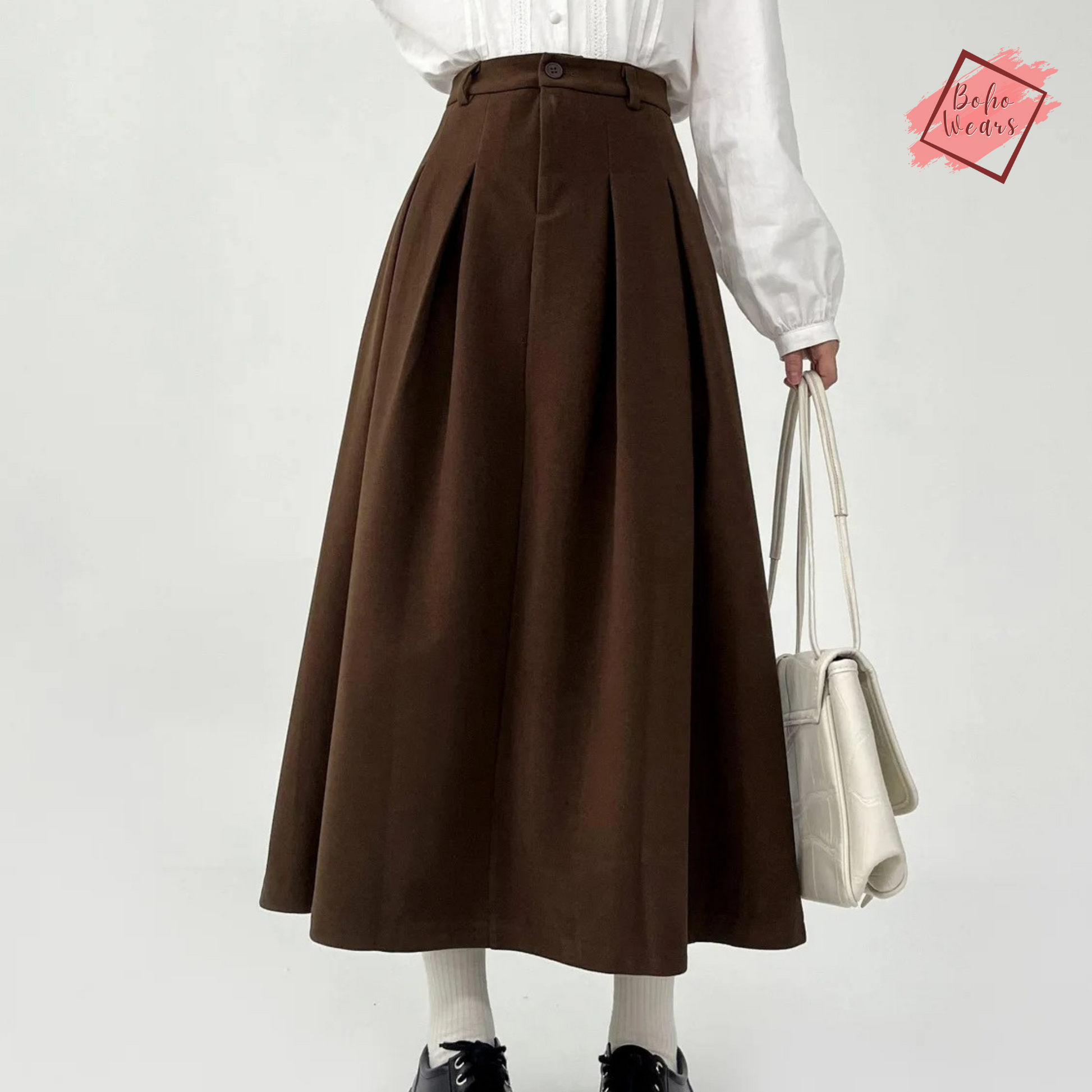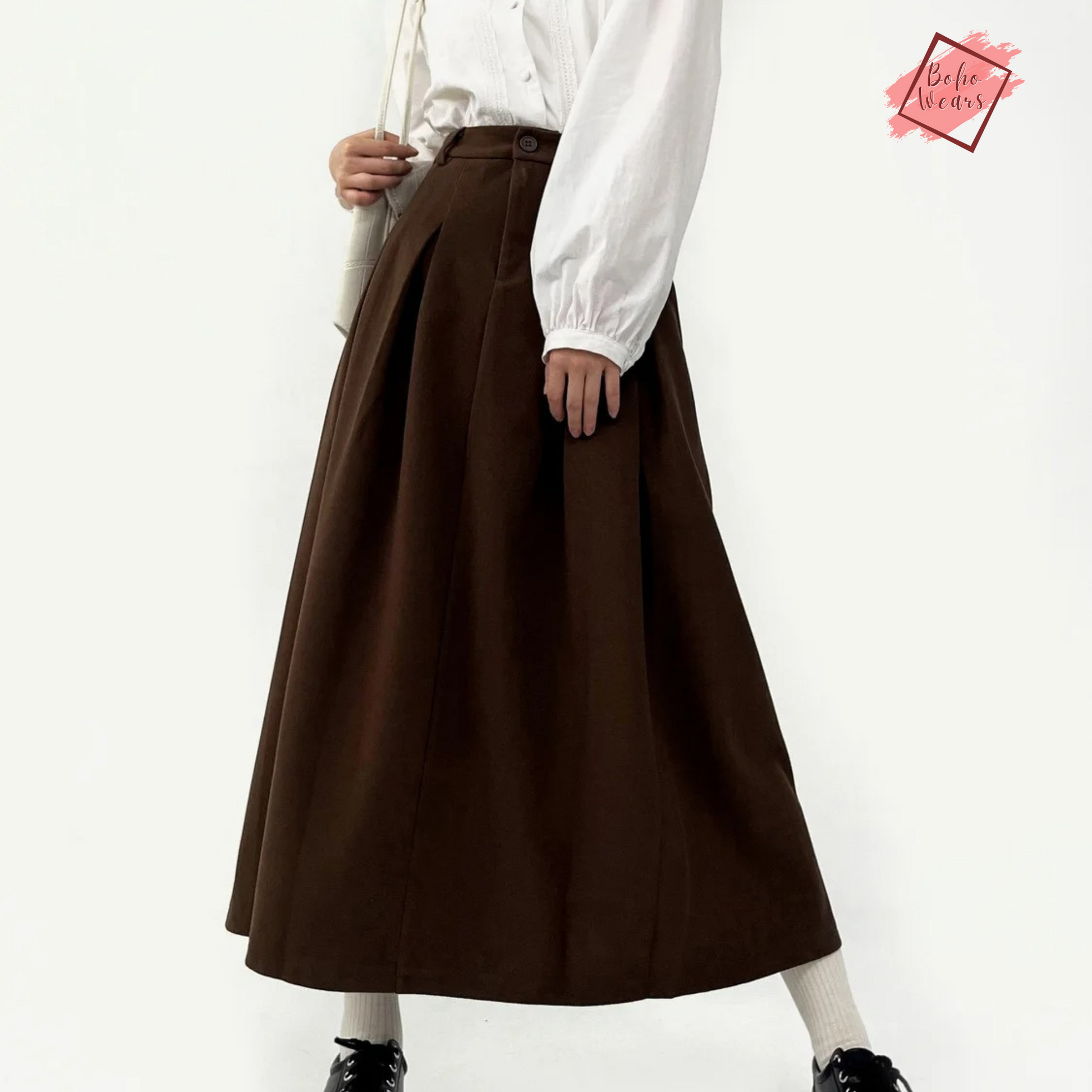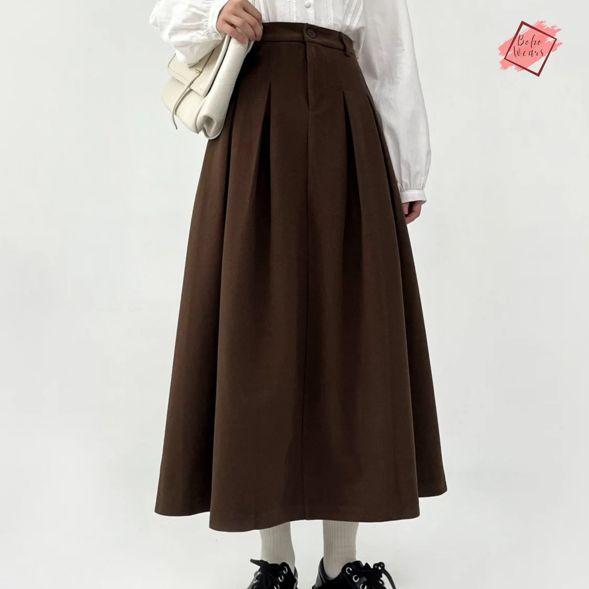 Embrace the allure of vintage Korean fashion with our Long Skirt Women. This casual midi skirt features a high-waist empire silhouette, Japanese pleats, and charming folds for added decoration. The solid pattern, slight stretch, and loose fit make it both comfortable and stylish.