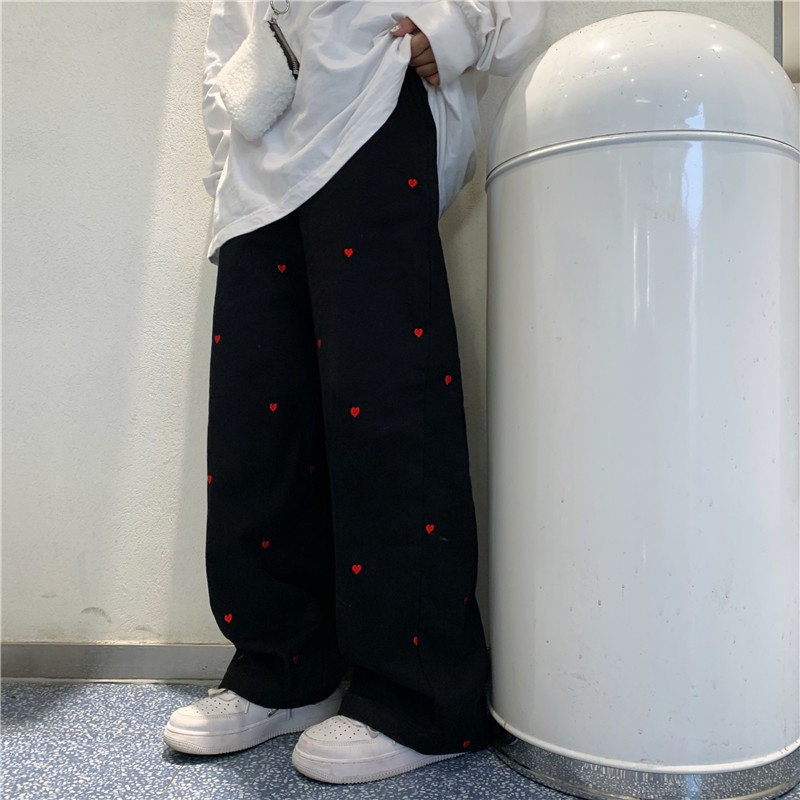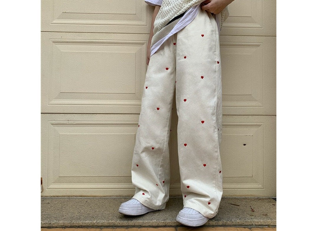 White Pants Trouser for Women, Pockets Harajuku Pants, Heart Design Street Wear Pants