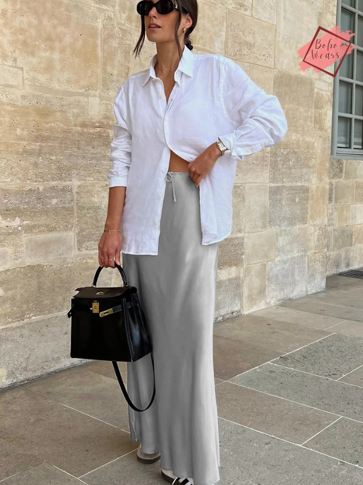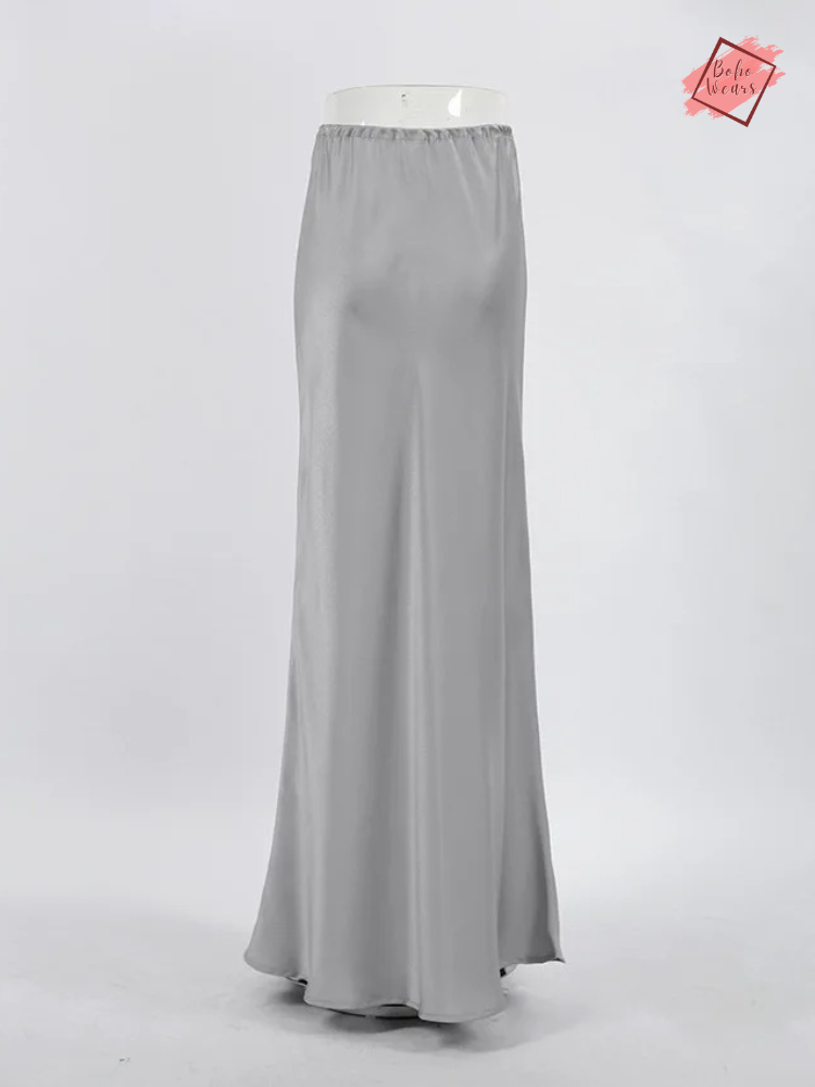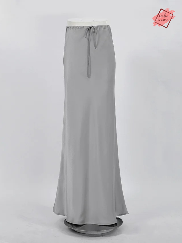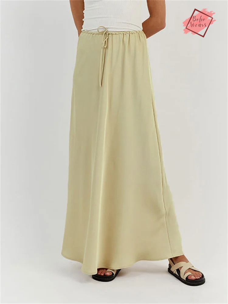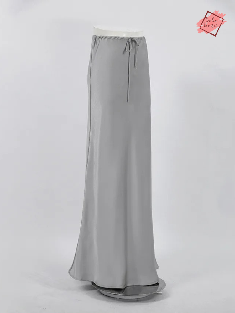 Women's Elegant High Waist Maxi Skirt: Casual Solid Satin with Lace-Up Detail and Patchwork Design