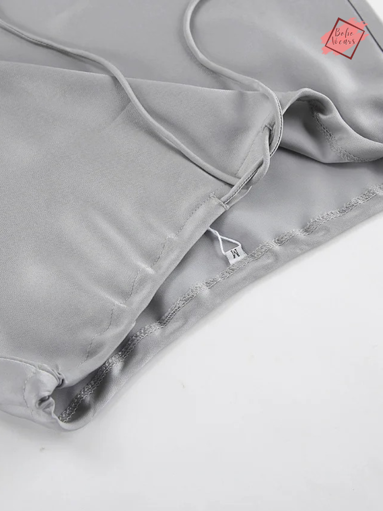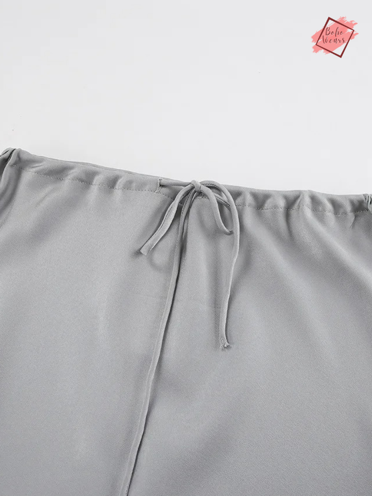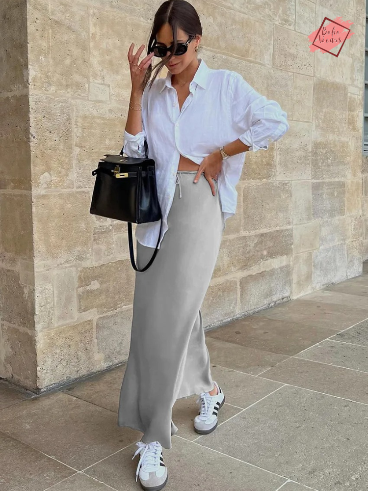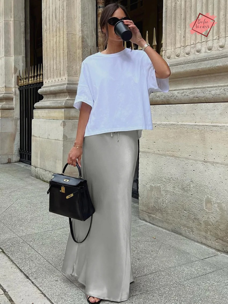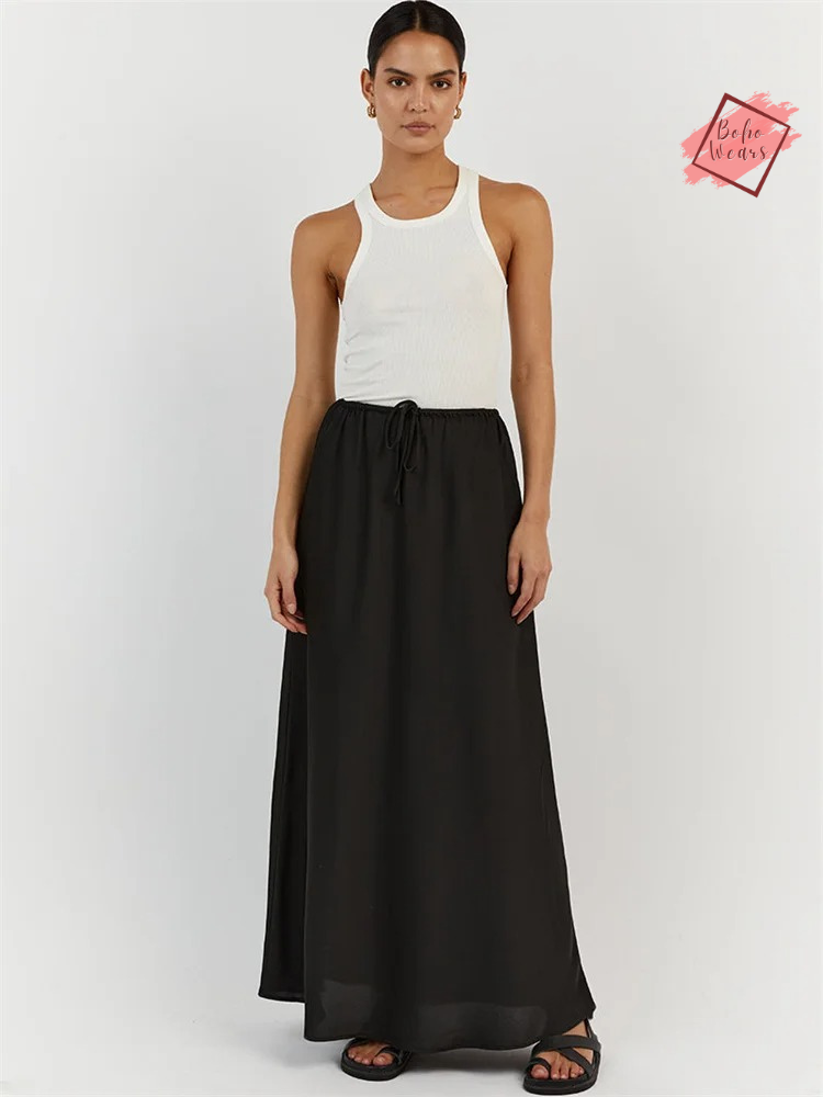 Women's Elegant High Waist Maxi Skirt: Casual Solid Satin with Lace-Up Detail and Patchwork Design